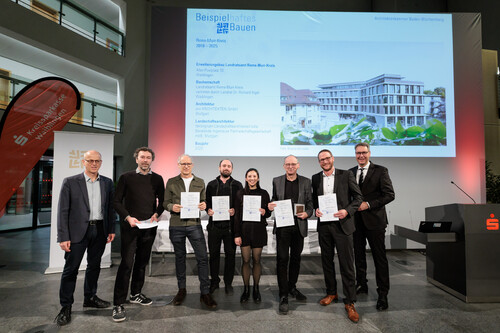 Nachdem im Juli bekannt wurde, dass unser Neubau für das Landratsamt Waiblingen beim Beispielhaften Bauen aus insgesamt 89 eingereichten Projekten ausgezeichnet wurde, wurde die Ehrung nun im feierlichen Rahmen von der Architektenkammer überreicht. Die Jury würdigte insbesondere den strategischen Einsatz von Holz und Recyclingbeton, die Integration von PV-Fassadenelementen sowie die extensive Dachbegrünung. Ergänzt durch ein ganzheitliches Mobilitätskonzept rundet das Projekt laut Jury die beispielhafte Gestaltung ab. In der Kreissparkasse Waiblingen werden die prämierten Objekte bis zum 19. Dezember ausgestellt.
