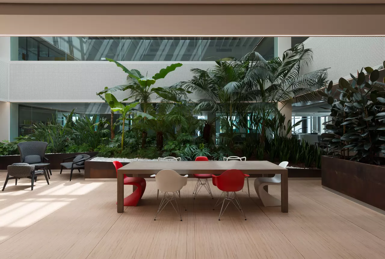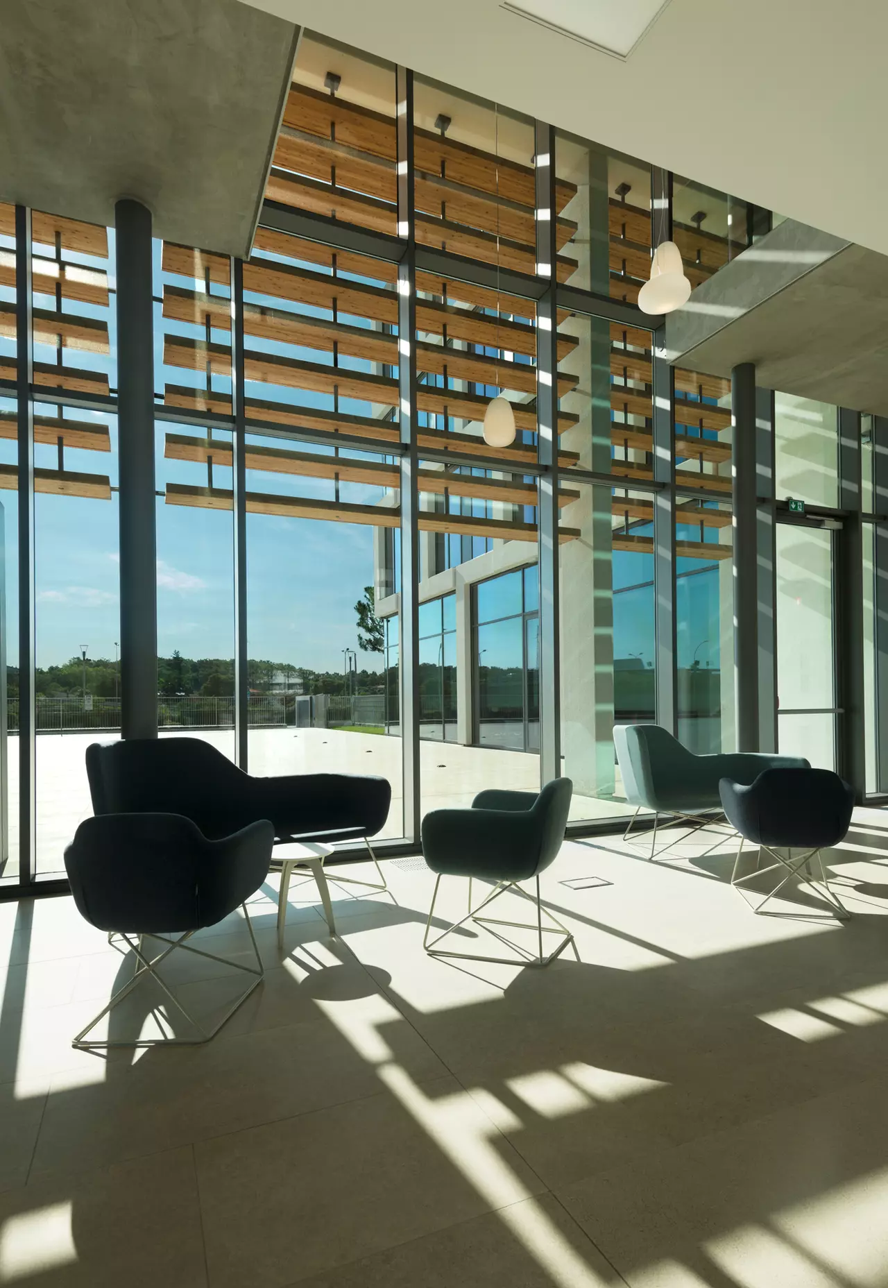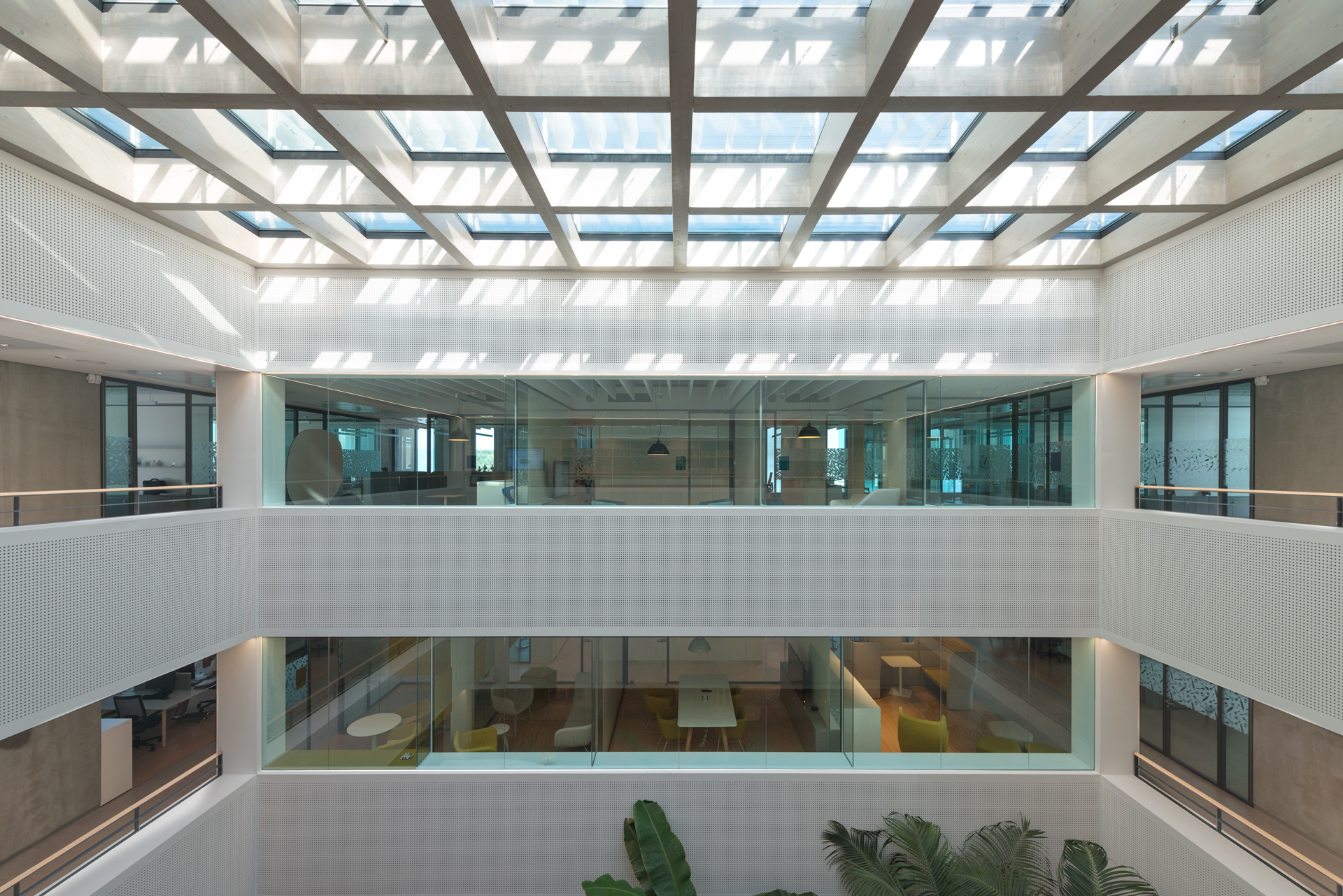 On the upper floors, the workspaces are organised around a central atrium, creating a bright atmosphere and enabling cross-level visual connections.