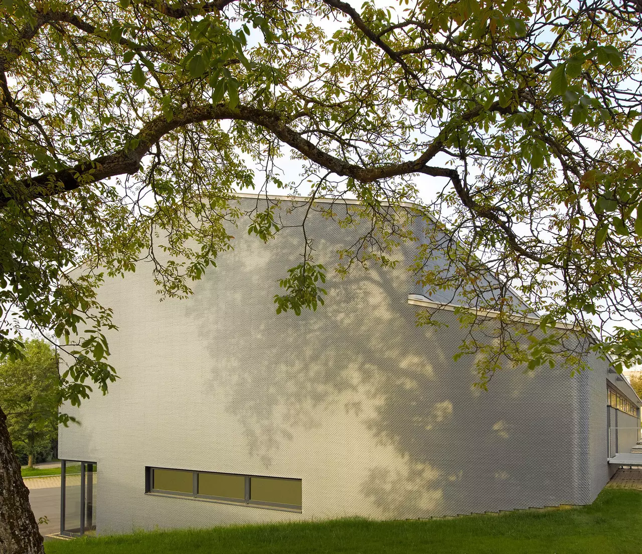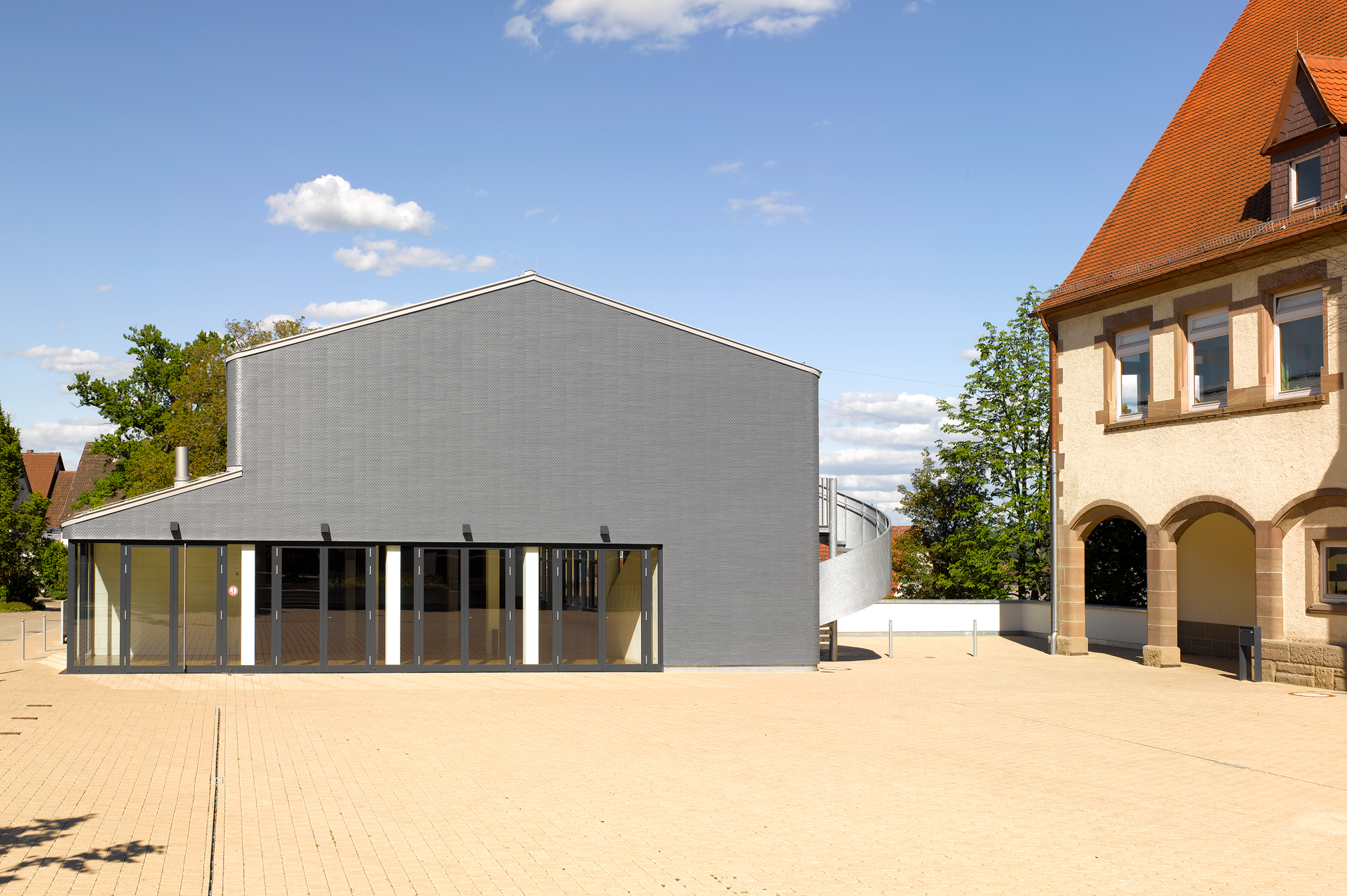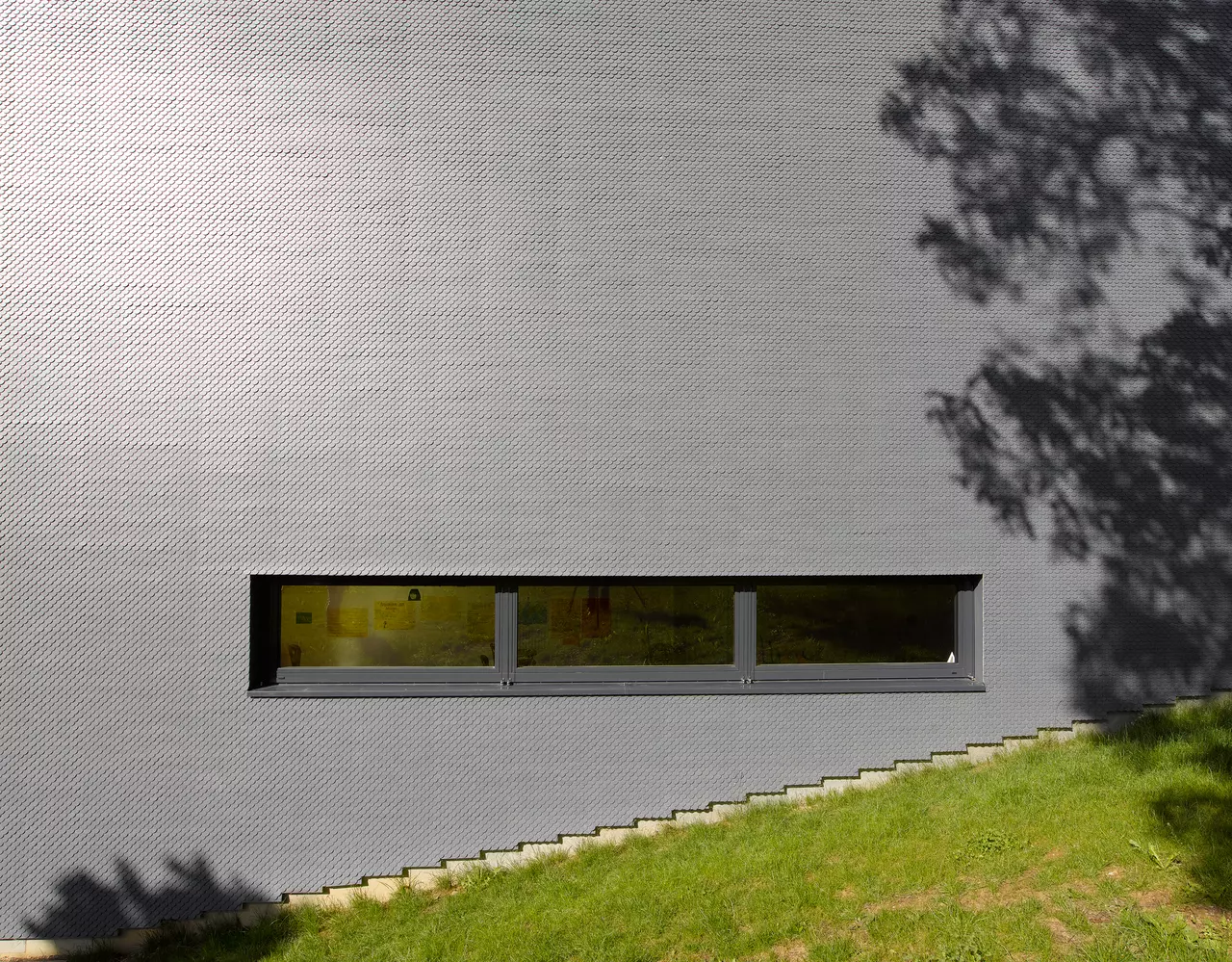 The new festival hall has been constructed on the site of a demolished hall and references the volume of the former building. The detached positioning and reduction of the building’s volume lend the festival hall a powerful presence in the public space. The main entrance is facing the square. The façade, made of fibre cement shingles, wraps around the compact building with rounded corners, resembling a dress. The entrances to the adjacent schools with their corresponding schoolyards have been redesigned. A spacious courtyard has been created between the buildings, which can also be used as a festival square.