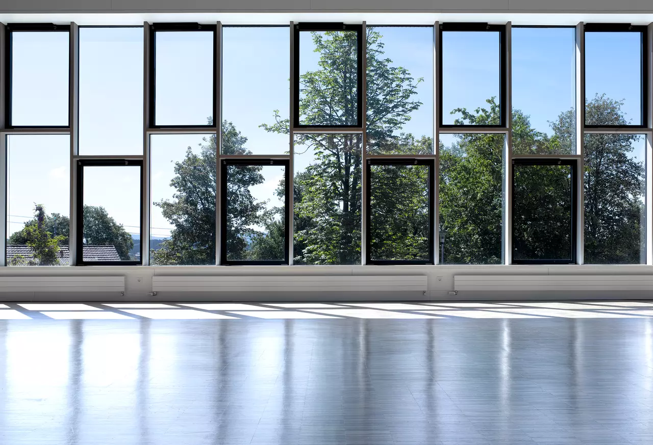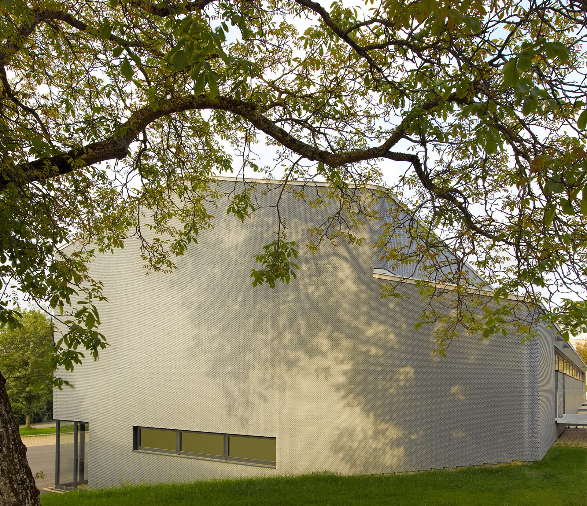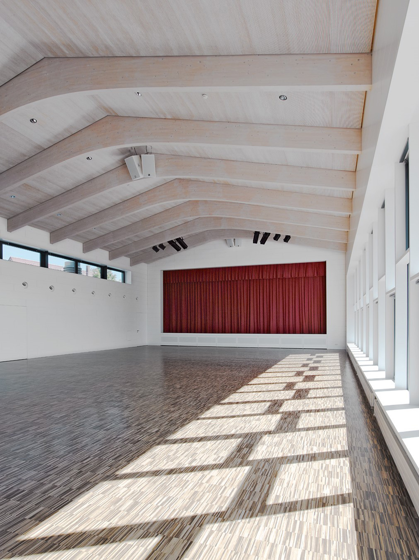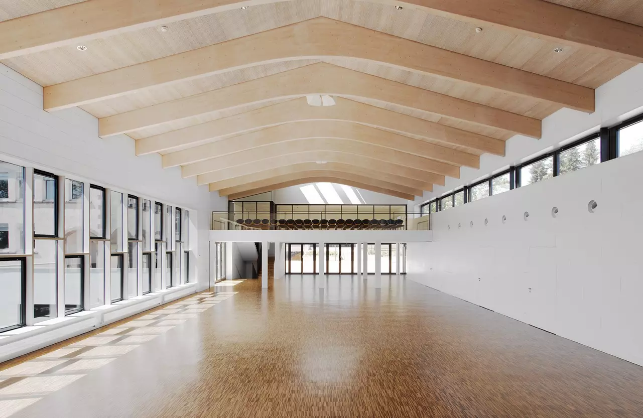 The new festival hall has been constructed on the site of a demolished hall and references the volume of the former building. The detached positioning and reduction of the building’s volume lend the festival hall a powerful presence in the public space. The main entrance is facing the square. The façade, made of fibre cement shingles, wraps around the compact building with rounded corners, resembling a dress. The entrances to the adjacent schools with their corresponding schoolyards have been redesigned. A spacious courtyard has been created between the buildings, which can also be used as a festival square.