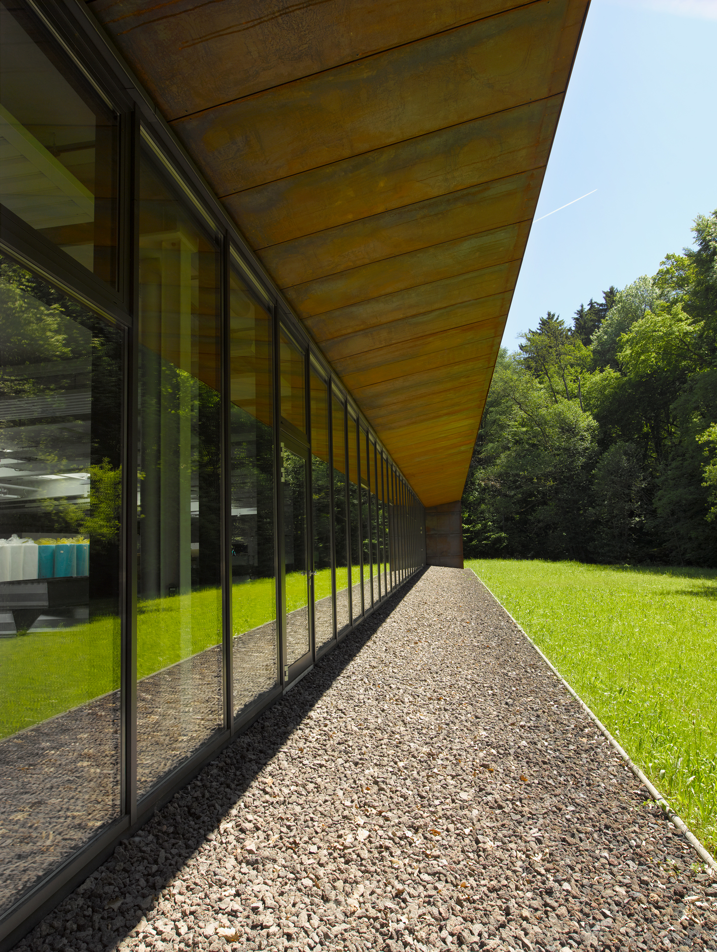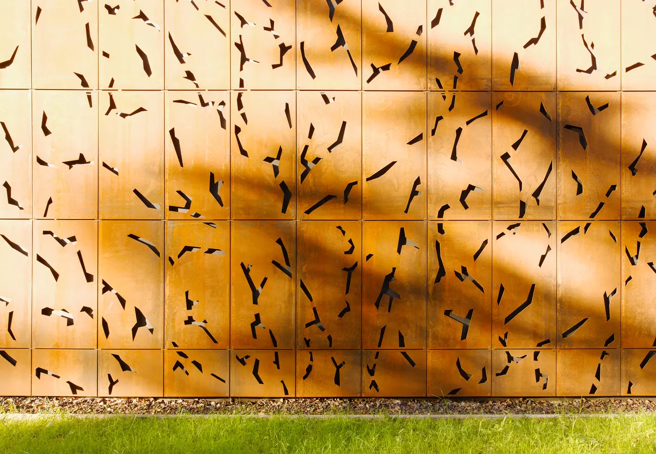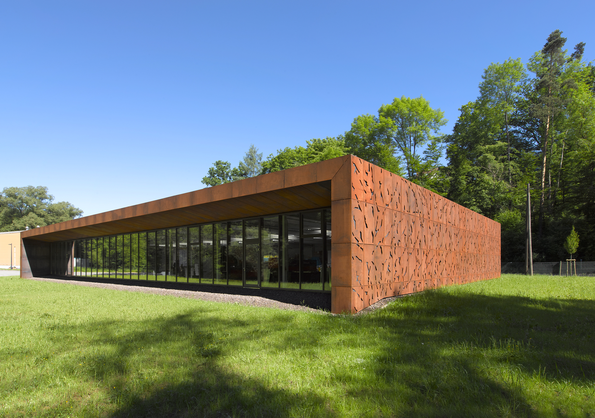 The extension of the Heinz Fischer company with a factory hall could only be realised towards the Schaichtal nature reserve, a sensitive and scenic floodplain landscape. The integration was achieved using a Corten steel façade, which was laser-cut with free forms. This design approach helps dissolve the mass of the building. The hall is closed on three sides, while the fourth façade opens up towards the stream. This creates an image of nature, forming a symbiosis with the working environment. The hall can be used for both production and storage purposes.