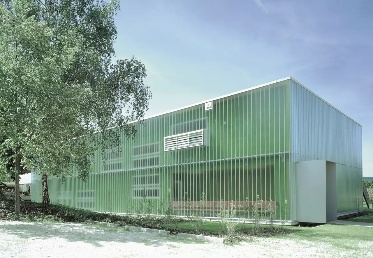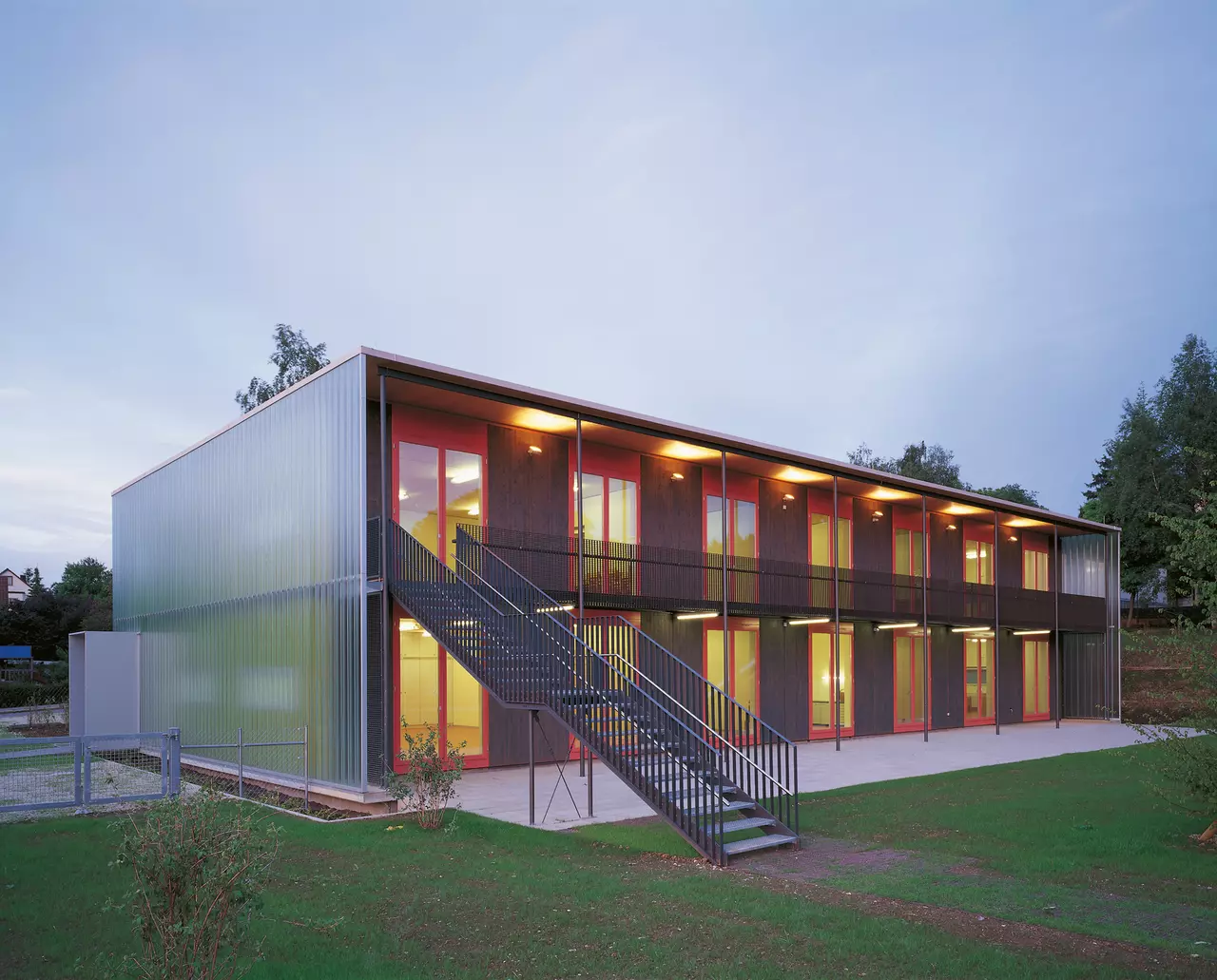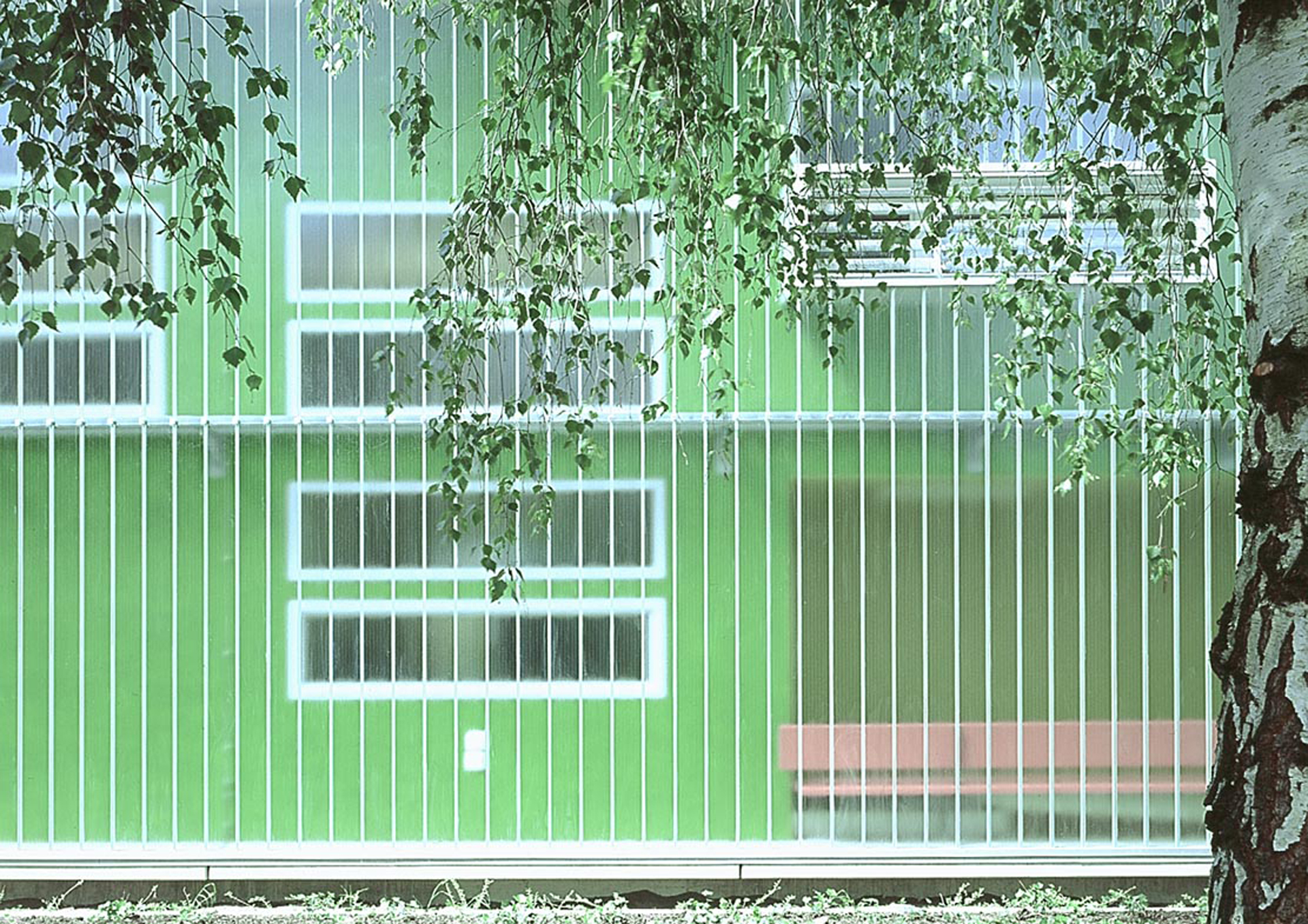 The entrance to the new residential quarter on a conversion area required a distinctive building with appropriate urban presence. The two-storey building design also has the advantage that a larger area of the site can be used as an outdoor play area. The space allocation plan includes three kindergarten groups including an option for all-day use. The prefabricated timber panel construction with stacked timber floor slabs features a curtain-wall cast glass façade on three sides, which is installed at a distance from the timber walls so that the space in between acts as a climate buffer.