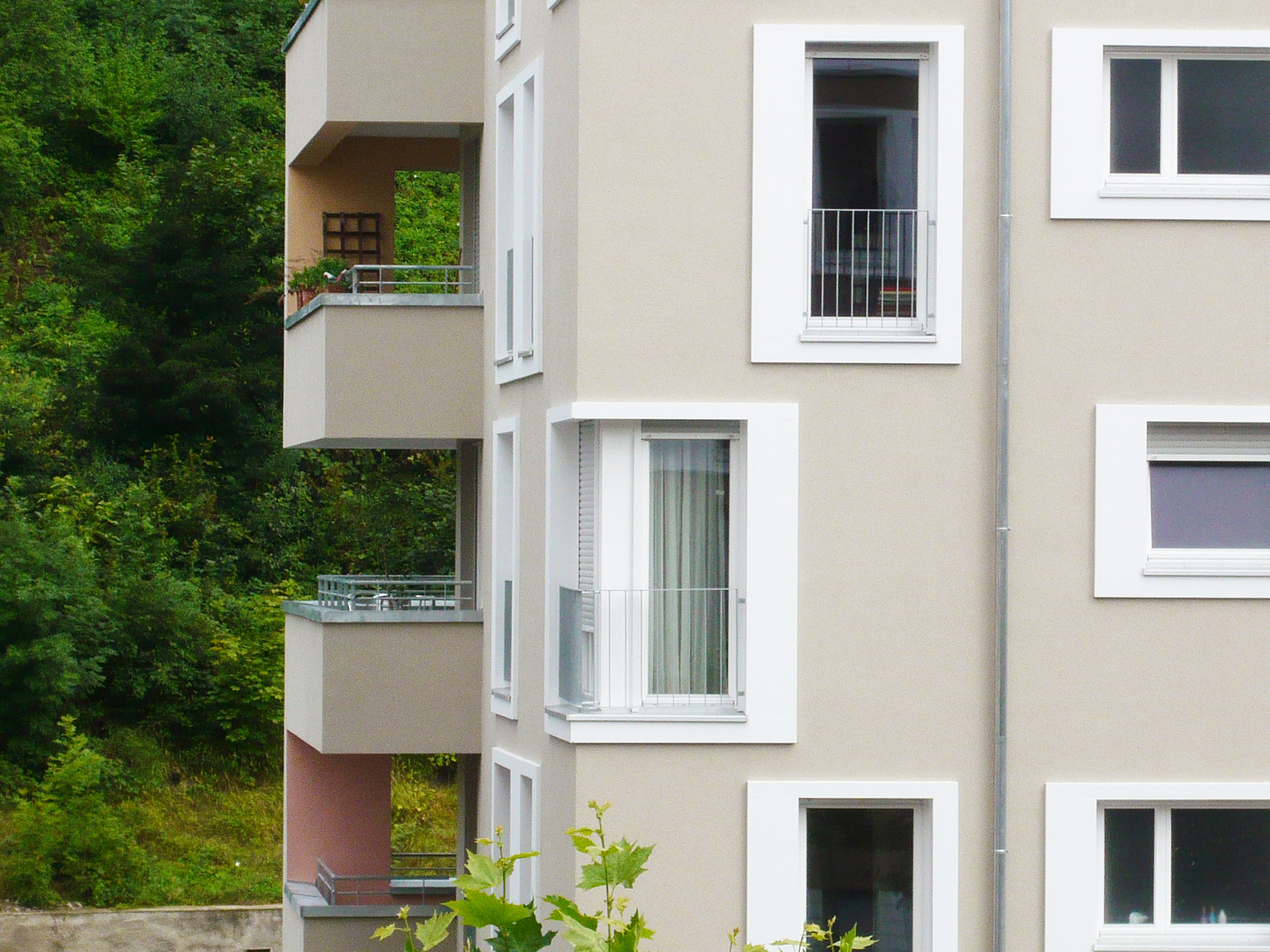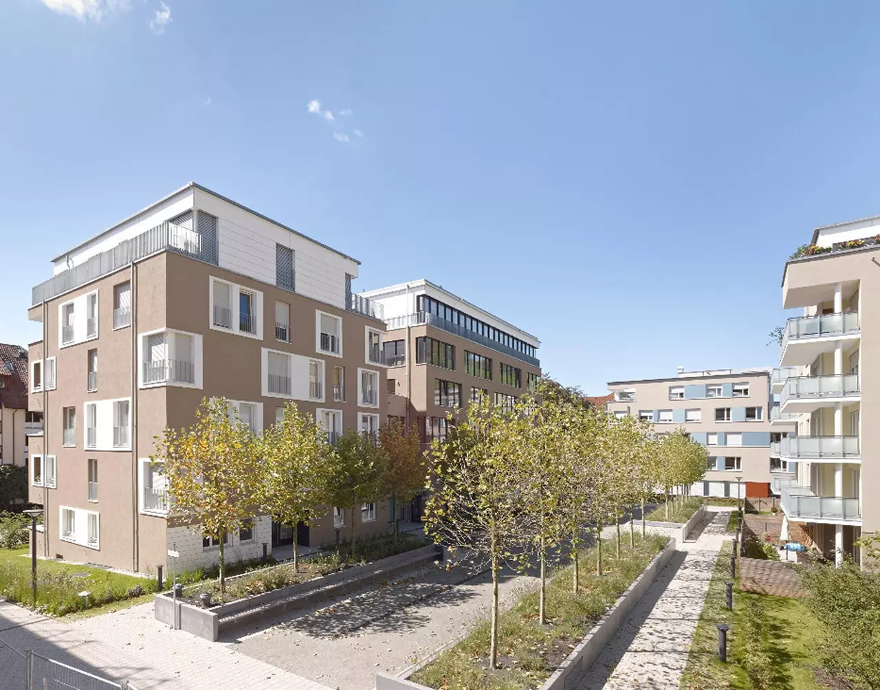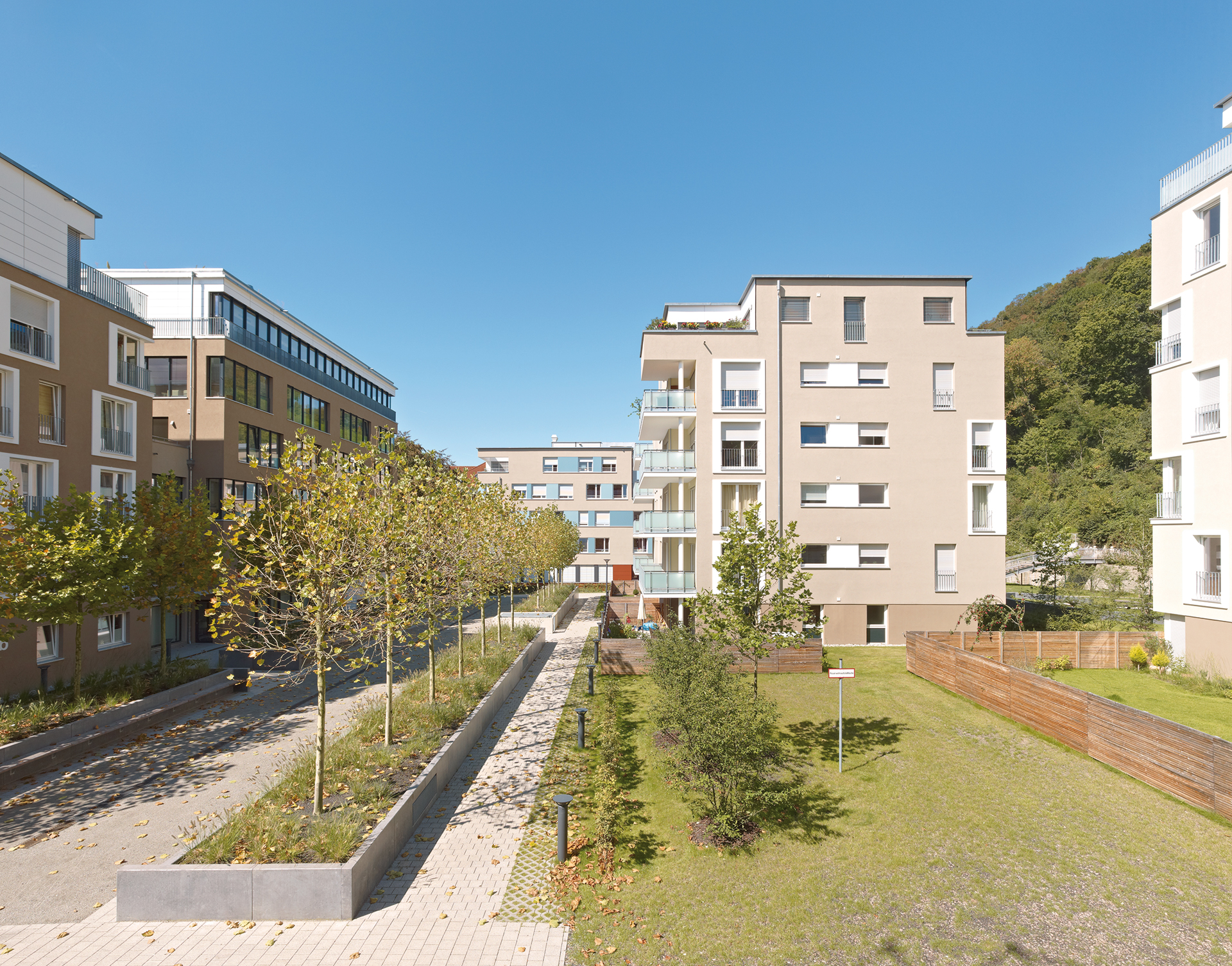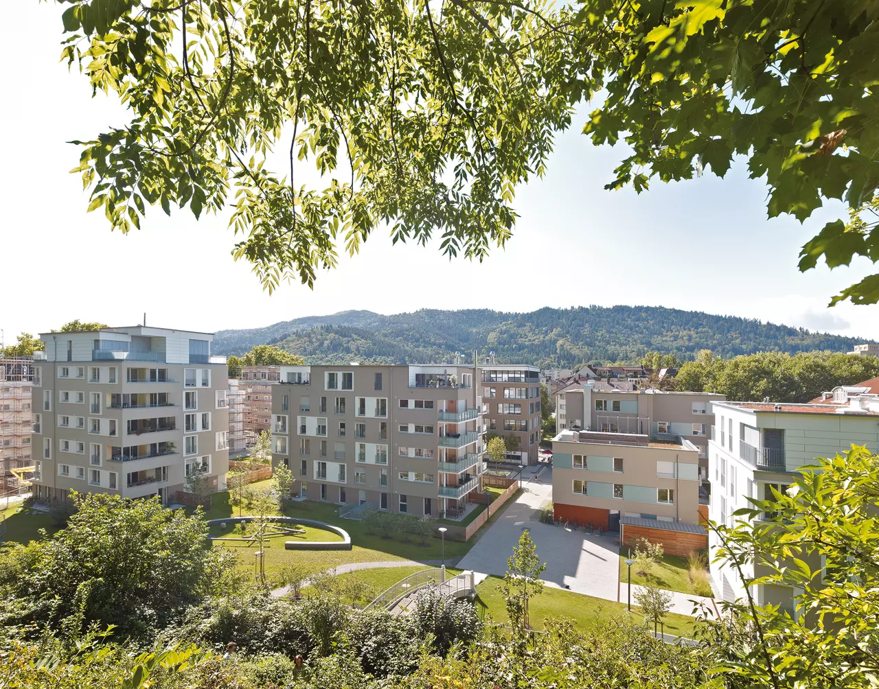 A high-quality urban quarter has been created on the former industrial site of the Coats/Mez company, located between Kartäuserstrasse and the Schlossberg in the city centre. The staggered arrangement of the town villas ensures that the Schlossberg is always present. This creates attractive views and well-lit apartments. The St. Augustinusheim, a foster home for children and young people, and a service building with a café bring life to the neighbourhood square. On the other hand, the residential buildings are loosely arranged around the “Green Centre”, which serves as a meeting point and playground for the residents.