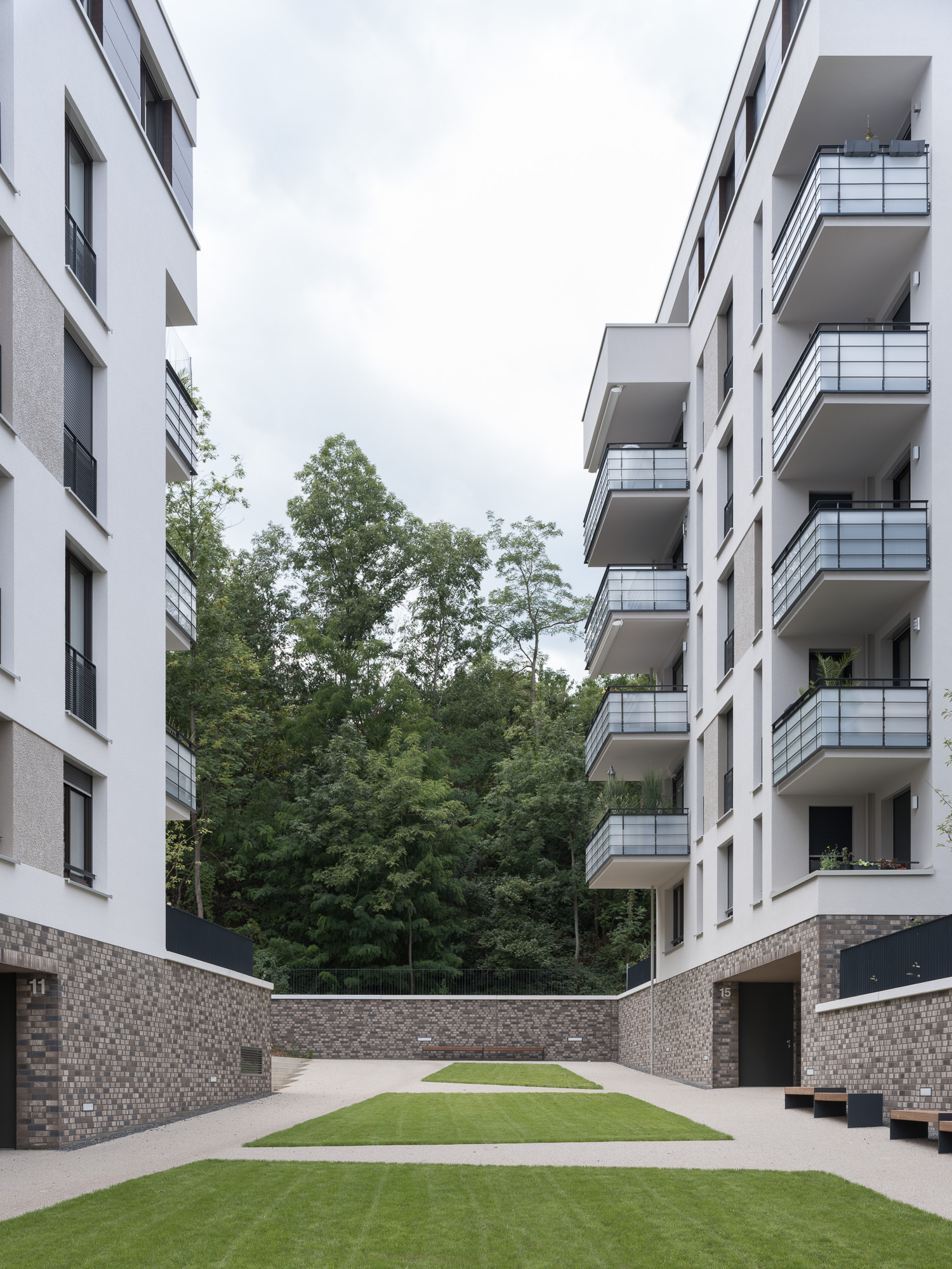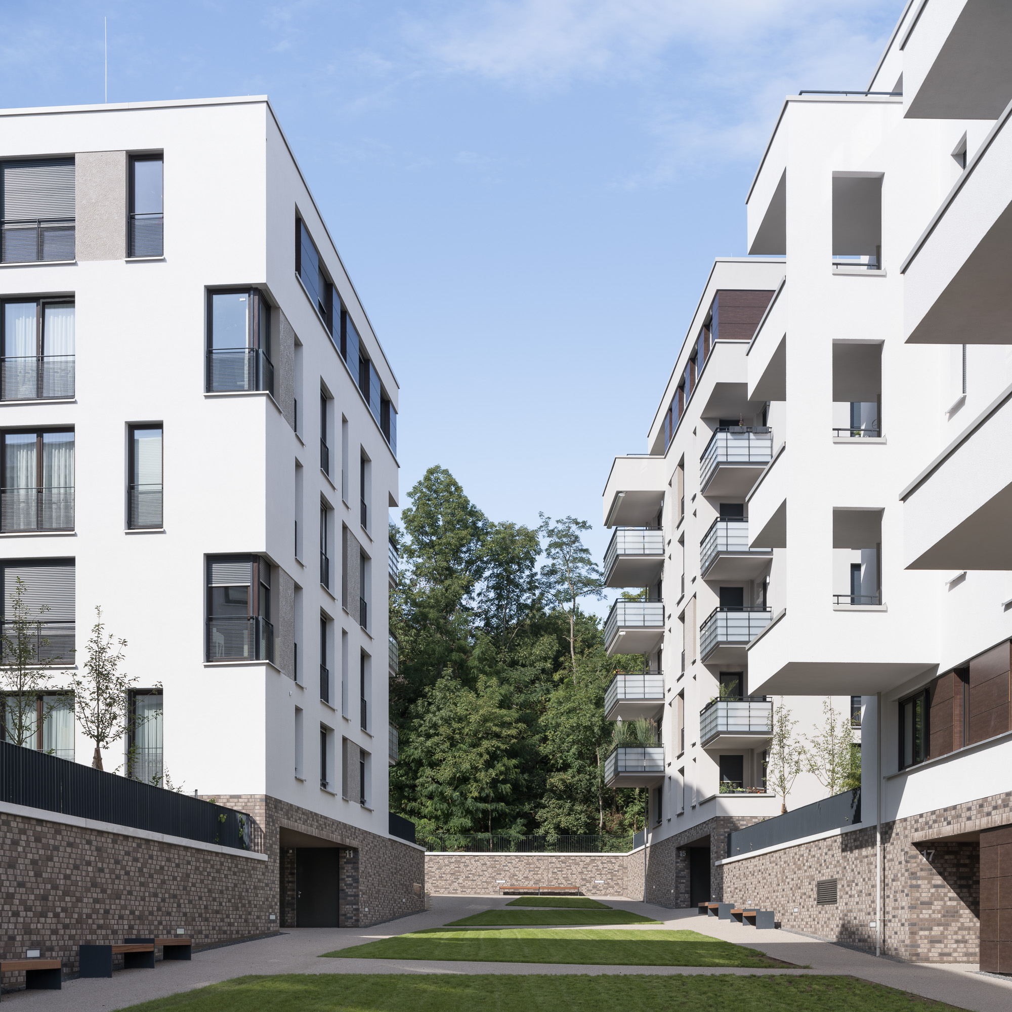 The elongated courtyard takes on an urban character towards Maybachstrasse, while the area rising towards the park in the west is partially landscaped with greenery. The courtyard is flanked by brick-faced walls of the shared podium, bringing the buildings together as a cohesive unit. Between the buildings, gardens designed as outdoor living areas are created, which are assigned to the ground-floor apartments. The level of the first floors is raised compared to the courtyard, ensuring sufficient privacy of the residential gardens.