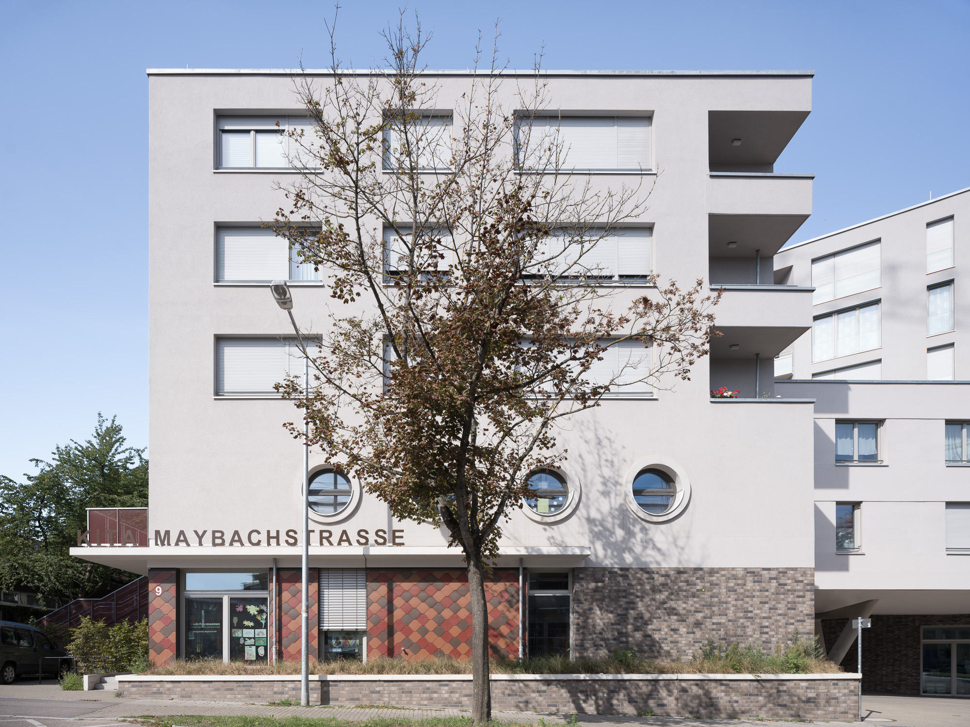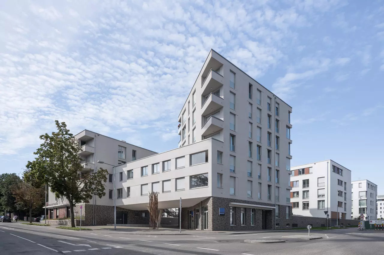 The buildings are arranged in two rows, forming an elongated courtyard in the shape of a rhombus. The two buildings on Maybachstrasse are connected on the 1st and 2nd floors, forming a so-called “gatehouse” that serves as the portal for pedestrians to the semi-public courtyard, from where the main entrances of the residential buildings are reached. The lower floors of the gatehouse accommodate a daycare centre and a commercial unit.