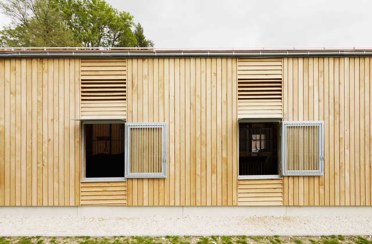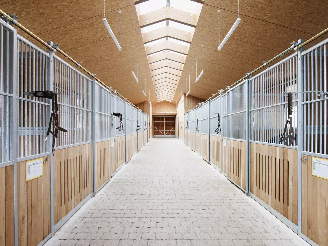 The supporting structure of the stable buildings consists of glue-laminated timber frames, with flush cladding on the inside.