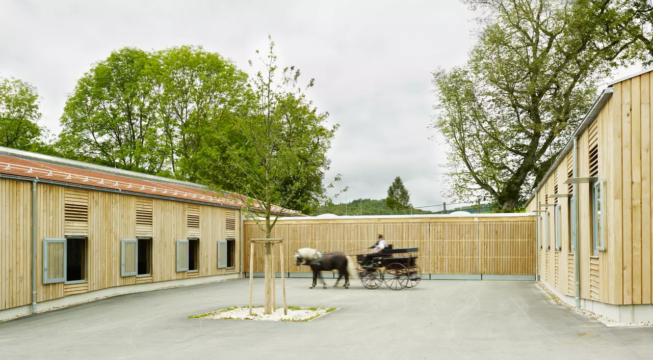 The training stables are laid out to the north of the historical stud farm in a U-shape around a service yard that opens onto the street. The horse stables are housed in the two side wings. The stable buildings thus fit into the linear structure of the stud farm. The carriages are accommodated in an intermediate building.
