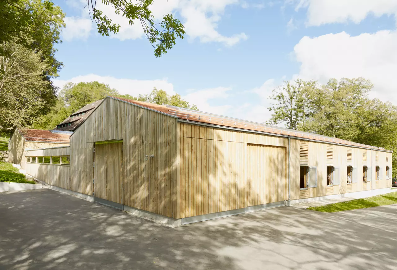 With their gabled roofs, the two stables are integrated into the existing building structure. The intermediate building with a flat roof is subordinate to the two main buildings – the view of the pastures situated higher up behind the building is preserved.