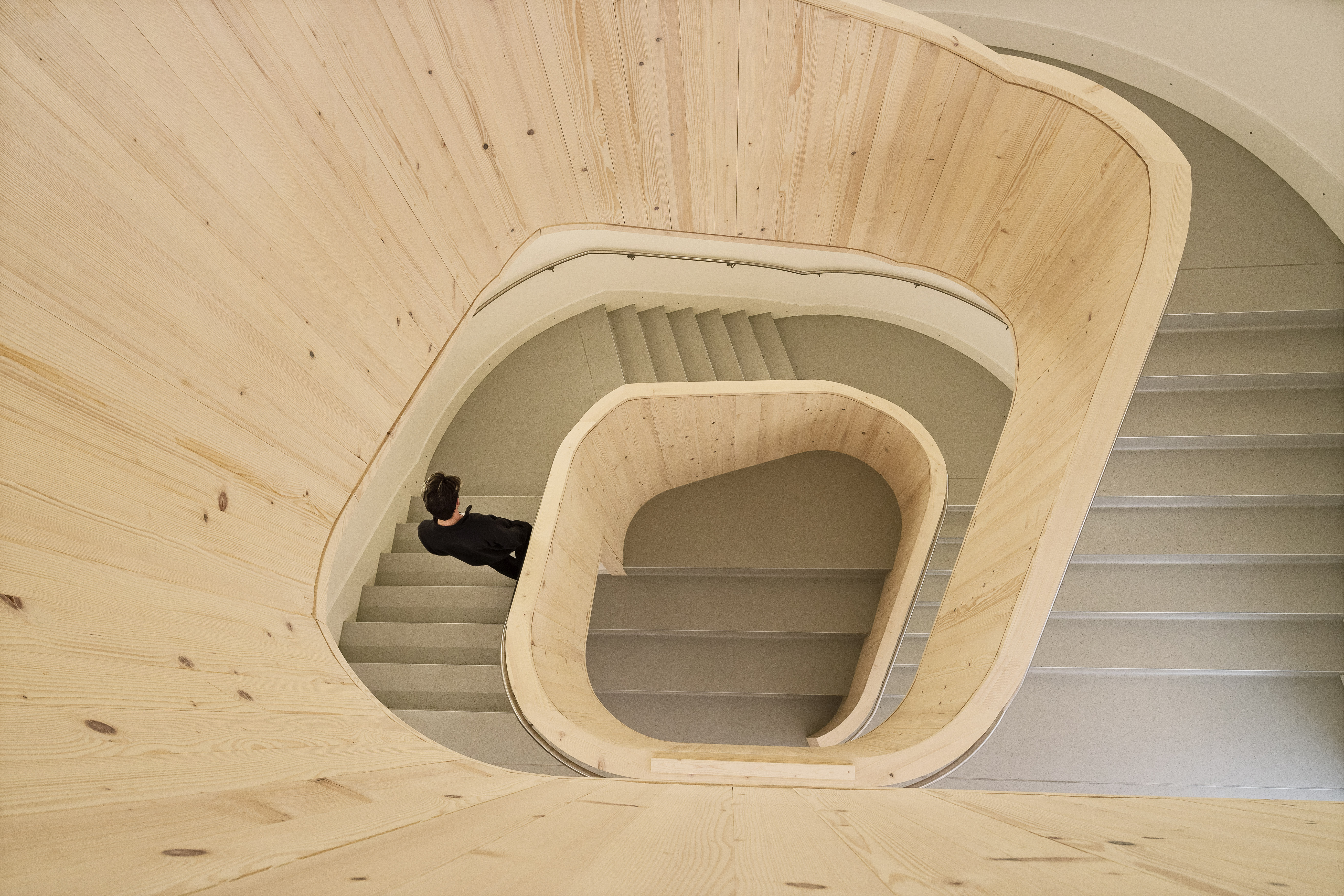 Inside, the staircase serves as an important spatial design element and is a special feature due to its rounded shape. The main staircase in the north of the building requires no supports in the spacious stairwell. The loads of the three rounded flights of stairs are completely transferred to the exterior walls and floor slabs. The stair railings consist of solid silver fir slats, which are glued into curved panels and fixed to the stairs. A central skylight provides the staircase with daylight.