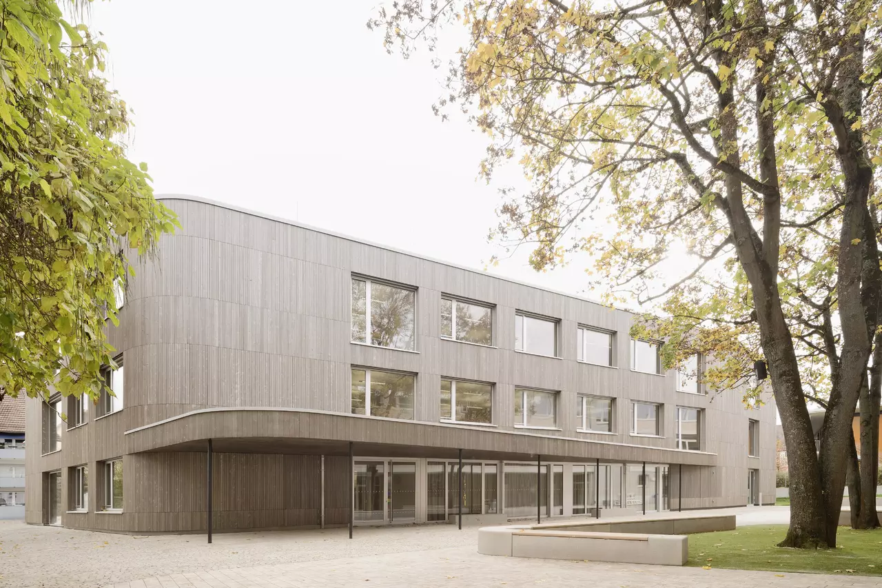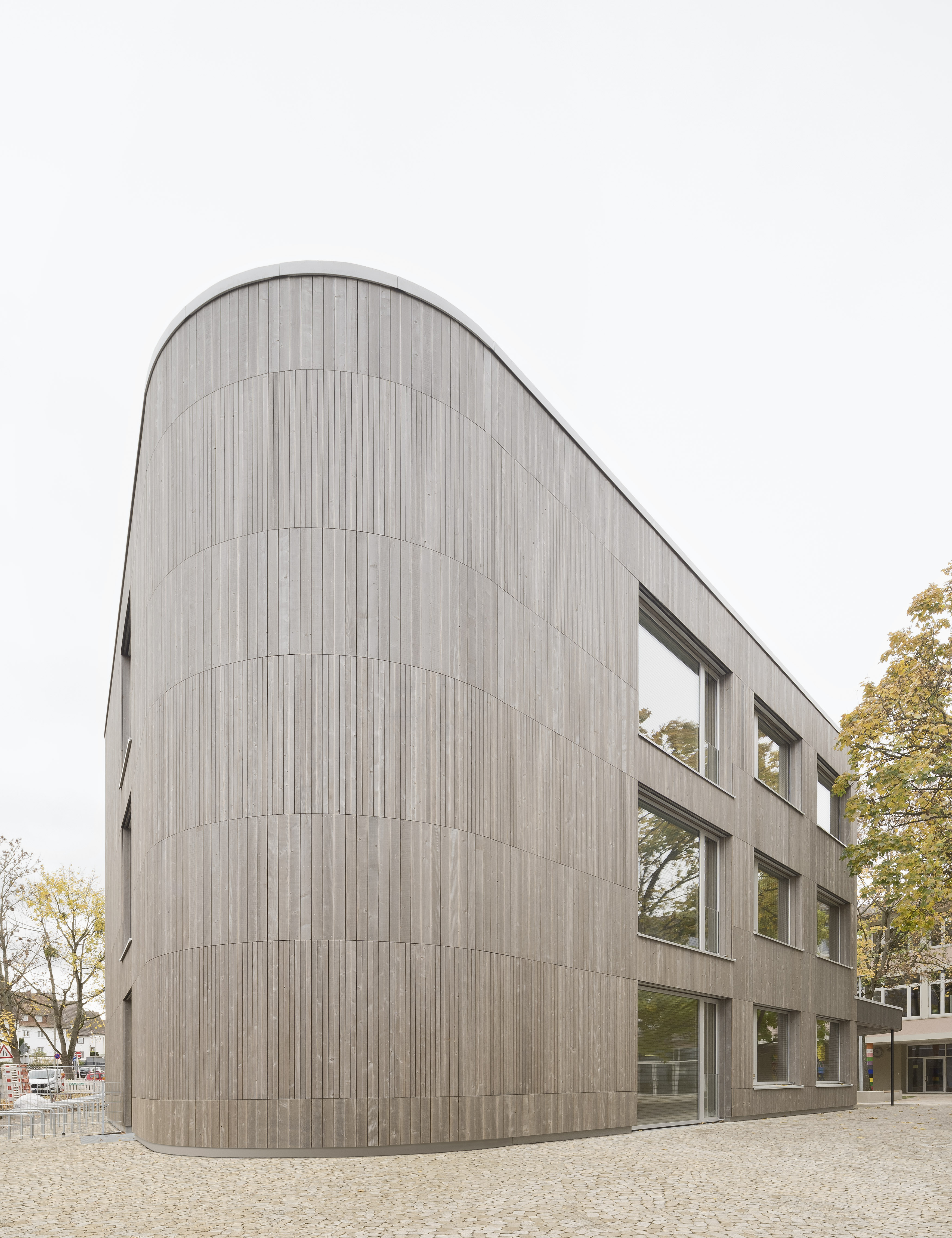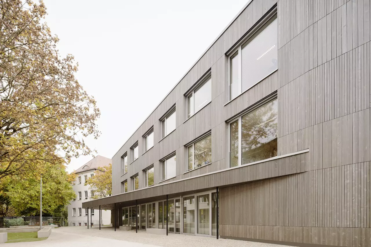 From the outside, the extension presents itself as a combination of large glass areas and closed light grey wooden sections made of silver fir. The vertical wood cladding is structured by horizontal segmentation: wide bands alternate with narrow wooden slats and narrow bands alternate with wide wooden slats, creating a dynamic effect that, in the interplay with the different window formats, forms a differentiated façade. A tapering roof marks the main entrance, which is accessible from the schoolyard. Here, the main staircase adjoins, which stands out in the façade due to its windowless and large rounded shape.