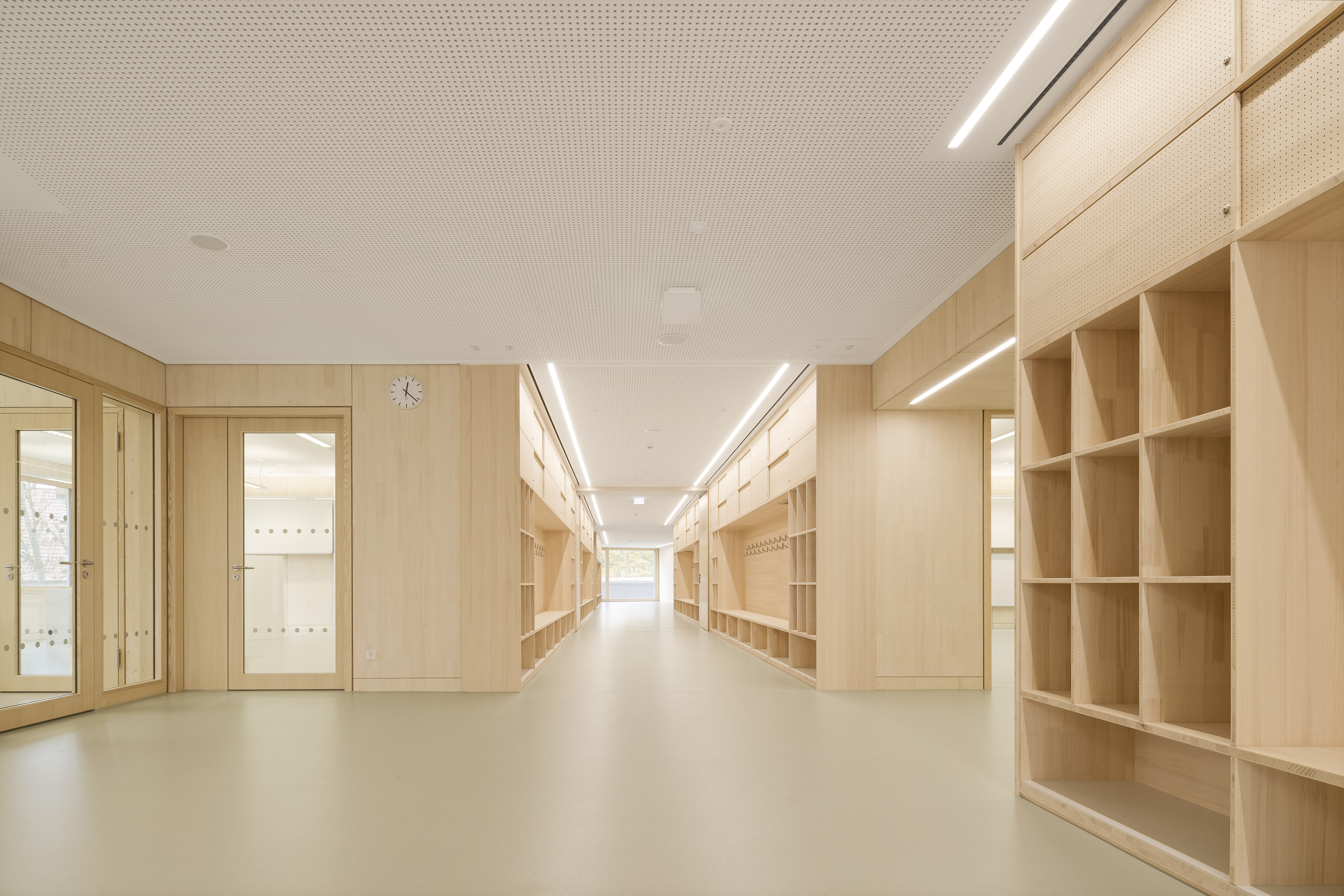 The room schedule does not follow the usual structure where classrooms are lined up along a corridor. Following the cluster concept, there are two groups of rooms on each floor, in each of which three classrooms with modern equipment and the associated differentiation rooms are arranged around a central, widening circulation area, which in turn serves as a communication space or can be used for open teaching formats. Functionally divided cloakroom fittings made of silver fir, which are assigned to the classrooms, are located here. A glass wall between the cluster centre and the differentiation room creates spatial proximity while allowing a view from the centre to the outside.