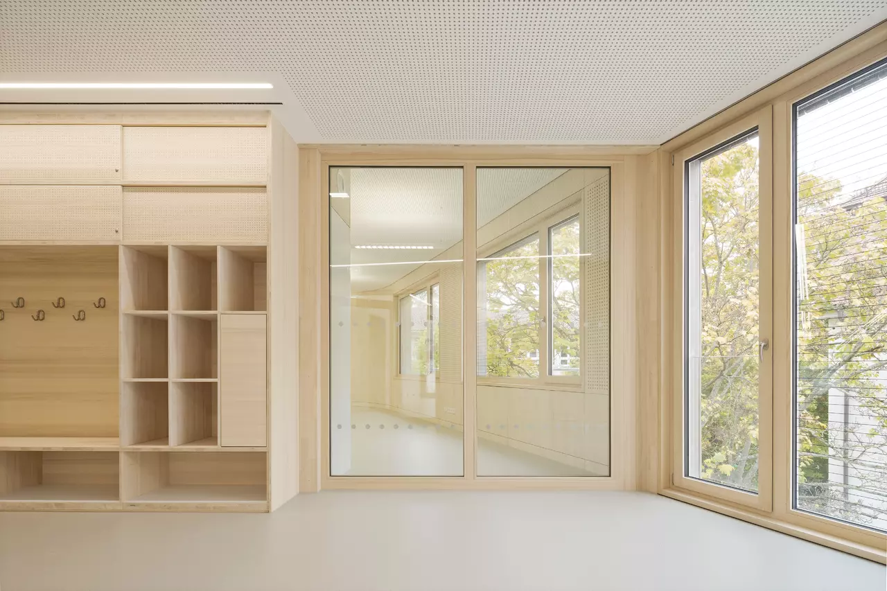 Bright, natural silver fir wood also distinguishes the wall surfaces and built-in furniture. The wood creates a warm, natural aesthetic and is also an architectural special feature, as the walls meet the high legal requirements for sound insulation due to their two-shell, acoustically decoupled construction. Light-coloured rubber floors and white ceilings complement the friendly colour scheme and, together with the large, partly floor-to-ceiling windows, create a welcoming atmosphere with optimal daylight supply. The architecture is reduced and concentrates on the effect and atmosphere of the chosen materials.