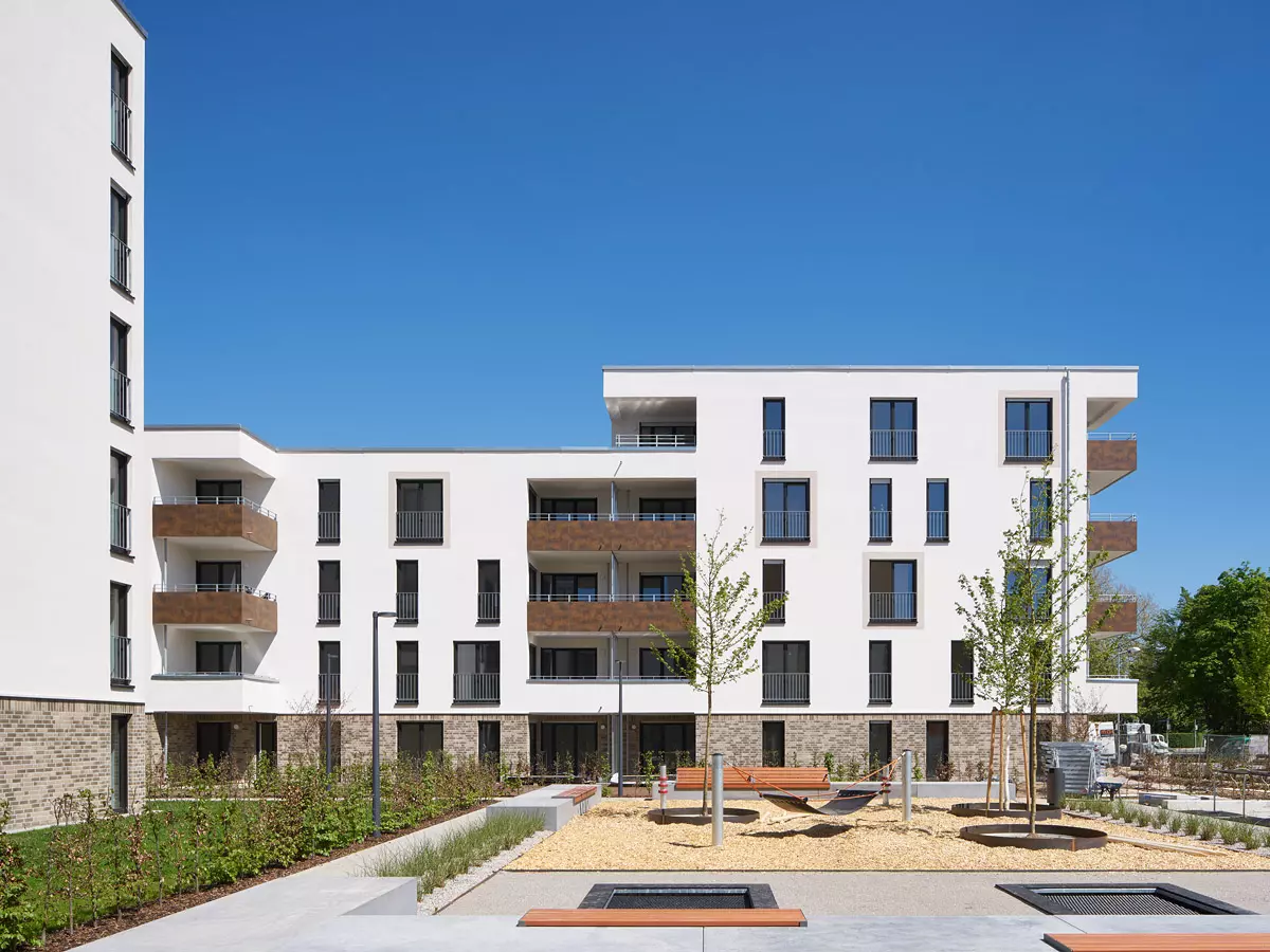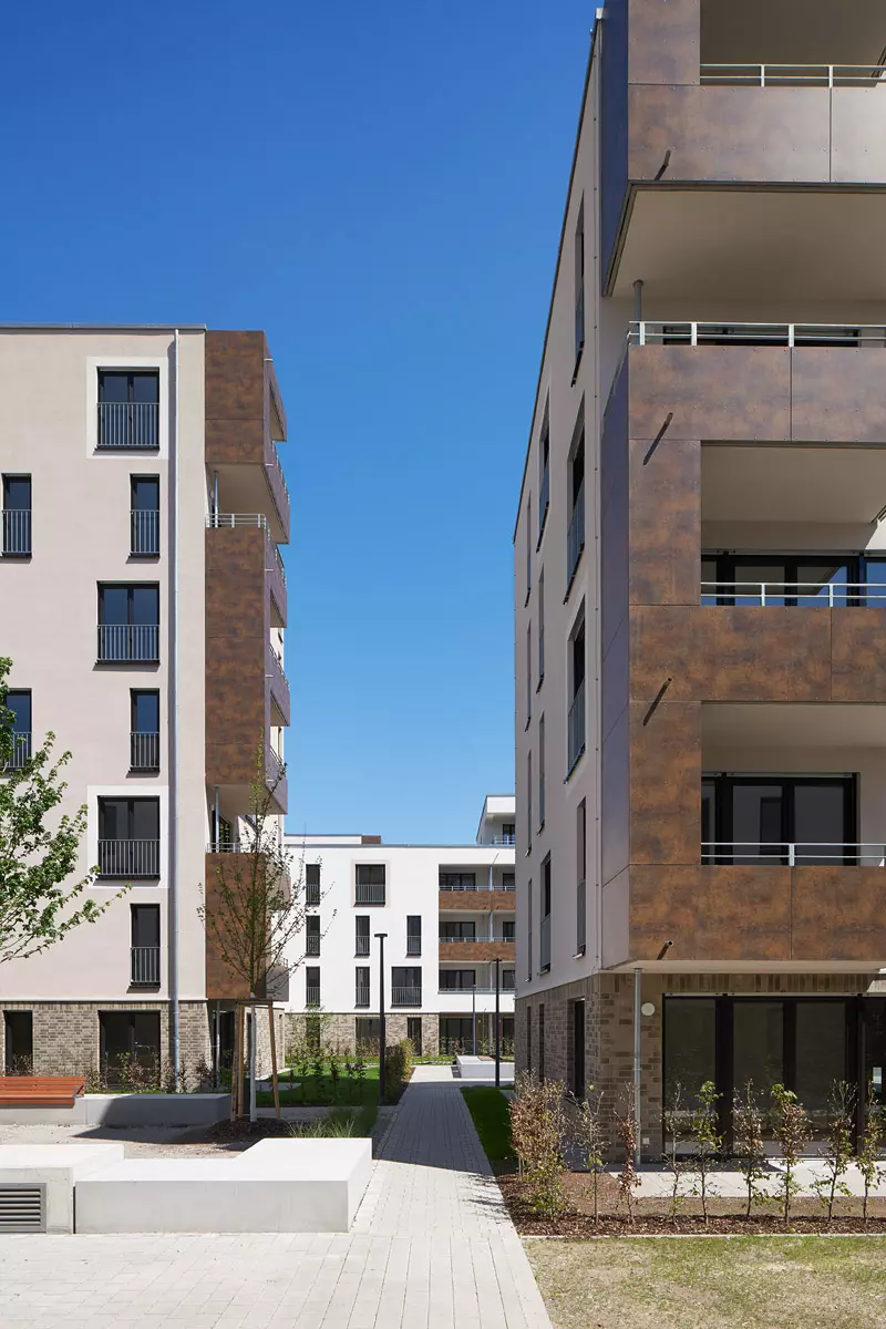 High-quality open spaces are a prerequisite for a vibrant urban neighbourhood. In the Rintheimer Feld project, closed block structures and open linear buildings blend together. The staggered arrangement of the buildings creates spatially enclosed, well-proportioned communal courtyards. All open spaces are interconnected, allowing for high permeability for pedestrians.