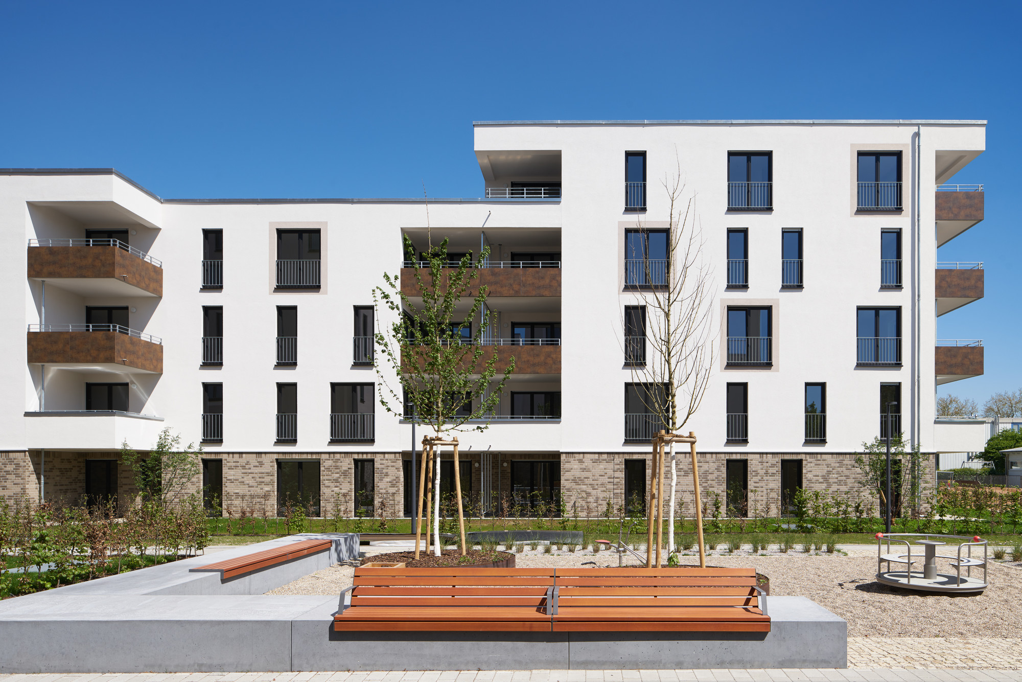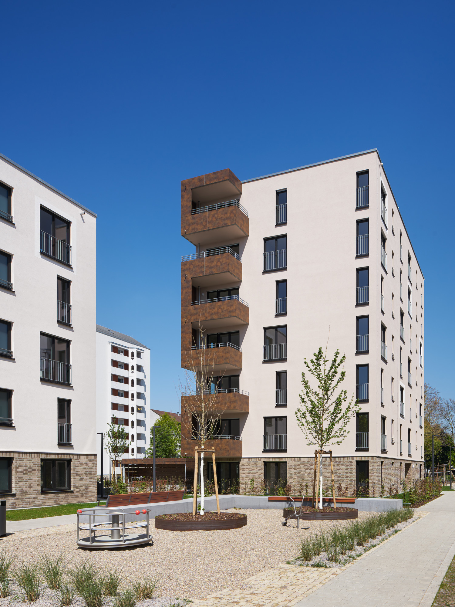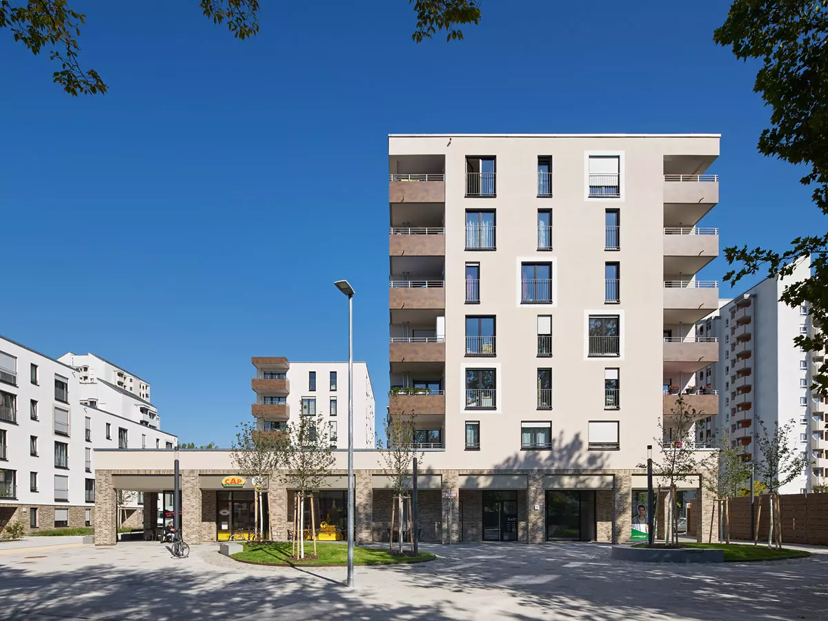 The central square and the boulevard form the entrance to the neighbourhood. At the same time, the boulevard connects the new buildings with the existing residential estate to the north. Adjacent to the central square, a commercially used base with shopping facilities defines the eastern boundary of the neighbourhood. Parking for customers is located to the east so that residents are not disturbed. This redesigned square provides a new impetus to the entire Rintheimer Feld neighbourhood.