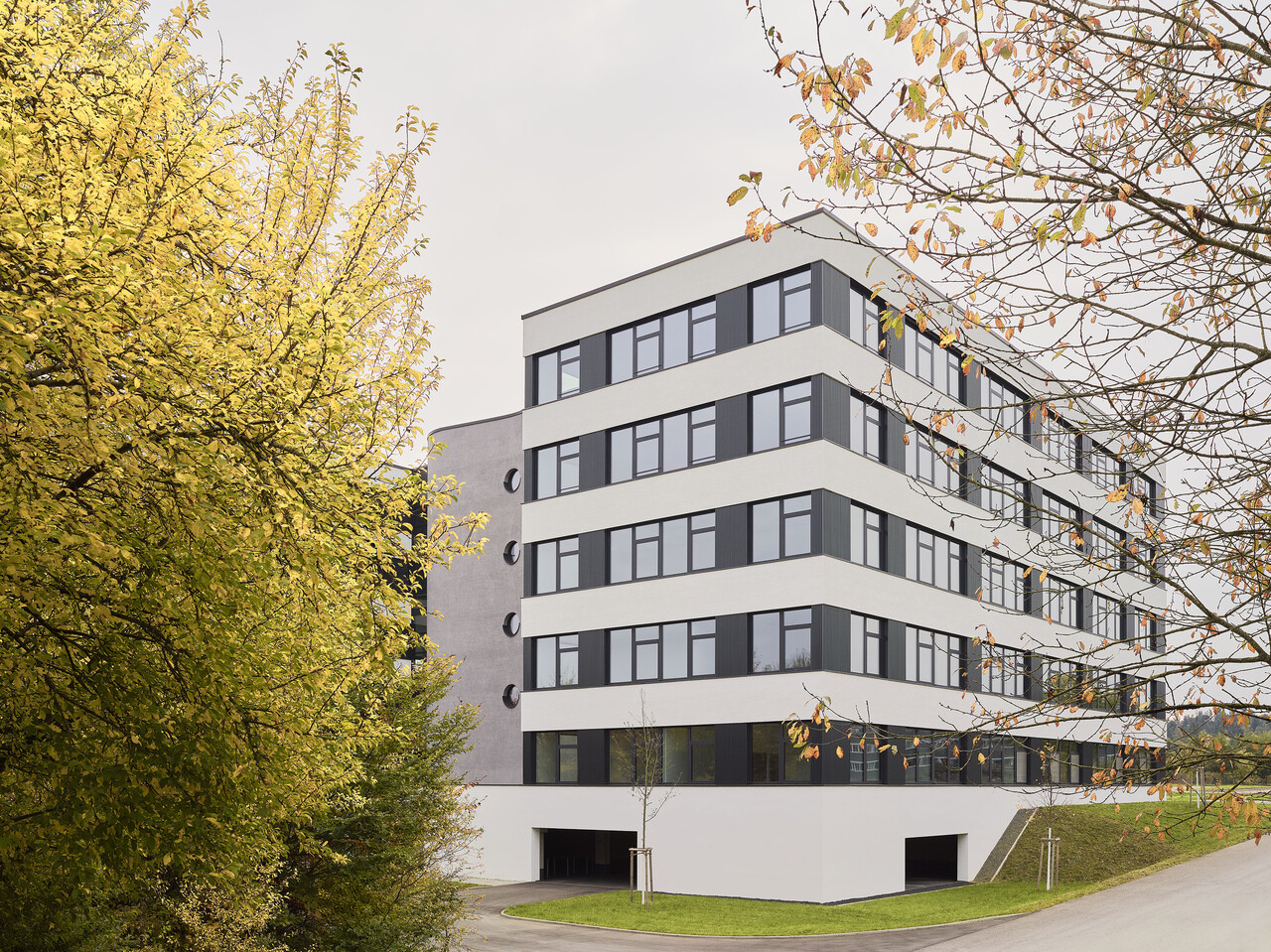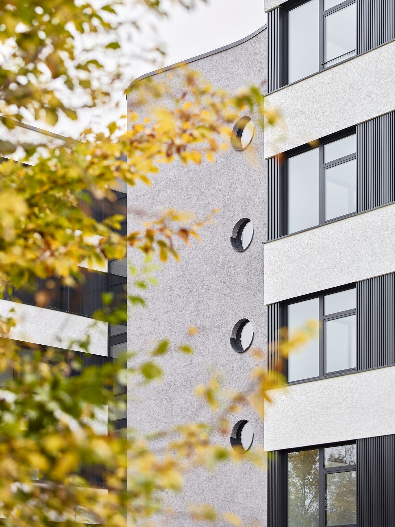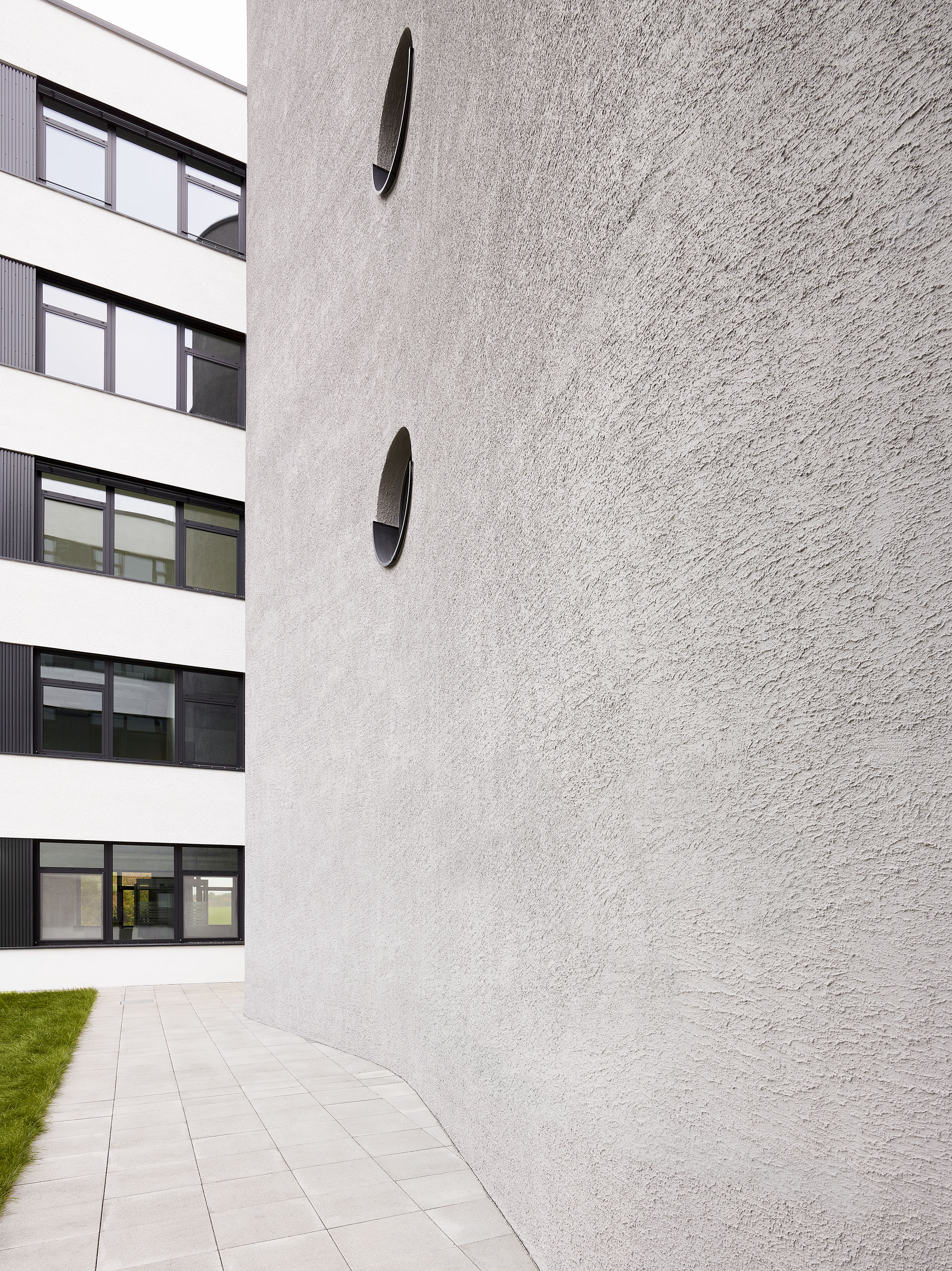 Die äußere Hülle wird durch eine helle Zupfputzfassade geprägt, unterbrochen von dunklen horizontalen Bändern aus strukturierten Aluminium-Paneelen zwischen den Fenstern. Über dem Haupteingang springen die oberen Geschosse leicht vor und erzeugen eine subtile räumliche Staffelung, die beim Eintreten einen leichten „Sog nach innen“ erzeugt. Die eingeschossige Eingangszone führt direkt in das vertikal aufstrebende, raumprägende Treppenhaus, dessen graue, grob verputzte Achtfigur mit ihren charakteristischen runden Bullaugenfenstern bereits in der Fassade als eigenständiges Element ablesbar ist.