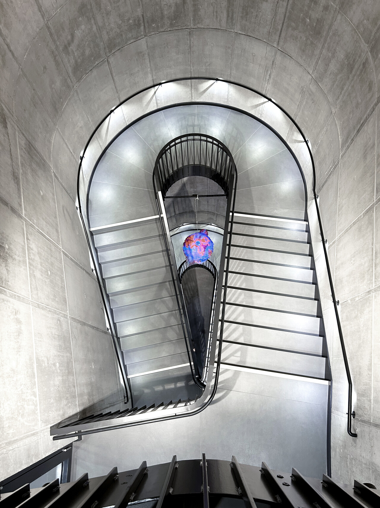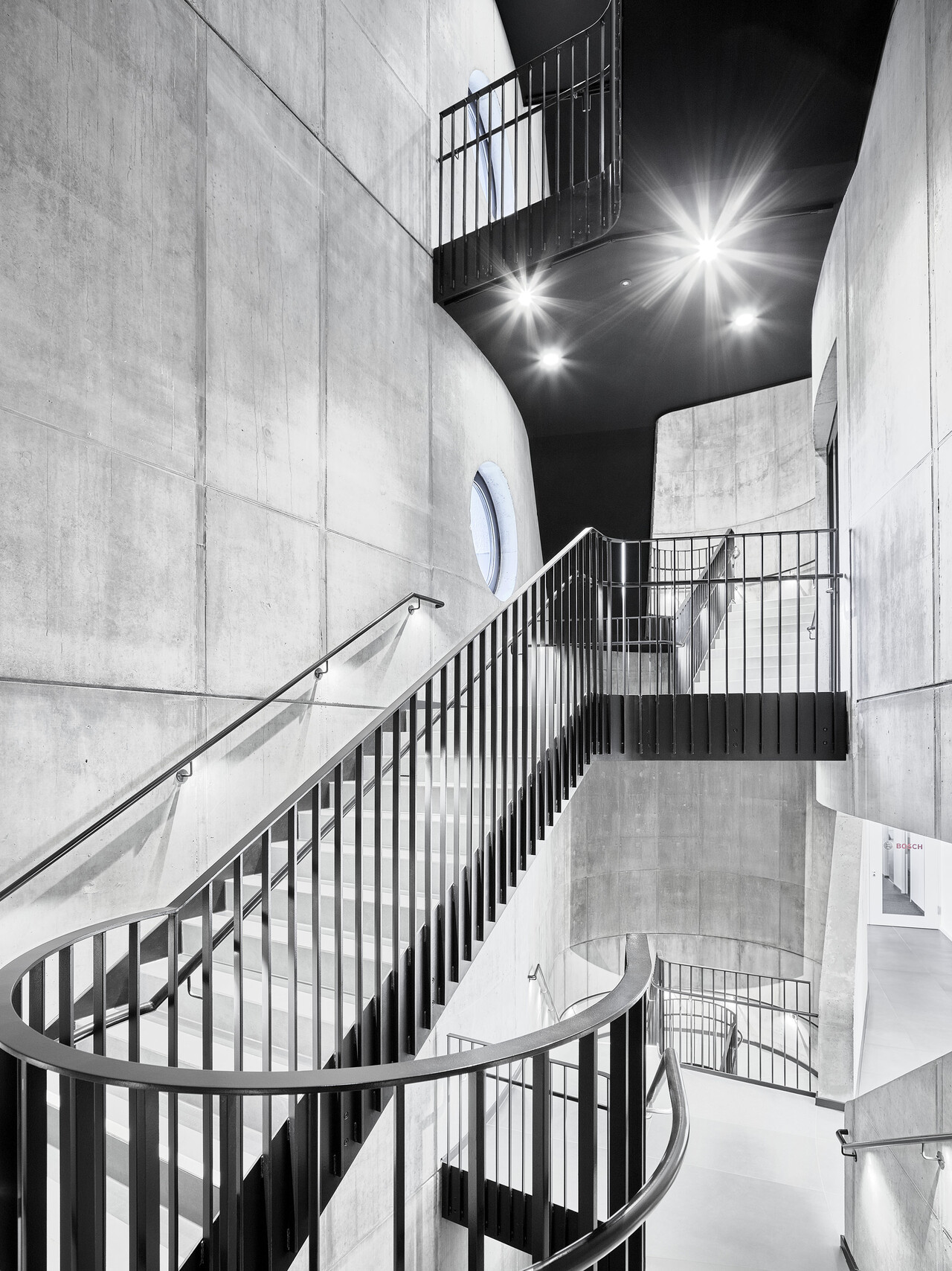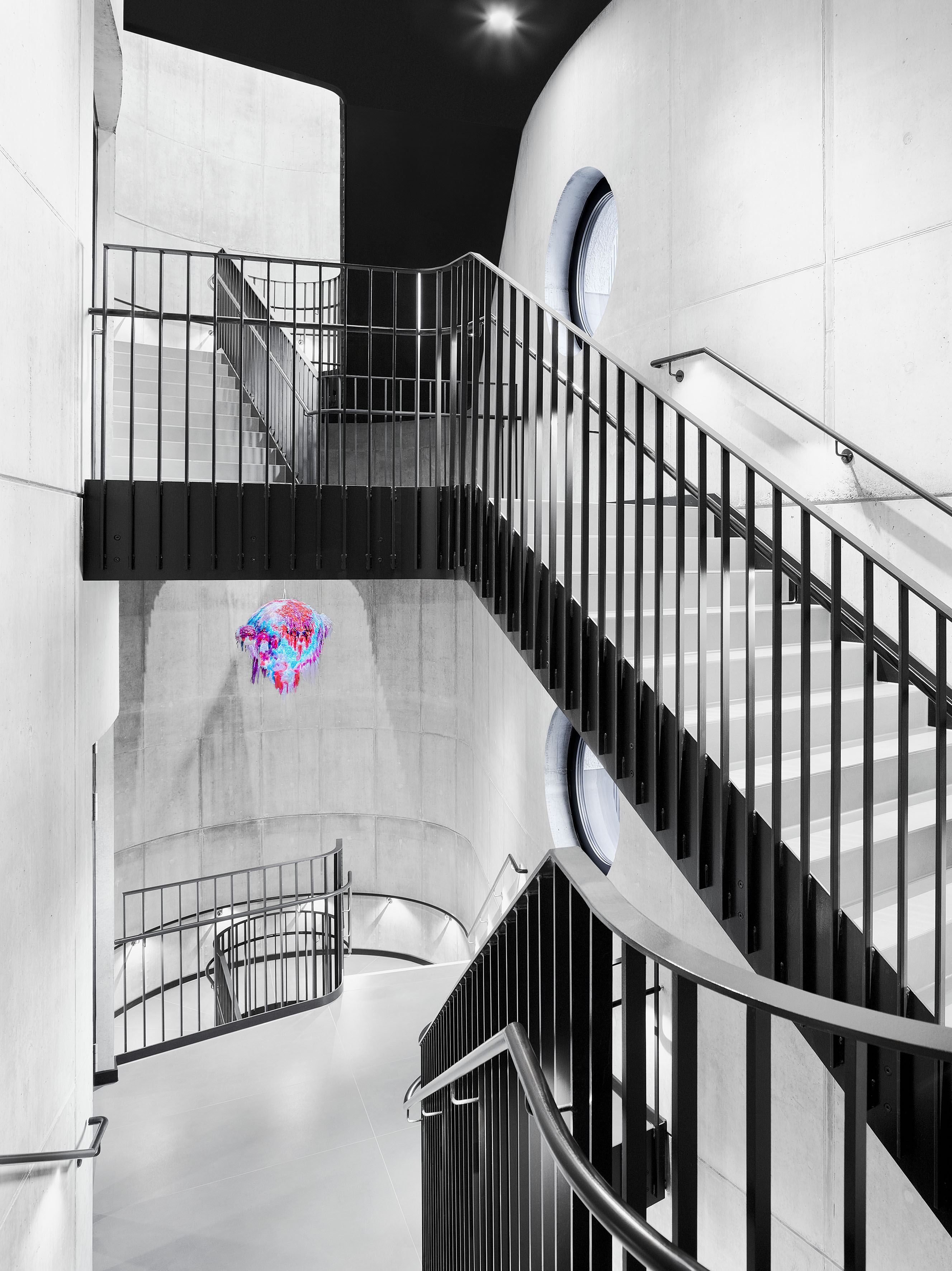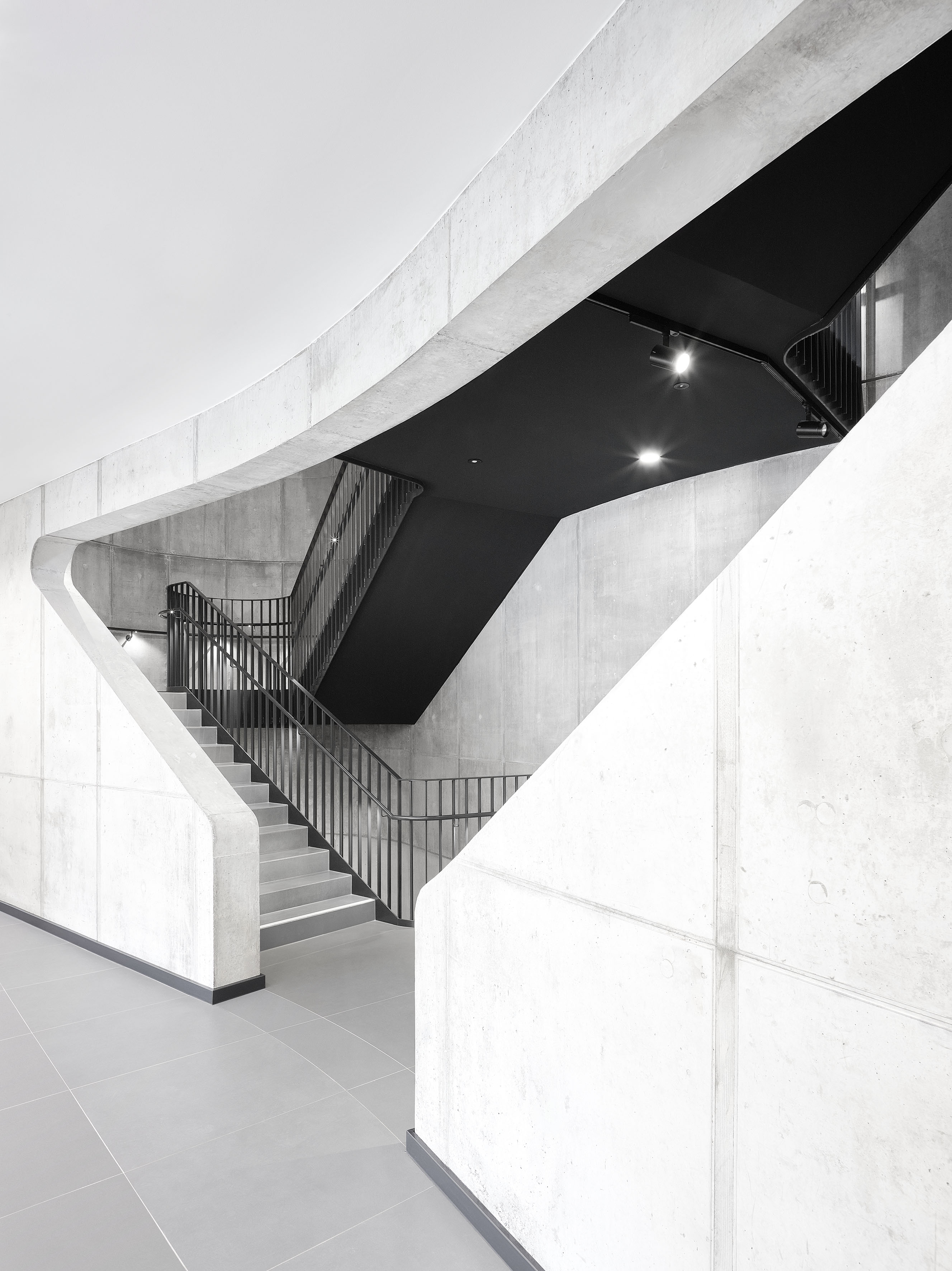 Die äußere Hülle wird durch eine helle Zupfputzfassade geprägt, unterbrochen von dunklen horizontalen Bändern aus strukturierten Aluminium-Paneelen zwischen den Fenstern. Über dem Haupteingang springen die oberen Geschosse leicht vor und erzeugen eine subtile räumliche Staffelung, die beim Eintreten einen leichten „Sog nach innen“ erzeugt. Die eingeschossige Eingangszone führt direkt in das vertikal aufstrebende, raumprägende Treppenhaus, dessen graue, grob verputzte Achtfigur mit ihren charakteristischen runden Bullaugenfenstern bereits in der Fassade als eigenständiges Element ablesbar ist.