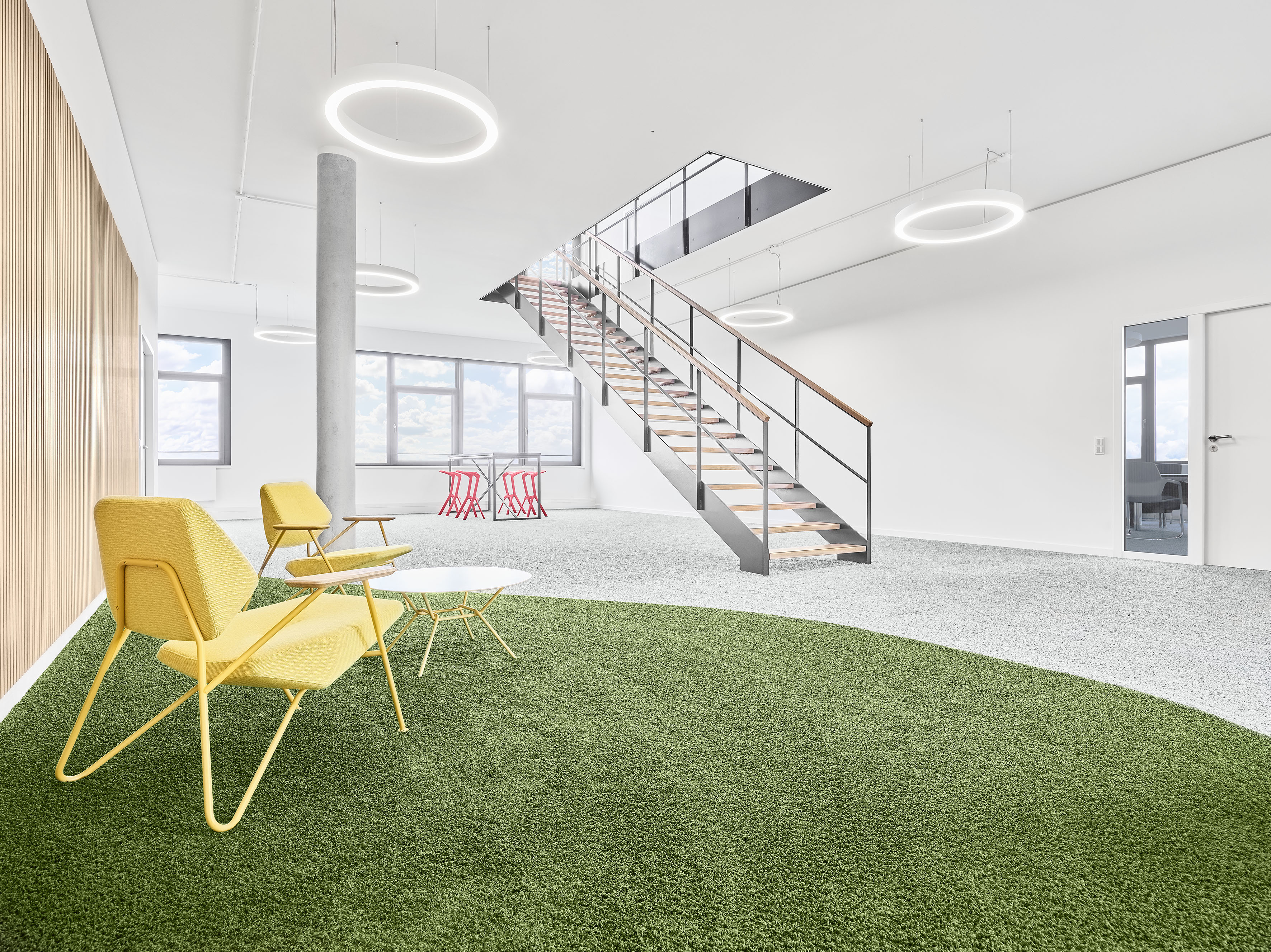 Das Gebäude ist um eine markante Erschließungszone organisiert, deren Treppenfigur in Form einer Acht das räumliche Zentrum bildet. Ein Oberlicht führt Tageslicht tief ins Innere und schafft eine einladende Atmosphäre, die Bewegung selbstverständlich macht und spontane Begegnungen fördert. Damit knüpft das Gebäude an das Nutzungskonzept des gesamten Technologieparks an, in dem kurze Wege den Wissenstransfer erleichtern und Austausch zur alltäglichen Qualität wird.