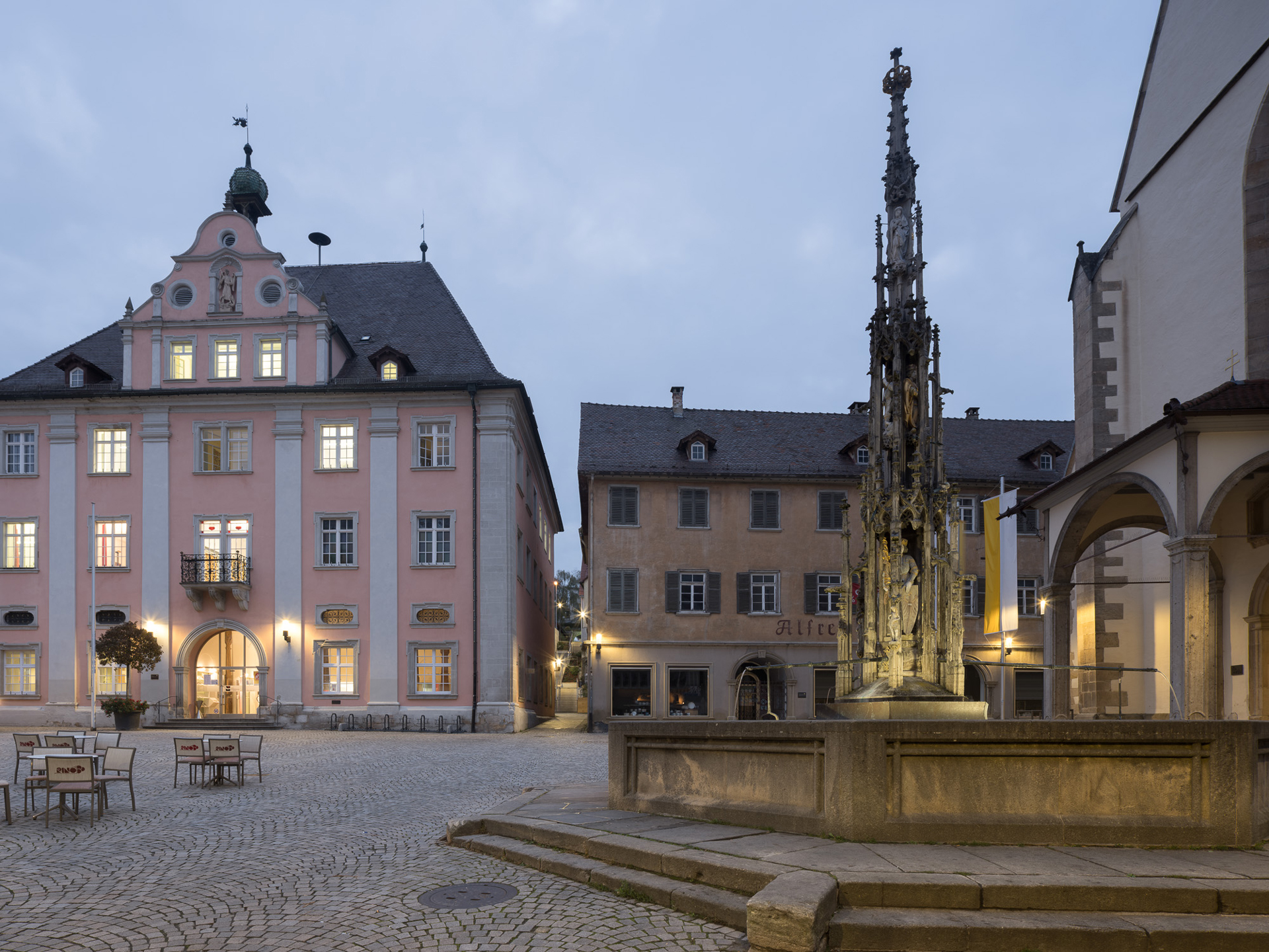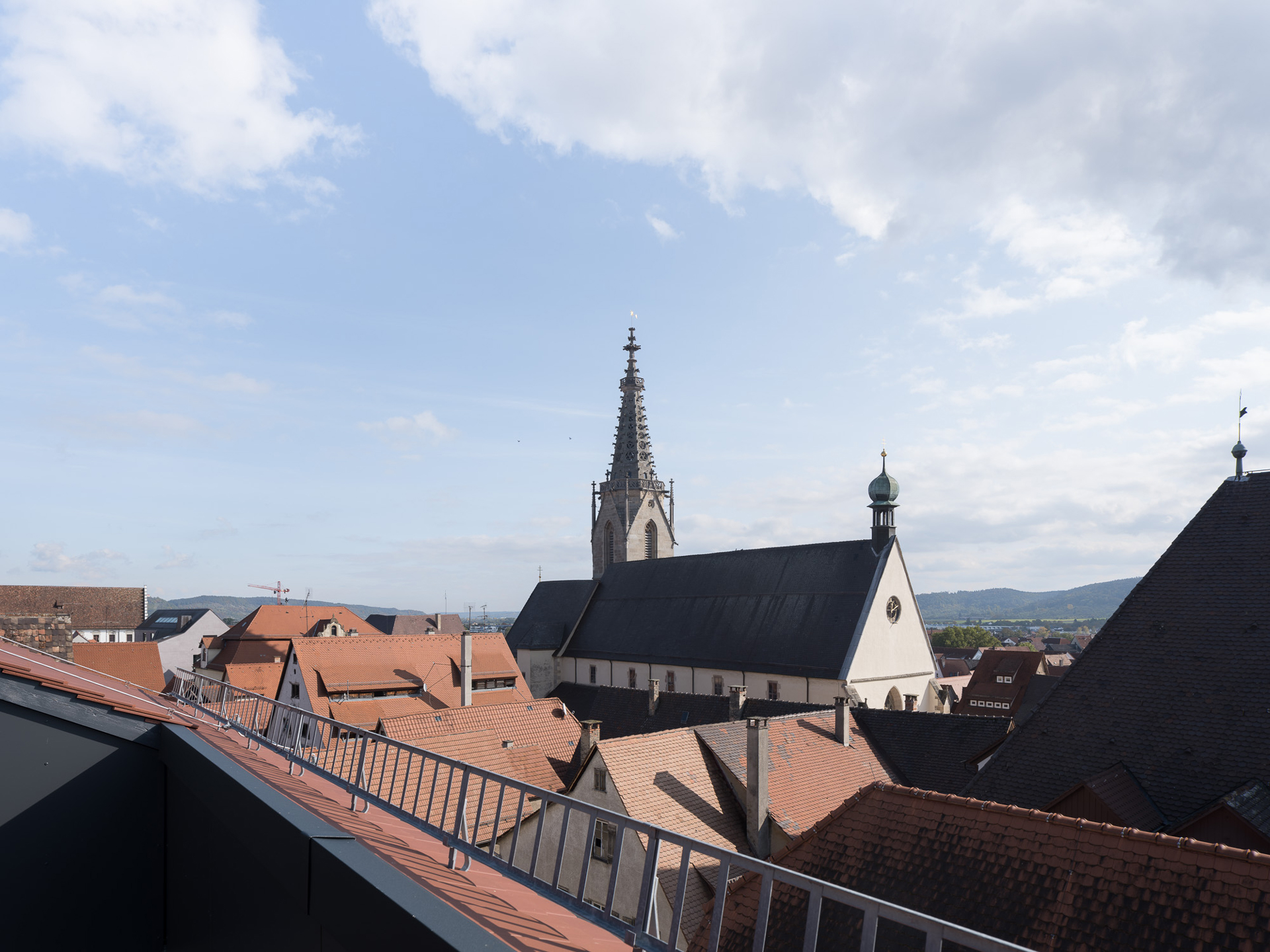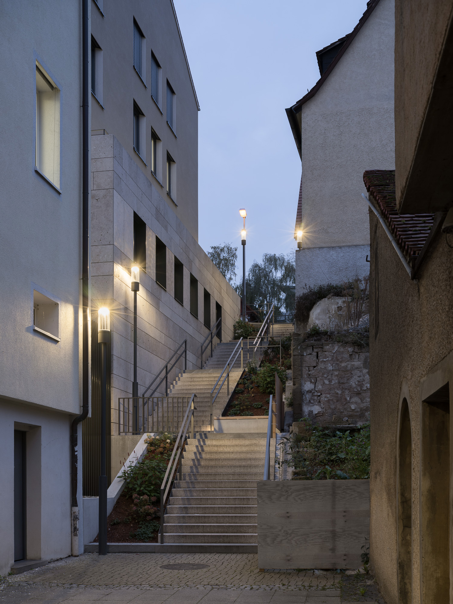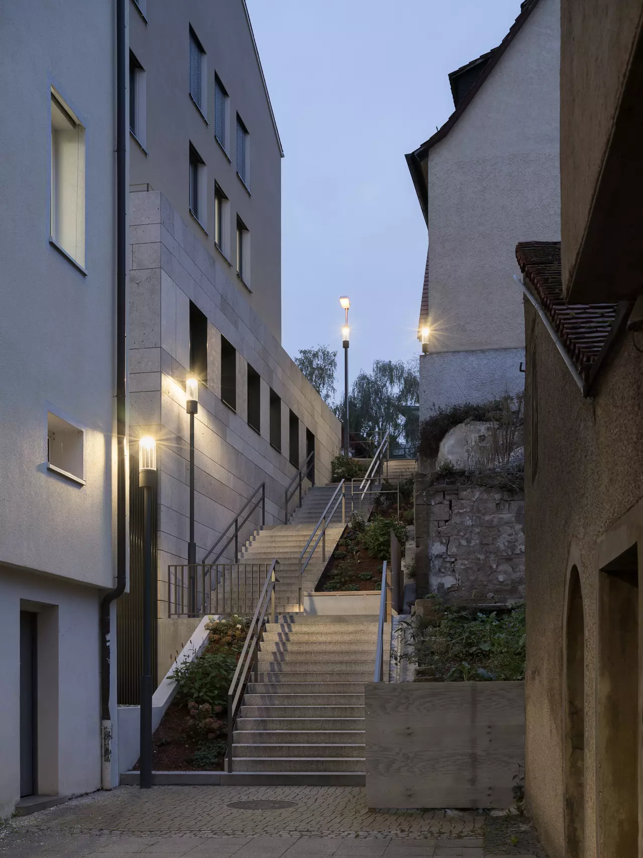 Ein architektonisches Juwel ist das historische Rathaus am Marktplatz der Stadt Rottenburg. Der Barockbau nach dem Entwurf des Vorarlberger Baumeisters Johann Felder gibt dem Marktplatz der charmanten Kleinstadt seinen Charakter. Auf der Rückseite befindet sich ein unauffälliges Bauwerk aus den 1960er Jahren, welches als Wohngebäude für Senioren errichtet und in den letzten Jahren sukzessive zum Verwaltungsgebäude umgebaut wurde. Da es keine Anbindung an das historische Rathaus gab, wünschte sich die Stadt Rottenburg eine Erweiterung als barrierefreie Verbindung beider Gebäude mit zusätzlichem Eingang an der Oberen Gasse. Mit dem Erweiterungsbau konnte eine Baulücke geschlossen und eine wichtige Treppenverbindung im Stadtkern erhalten werden.