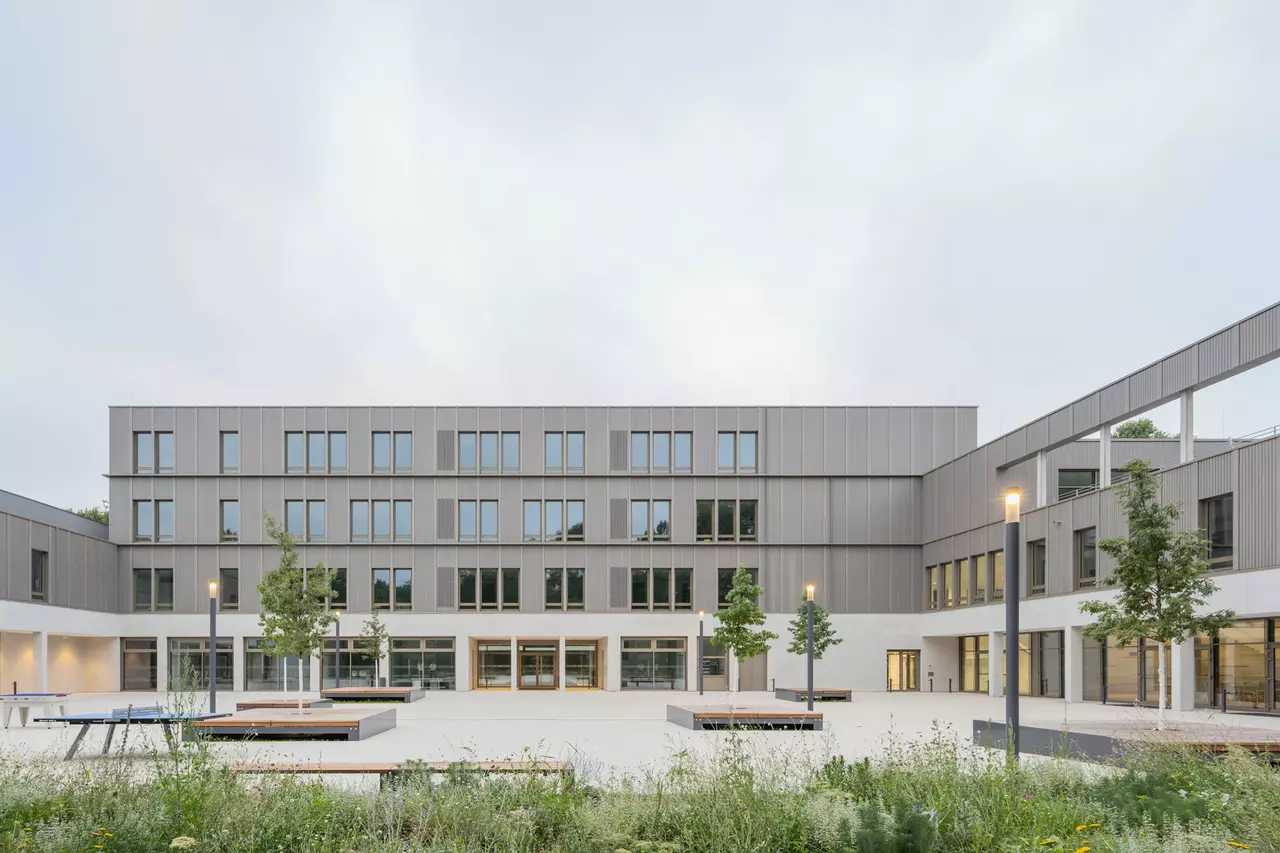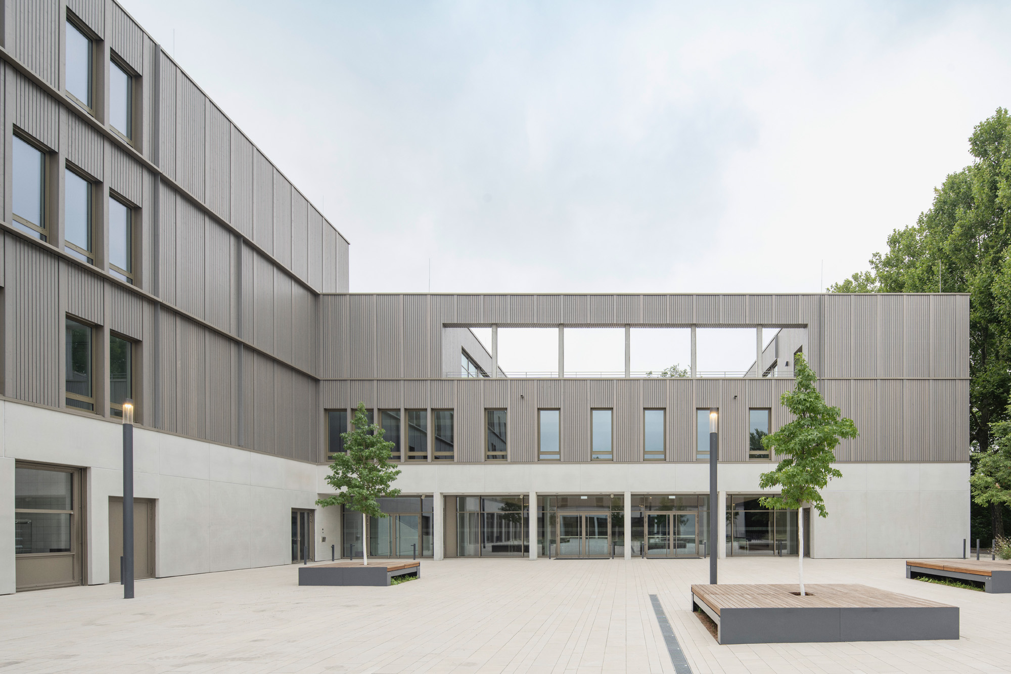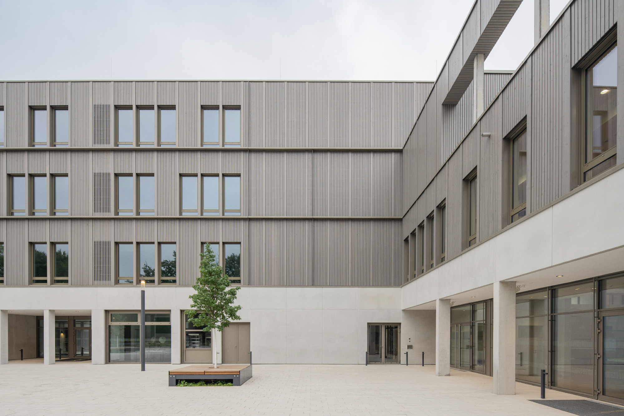 Auffallend ist die ruhige, graphitsilbern lasierte Fassade aus gehobelter nordischer Fichte mit klar ablesbaren Stockwerken und vertikalen schmalen Holzbrettern, die sich an der Außenfassade mit breiteren Brettern abwechseln. Innerhalb des strengen Rasters lassen zahlreiche schlanke Fenster viel Tageslicht in die Innenräume. Die Profile der Holz-Aluminium-Fenster sind, ebenso wie die mit Trapezblech verkleidete Fassade der Innenhöfe des Cluster- und des Mensagebäudes, auf die Farbe der Außenfassade abgestimmt. Elegant in die Außenfassade eingearbeitet sind die Auslässe der Lüftungsanlage in den Unterrichtsräumen. Sie führen in Größe und Position die Fensterreihen fort und sind lediglich durch die lamellenartig verschmälerten Holzbretter der Fassade zu erahnen. Unterbrochen wird das Raster der Holzfassade durch den akzentuierten Sichtbetonrahmen des Haupteingangs sowie das Sockelgeschoss aus Sichtbeton und durch den gerahmten Blick in den Dachgarten des Mensagebäudes.