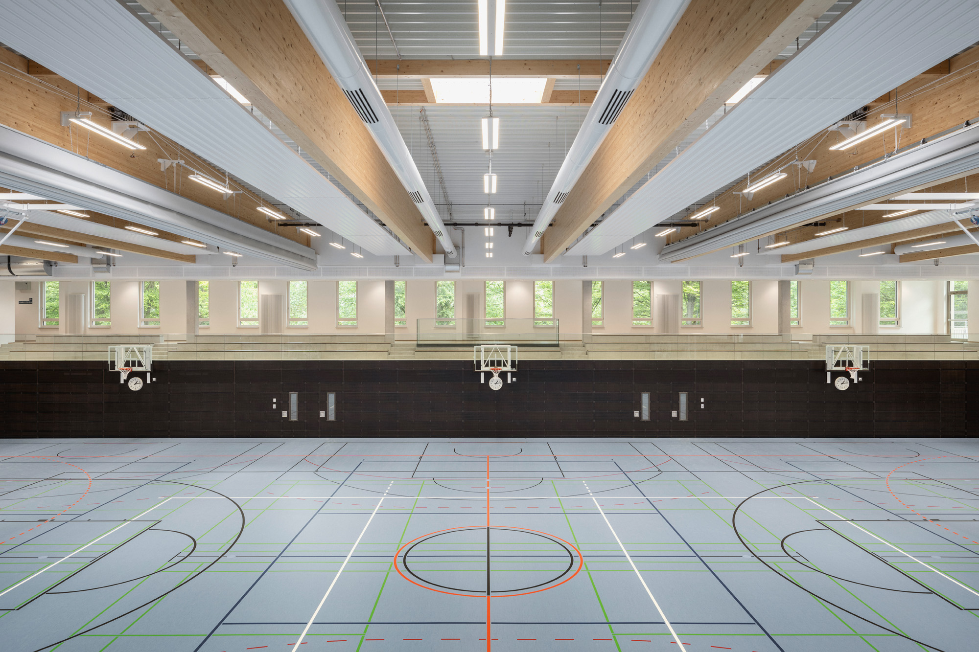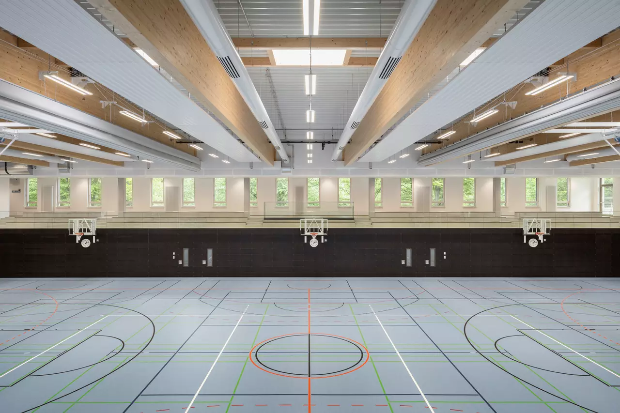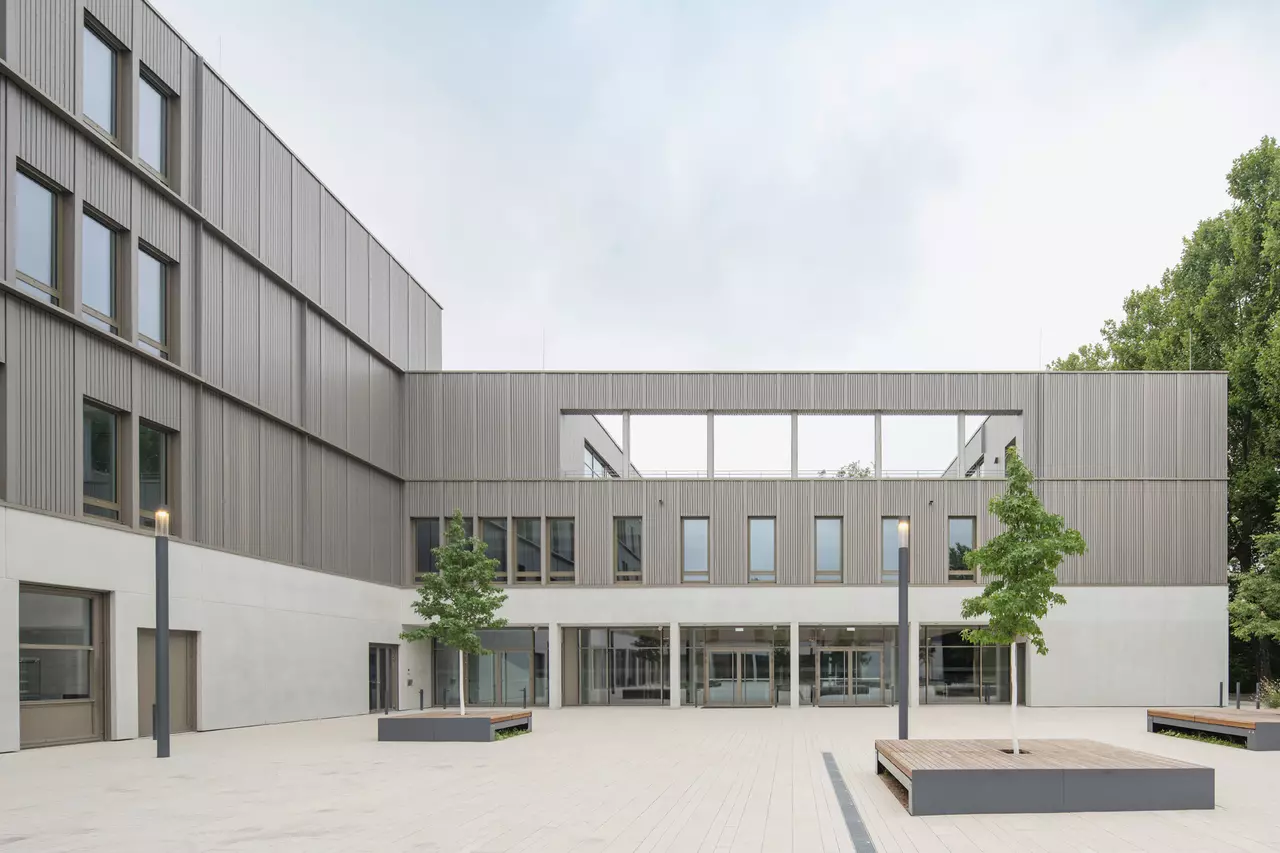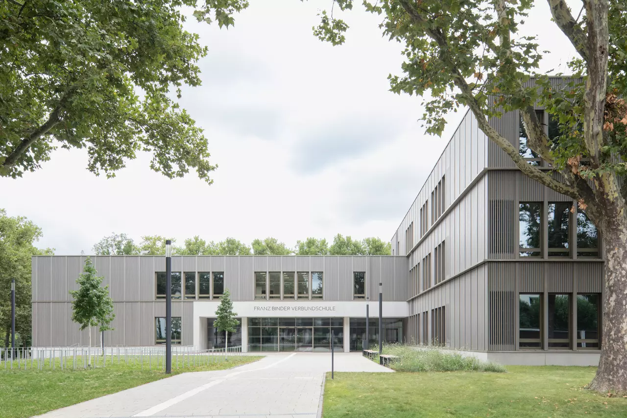 Auffallend ist die ruhige, graphitsilbern lasierte Fassade aus gehobelter nordischer Fichte mit klar ablesbaren Stockwerken und vertikalen schmalen Holzbrettern, die sich an der Außenfassade mit breiteren Brettern abwechseln. Innerhalb des strengen Rasters lassen zahlreiche schlanke Fenster viel Tageslicht in die Innenräume. Die Profile der Holz-Aluminium-Fenster sind, ebenso wie die mit Trapezblech verkleidete Fassade der Innenhöfe des Cluster- und des Mensagebäudes, auf die Farbe der Außenfassade abgestimmt. Elegant in die Außenfassade eingearbeitet sind die Auslässe der Lüftungsanlage in den Unterrichtsräumen. Sie führen in Größe und Position die Fensterreihen fort und sind lediglich durch die lamellenartig verschmälerten Holzbretter der Fassade zu erahnen. Unterbrochen wird das Raster der Holzfassade durch den akzentuierten Sichtbetonrahmen des Haupteingangs sowie das Sockelgeschoss aus Sichtbeton und durch den gerahmten Blick in den Dachgarten des Mensagebäudes.