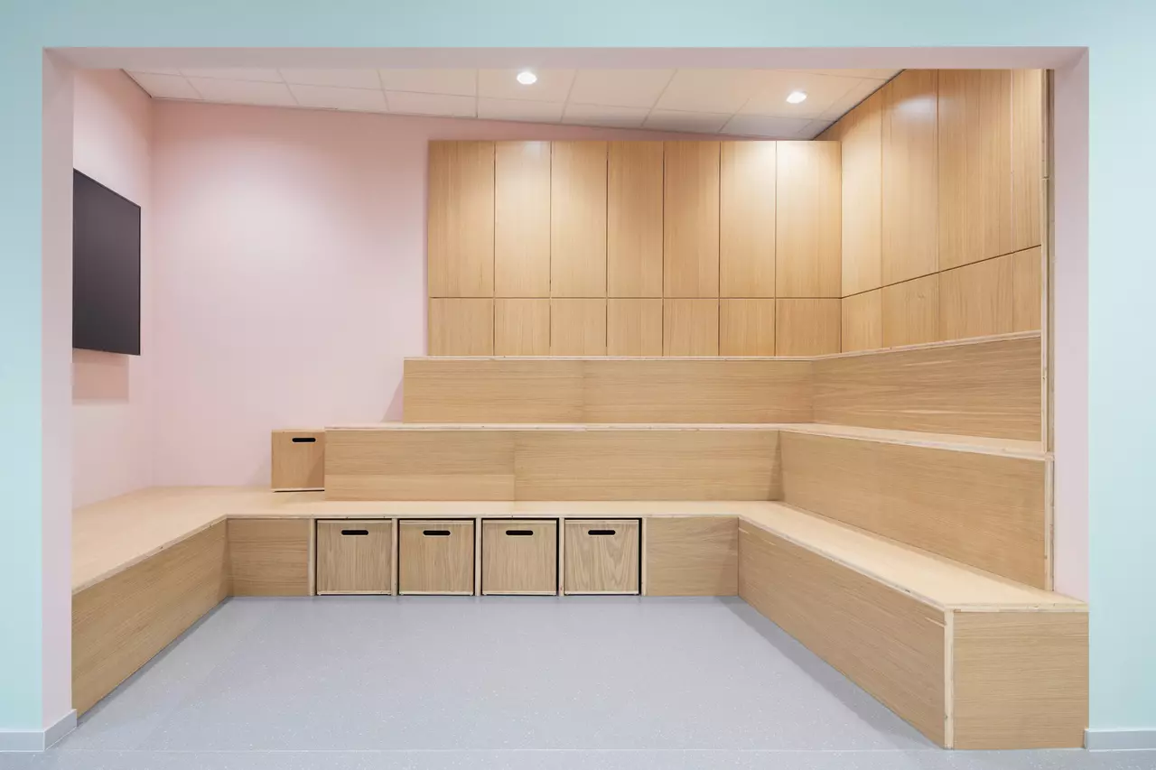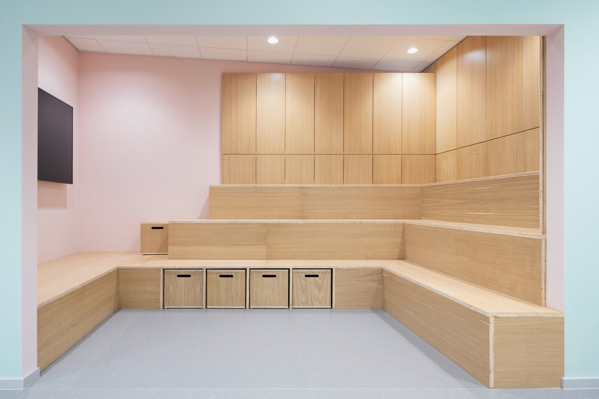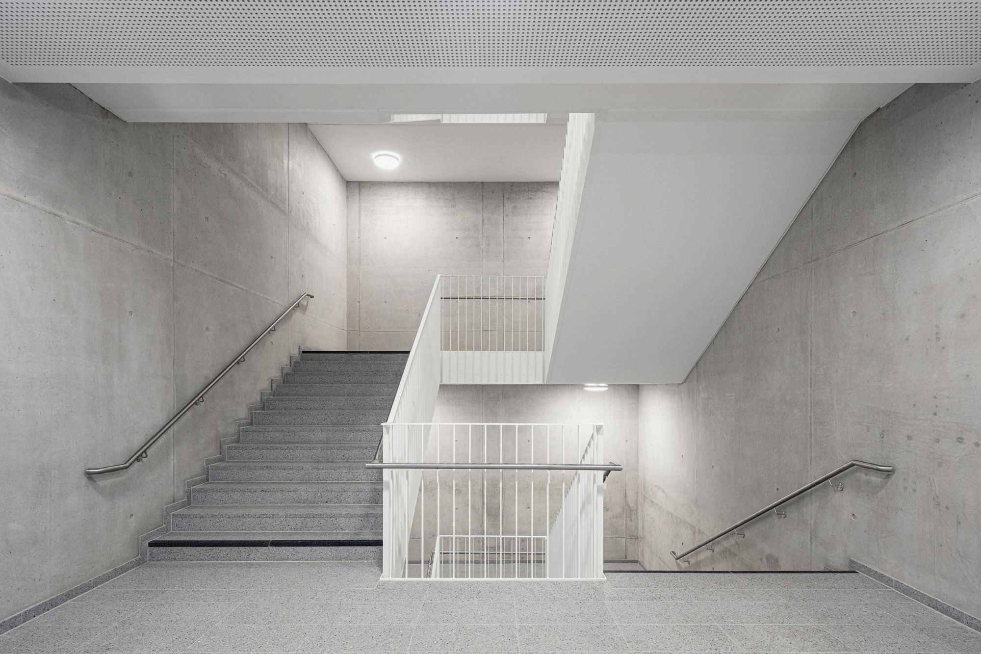 In enger Abstimmung mit den Pädagoginnen und Pädagogen der Franz-Binder-Verbundschule haben wir das Konzept der Cluster-Schule und der Lernlandschaften realisiert. Dieses setzt auf eine offene Raumstruktur, die flexible Nutzungsmöglichkeiten für eine individuelle Förderung der Kinder und Jugendlichen schafft. Insbesondere an einer Verbundschule sind diese Differenzierungsmöglichkeiten im Lern- und Lehralltag von essentieller Bedeutung. Im Clustergebäude sind je zwei Cluster, das heißt zwei Jahrgangsstufen, pro Geschoss verortet, wobei die Lernräume jeweils L-förmig an der Außenfassade entlanglaufen und sich das dazugehörige Lernatelier zum Lichthof hin öffnet. Eingestellte Coachingräume unterteilen die Lernbereiche und schaffen differenzierte Orte zum individuellen Lernen. Wie zum Beispiel die mit hölzernen Sitzstufen ausgestatteten Räume am Eingang jedes Clusters, die für Treffs, Diskussionen oder das Üben von Präsentationen genutzt werden können.