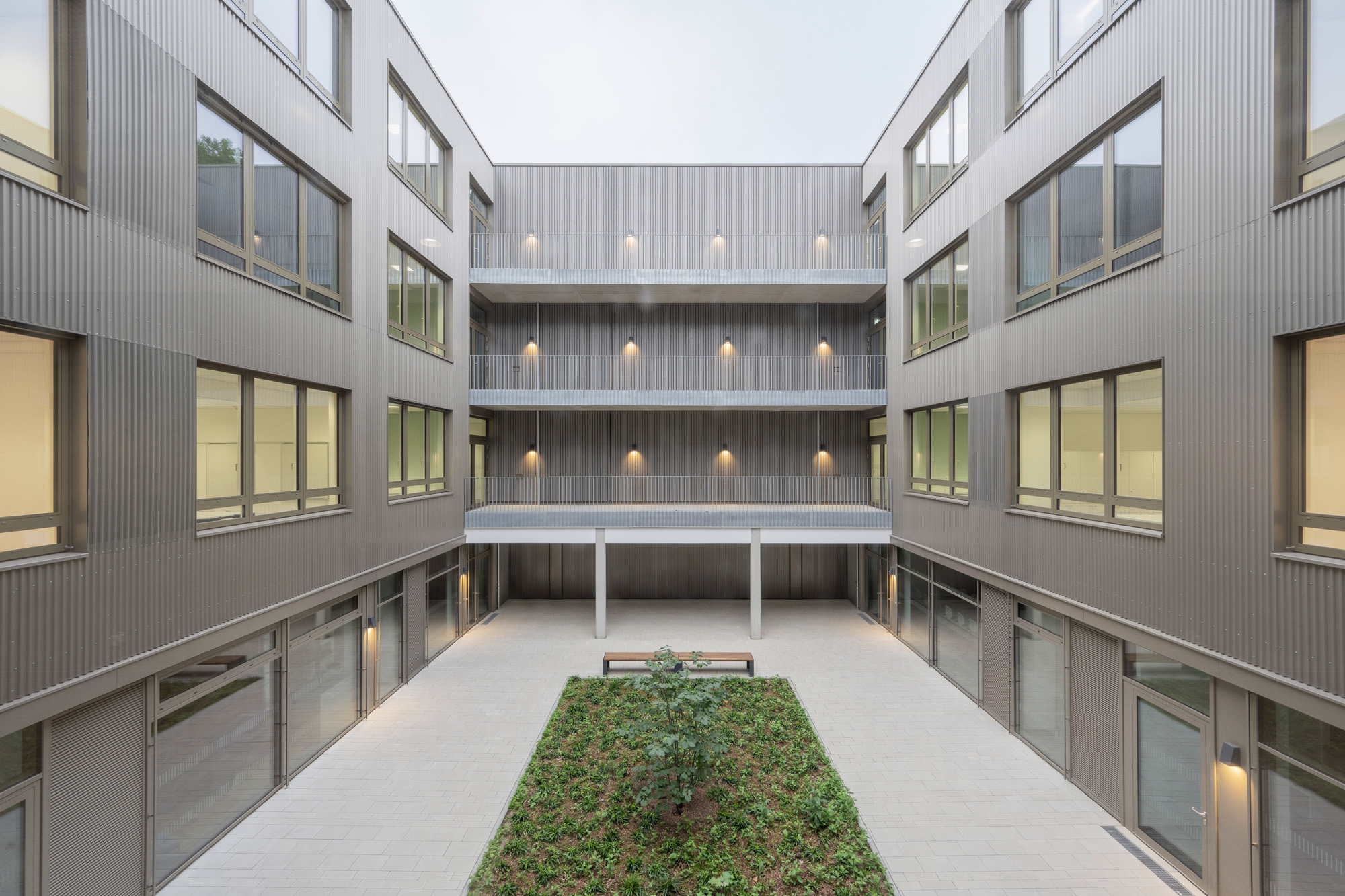 Eine „Schulstraße“ durchzieht das Clustergebäude entlang des Innenhofes, erschließt die verschiedenen Clusterbereiche und gewährt Einblicke in die Lernateliers. Die Klassen fünf und sechs befinden sich im Erdgeschoss, während die Jahrgänge sieben und acht im zweiten Stock untergebracht sind und die neunten und zehnten Klassen im obersten Stockwerk lernen.