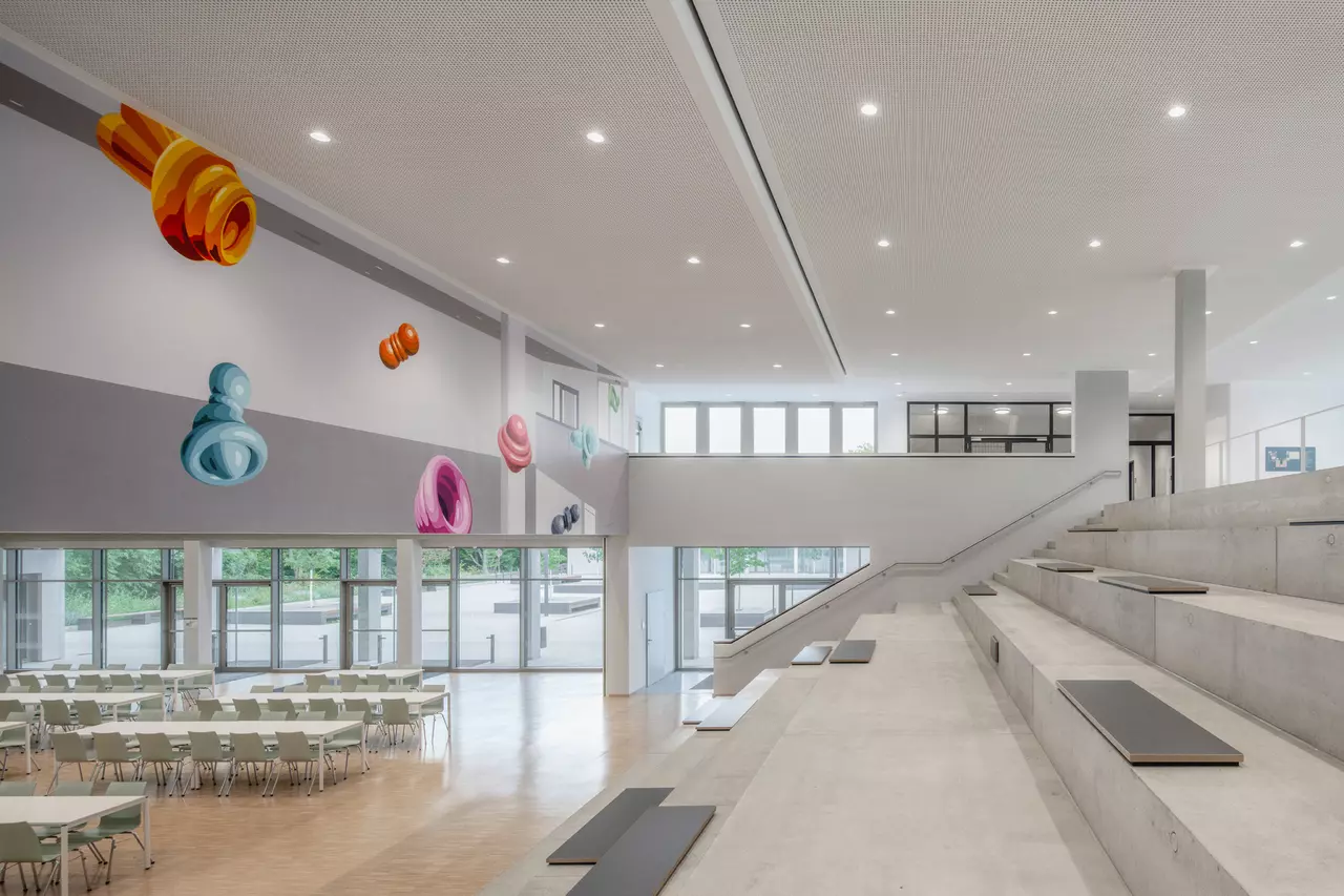 Das Mensagebäude verbindet mit seinem zweigeschossigen Foyer den Haupteingang auf der Vorplatzebene mit der Mensa im Sockelgeschoss und dem angrenzenden Pausenhof. Eine großzügige Sitzstufenanlage als Herz der Schule und zentralem Aufenthaltsbereich dient der fest installierten Bühne in der Mensa bei Veranstaltungen als erweitertes Auditorium. Die großflächige Wandmalerei der Künstlerin Patricia London Ante Paris "Das Fliegende Foyer" ist eine gekonnte Reflektion des Raumes und verleiht ihm durch bunte skulpturale Objekte eine dynamische Bewegtheit. Ein direkter Ausgang führt von der Mensa aus ins Freie, sodass die Schülerinnen und Schüler bei gutem Wetter draußen essen können. Zudem ist die Mensa bei externen Veranstaltungen eigenständig über den Pausenhof zugänglich.