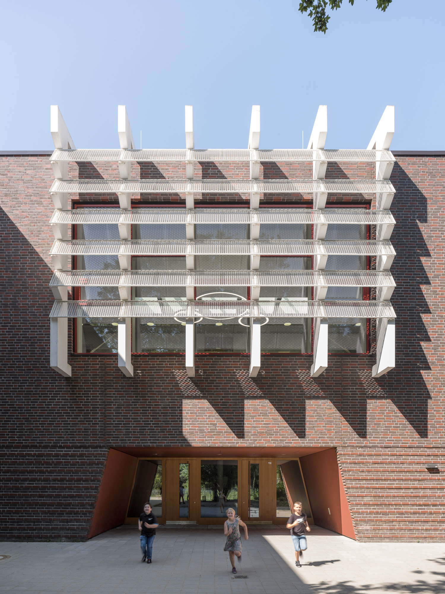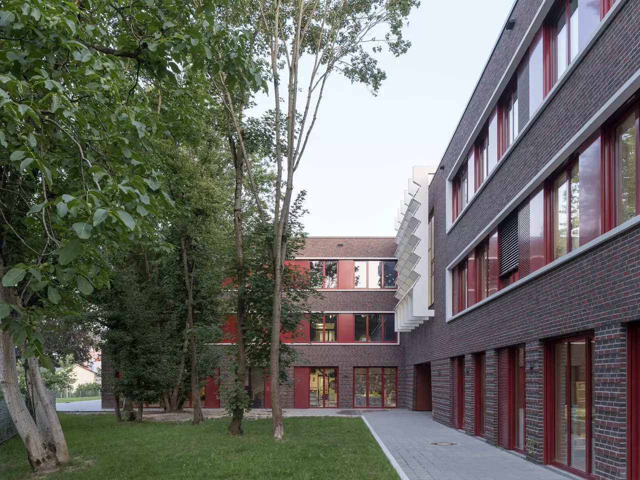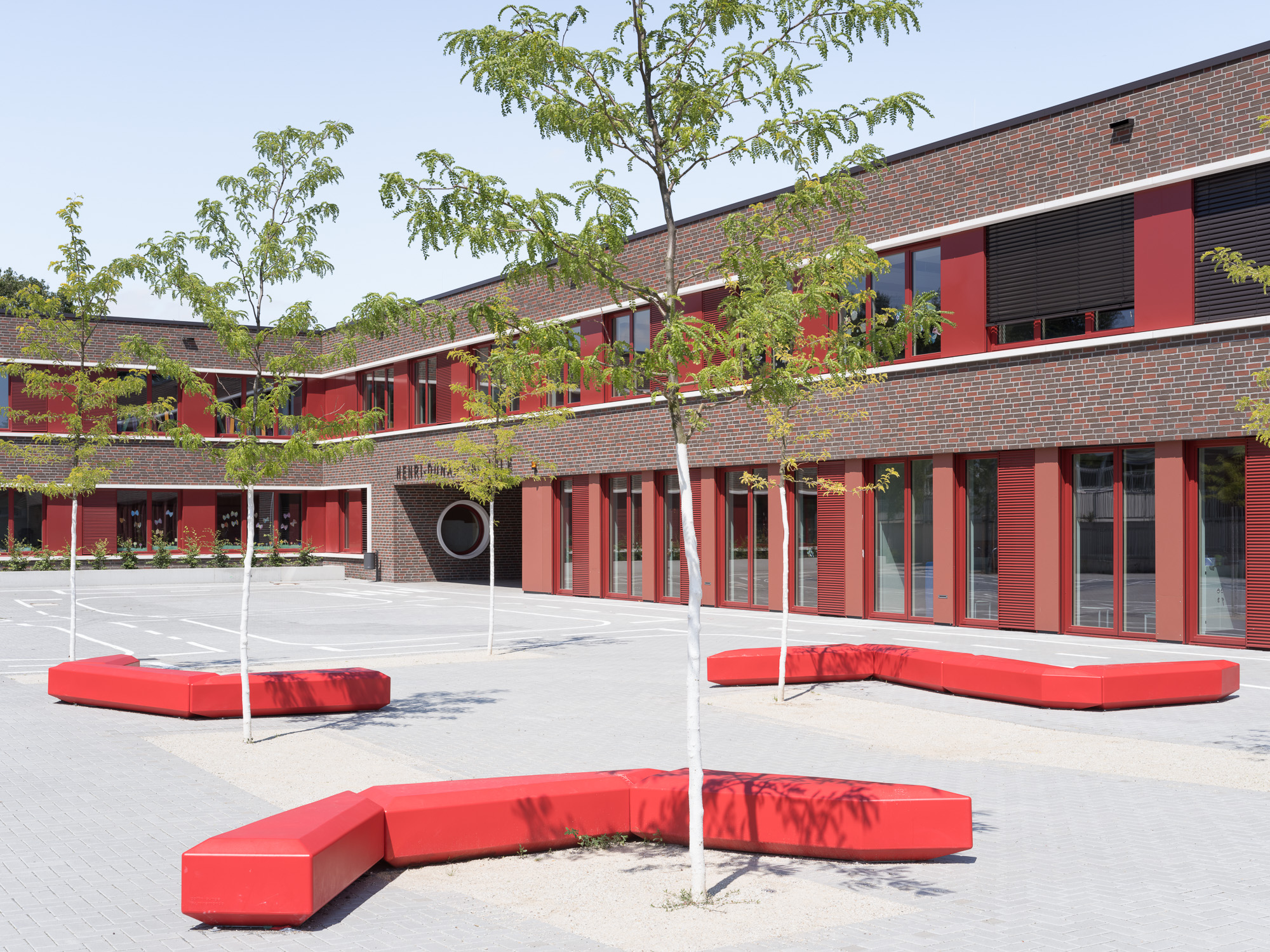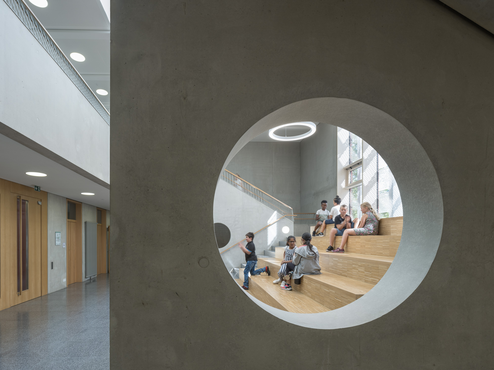 Der nutzergerechte Gestaltungsansatz spiegelt sich auch in der Materialwahl und Ausstattung des Schulgebäudes wider. Außen dominiert das Farbspiel der klinkerbekleideten Wandflächen und roten Fassadenpaneele zwischen Holz-Alu-Fenstern, die als lange Bänder die Schauseiten horizontal gliedern. Das zentrale, zweigeschossige Foyer ist bis zur Gartenseite durchgesteckt und mündet in einer großzügigen Verglasung samt einem Brise Soleil aus Weißbeton-Fertigteilen. Im Inneren präsentiert sich das Gebäude als bunt bespielbare, neutrale Kulisse in Sichtbeton und Eichenholz. Dabei lädt unter anderem die breite Treppe im Foyer samt holzbekleideter Sitzstufen sowie die großzügigen Mittelzonen der Lerncluster zum vielfältig gestaltbaren Aufenthalt ein.