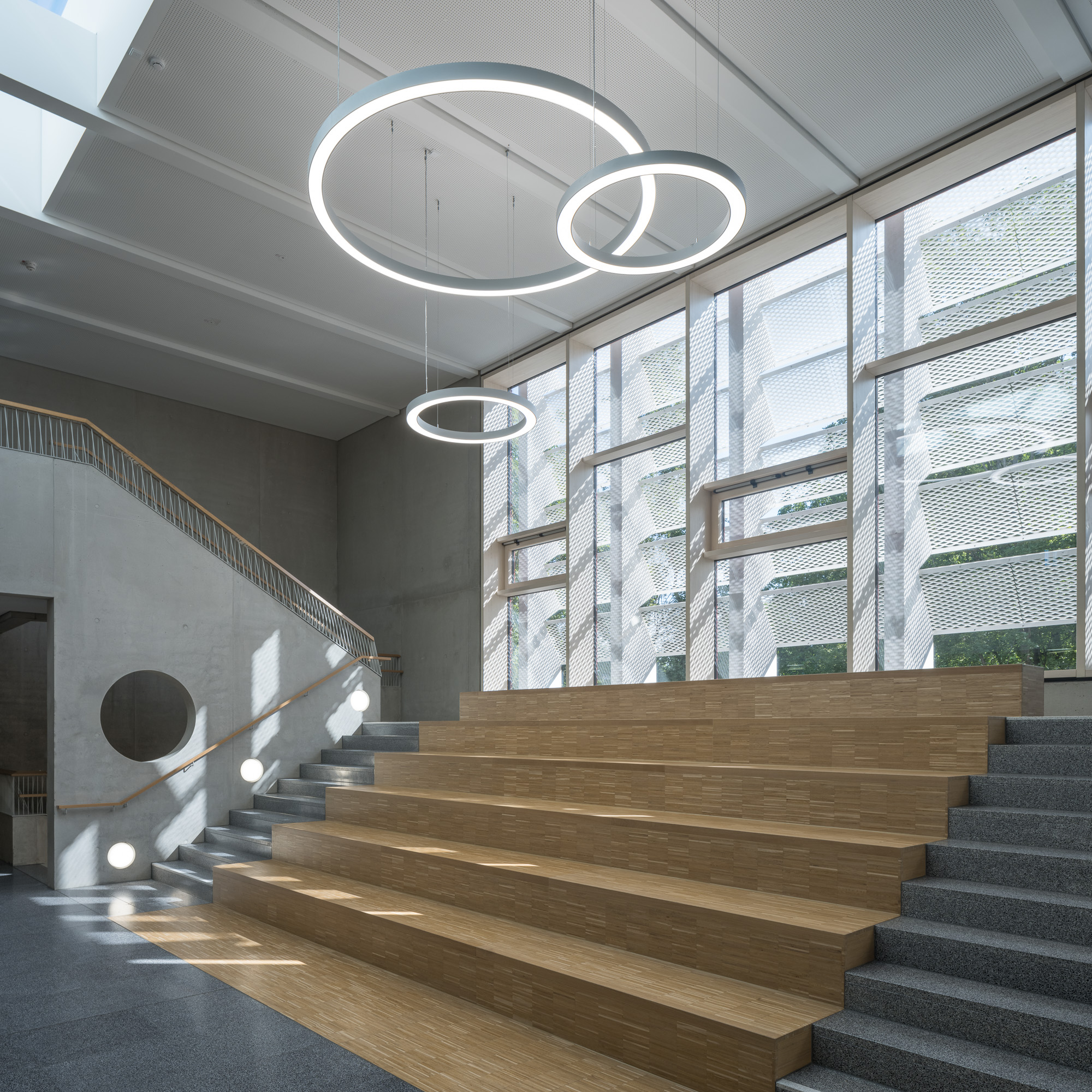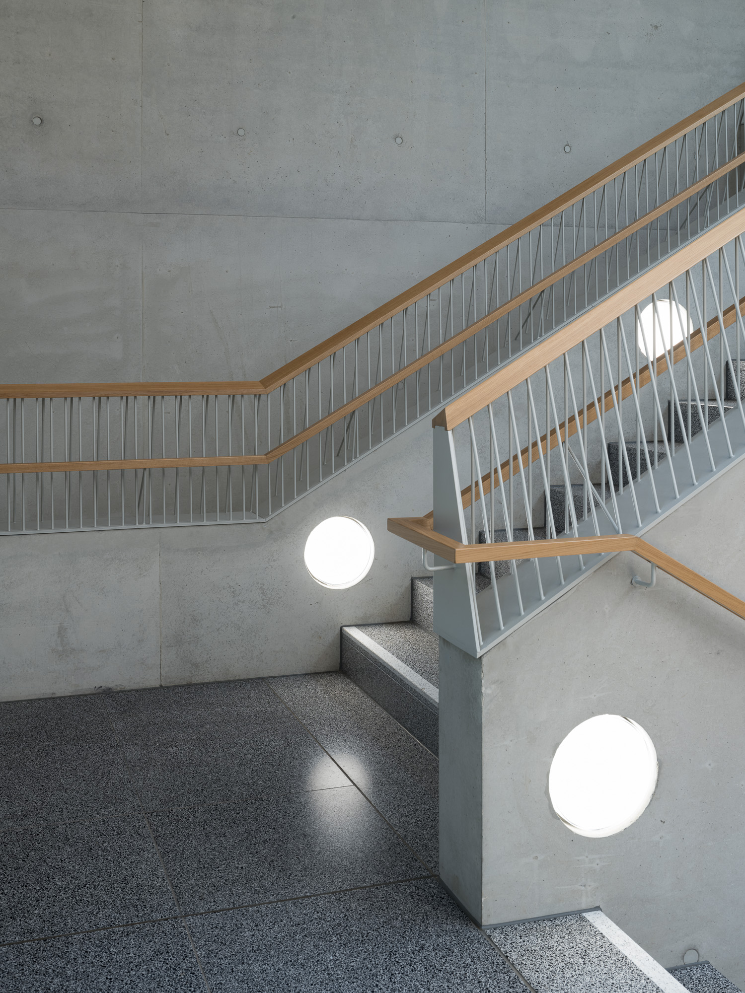 Bei der Wahl der Materialien legten wir insbesondere auf langlebige und strapazierfähige Eigenschaften im Sinne einer nachhaltigen Gebäudenutzung Wert. Bauteile sind weitgehend gefügt und nicht verklebt, um die Möglichkeit einer Rückbau- und Wiederverwendbarkeit zu gewährleisten. Die Ausführung der Gebäudehülle und der Energieverbrauch der eingesetzten Gebäudetechnik für Lüftung und Beleuchtung entsprechen dem Passivhaus-Standard. Aus Gründen der Effizienz und vorhandenen Kapazitäten erfolgte ein Anschluss der Schule an die bestehende Heizzentrale auf dem Schulcampus. Tagsüber sorgt eine Lüftungsanlage mit Wärmerückgewinnung für die nötige Frischluftzufuhr, während nachts bei Bedarf eine natürliche Belüftung über Nachtlüftungsklappen erfolgen kann, um die thermischen Speichermassen zu entwärmen. Das Dach ist vollflächig begrünt und mit einer Photovoltaik-Anlage zur Stromgewinnung ausgestattet.