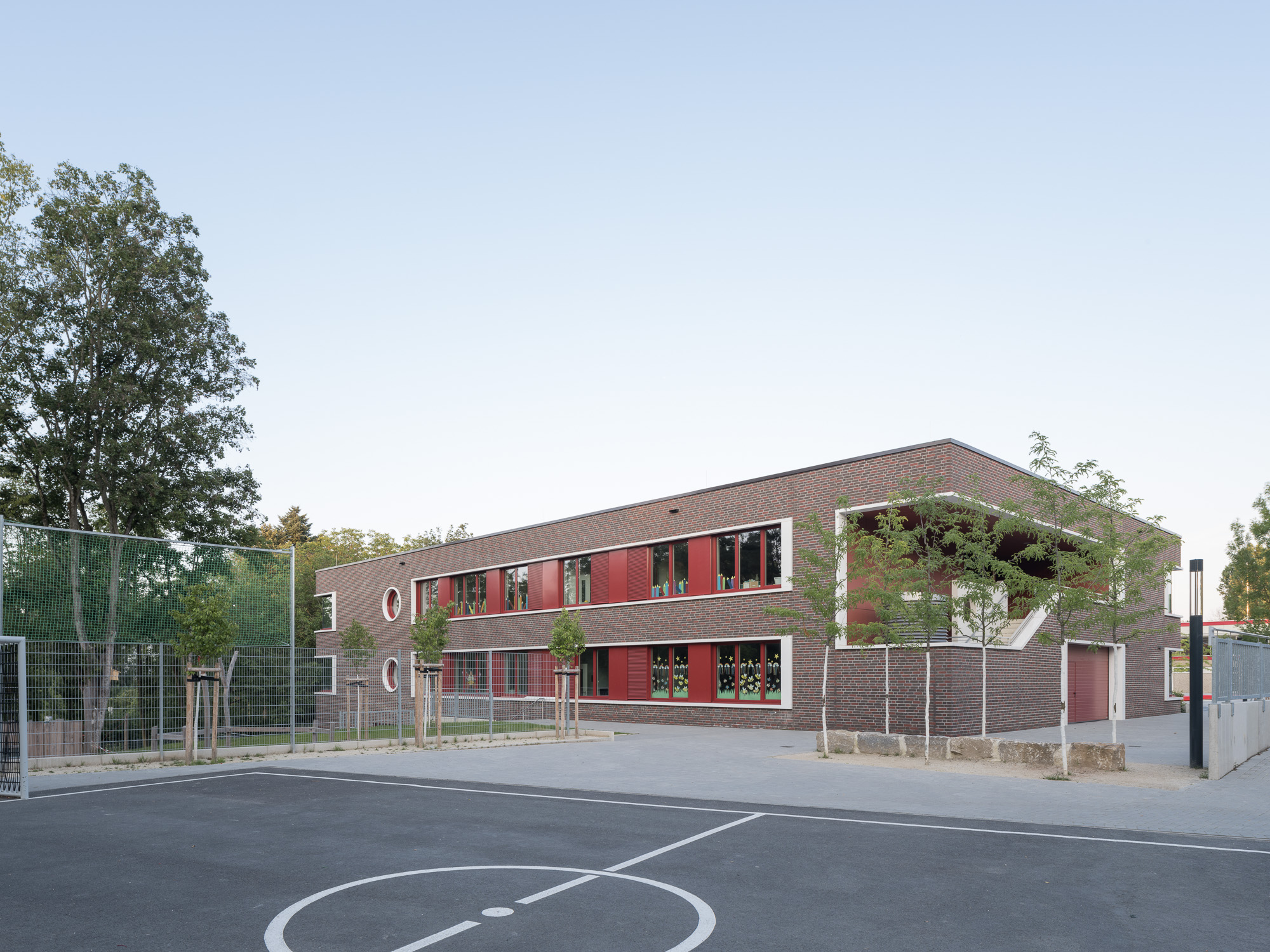 Grundidee war es, das Gebäude an eine bestehende Hangkante zu stellen und die Topografie auszunutzen. Die besondere Positionierung des doppelt abgewinkelten, langgezogenen Baukörpers auf dem Campus schafft neue Außenraumsituationen. An der Westseite umschließt die Grundschule nun gemeinsam mit der Sporthalle und Mensa den „städtischen Pausenhof“, der mit Baumbepflanzung, Sitzgruppen und Straßenmarkierungen für die Verkehrserziehung ausgestattet ist. Von hier aus wird das zur Westseite hin zweigeschossige Grundschulgebäude zentral erschlossen. Nach Osten hingegen ist aufgrund der Hanglage ein weiteres Gartengeschoss eingefügt, das sich zu einem parkartigen Freigelände mit üppiger Bepflanzung sowie integrierten Sport- und Spielgeräten öffnet. An dieser Stelle gewährleistet eine lange Rampenanlage die barrierefreie Erschließung, die über das gesamte Gelände gegeben ist.
