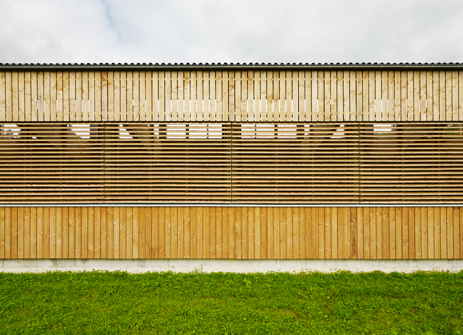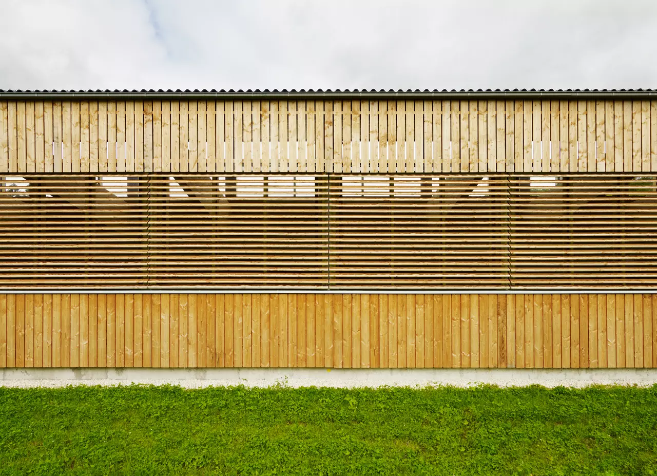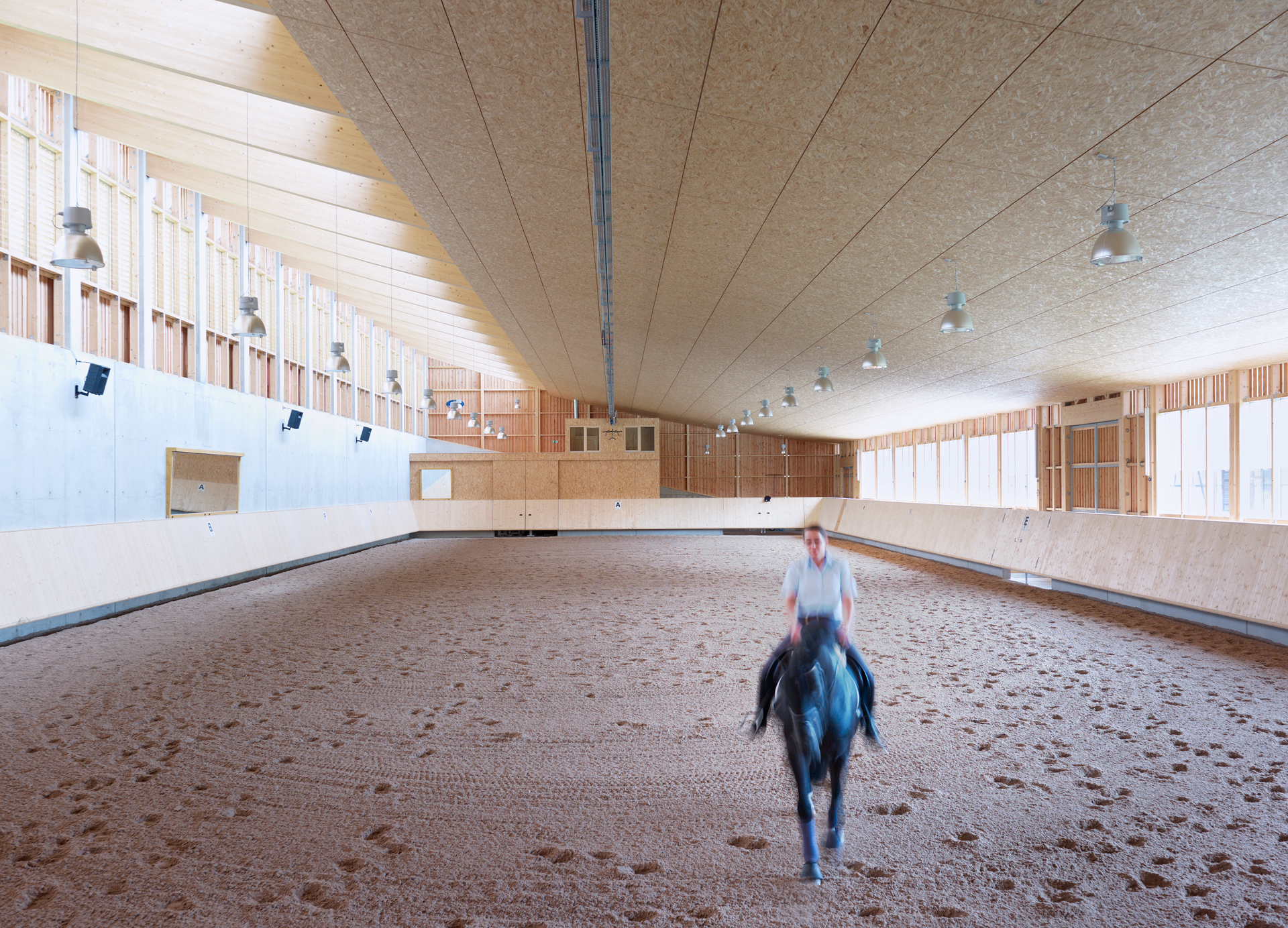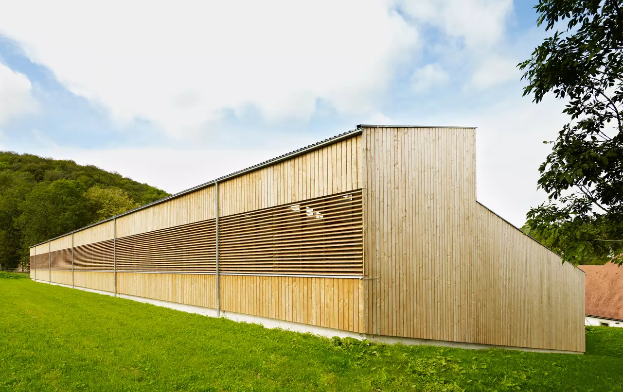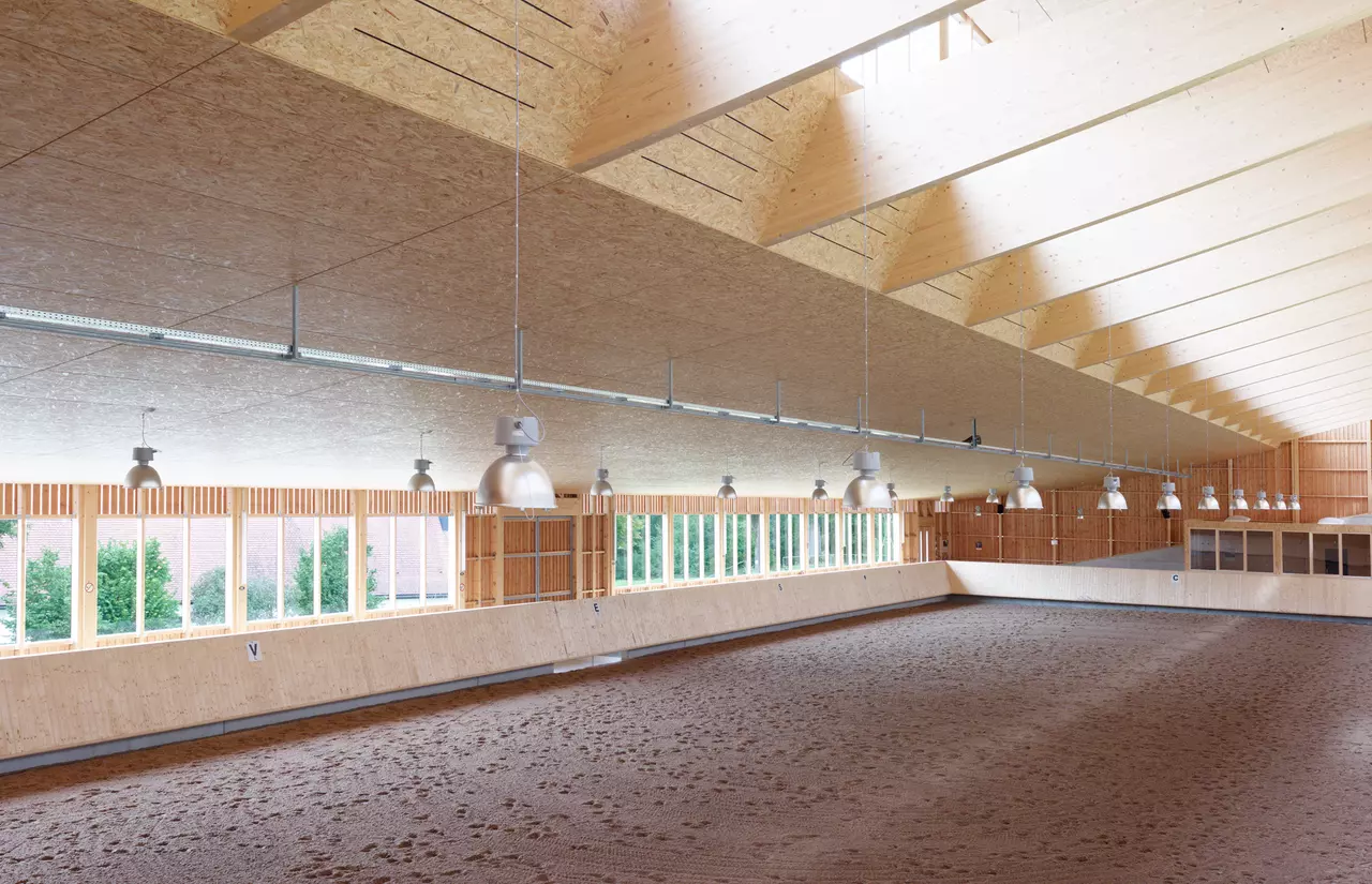 Die Reithalle fügt sich in das ansteigende Gelände südlich der ehemaligen Klosteranlage ein. Die Bauform wird von der Hangsituation abgeleitet – das Gebäude erhält ein parallel zum Hang ansteigendes Pultdach mit Gegenpult und Oberlichtband. Durch das Gegenpult reduziert sich die Ansichtsfläche des Daches, das Erscheinungsbild des Baukörpers wird minimiert, das Gebäude integriert sich harmonisch in den Hang. An der Nordfassade befinden sich große Glasflächen, die den Blick in die Halle und von innen die Aussicht auf die historische Klosteranlage ermöglichen.
