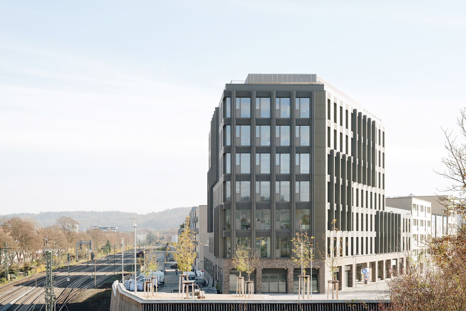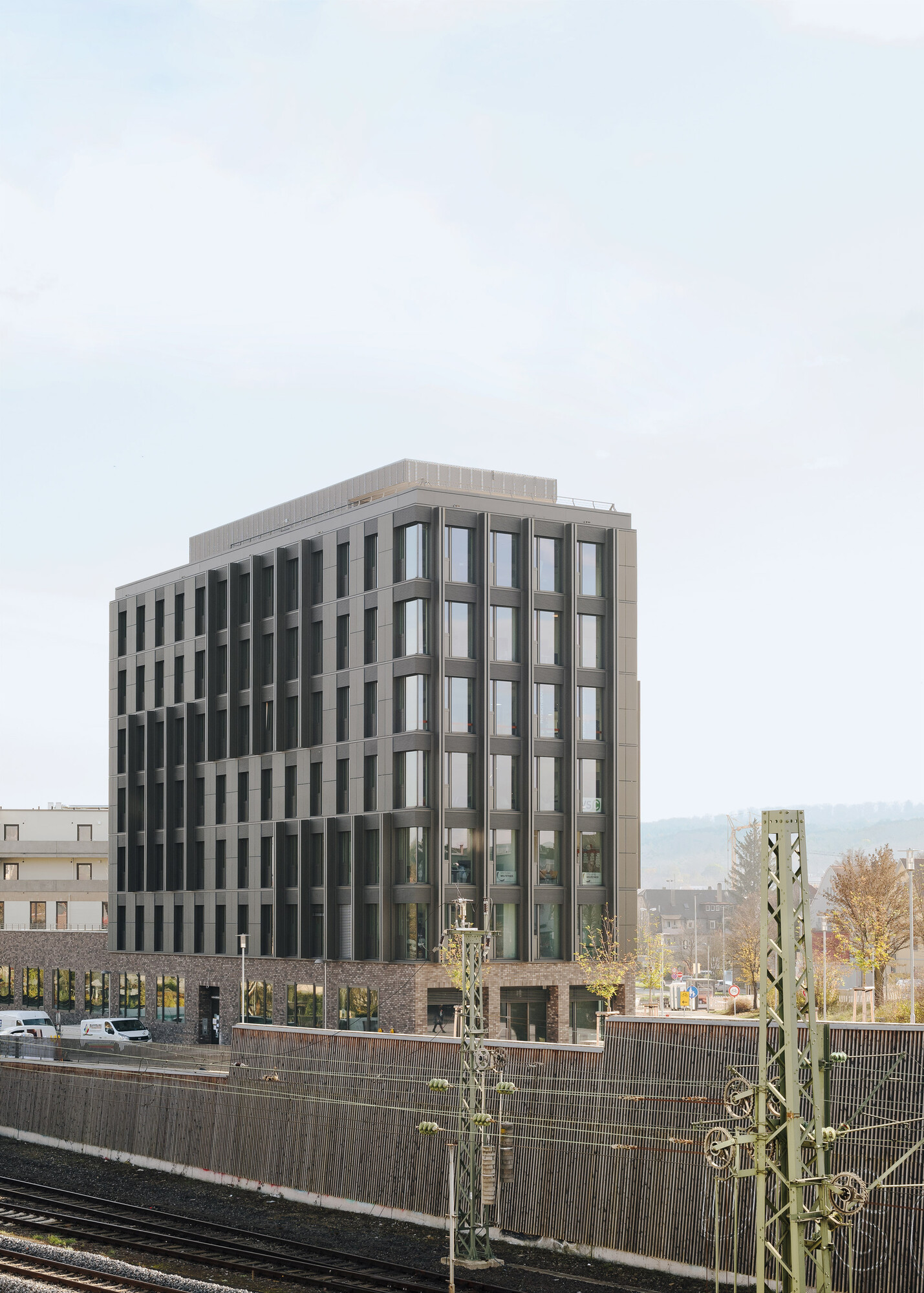 Zu Beginn der Planung stellten sich verschiedene Herausforderungen, angefangen beim Grundstück in Form eines schiefwinkligen Baufeldes. Auch die Fassadengestaltung erforderte eine innovative Lösung. Mit neuartigen Dünnschicht-Solarpaneelen ist es gelungen, eine energieerzeugende Fassade zu realisieren, ohne diese allzu technisch wirken zu lassen. Die farbig beschichteten PV-Elemente wurden in eine vorgehängte Fassade aus pulverbeschichteten Aluminiumblechen integriert und changieren farblich je nach Lichteinfall. Dieser spezielle, bronzefarbene Schimmer verleiht dem Gebäude eine besondere Ausstrahlung.