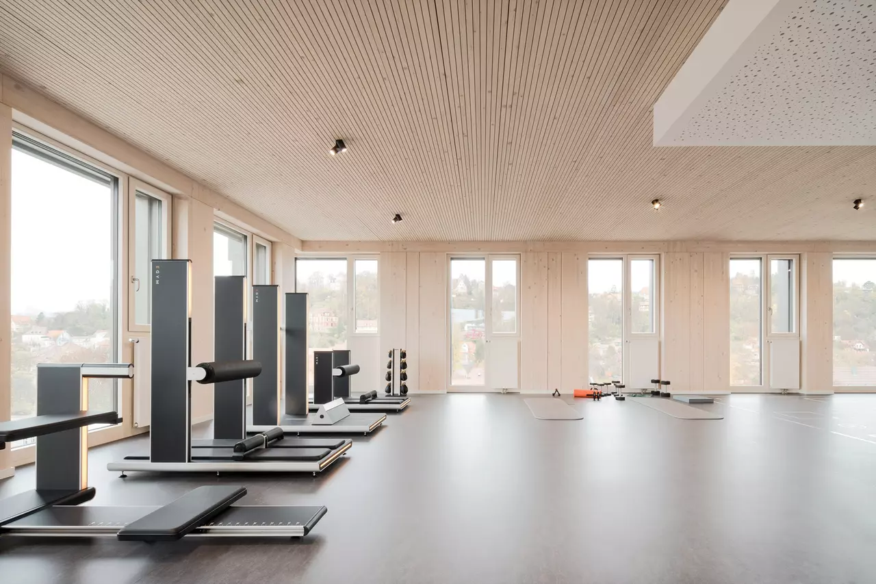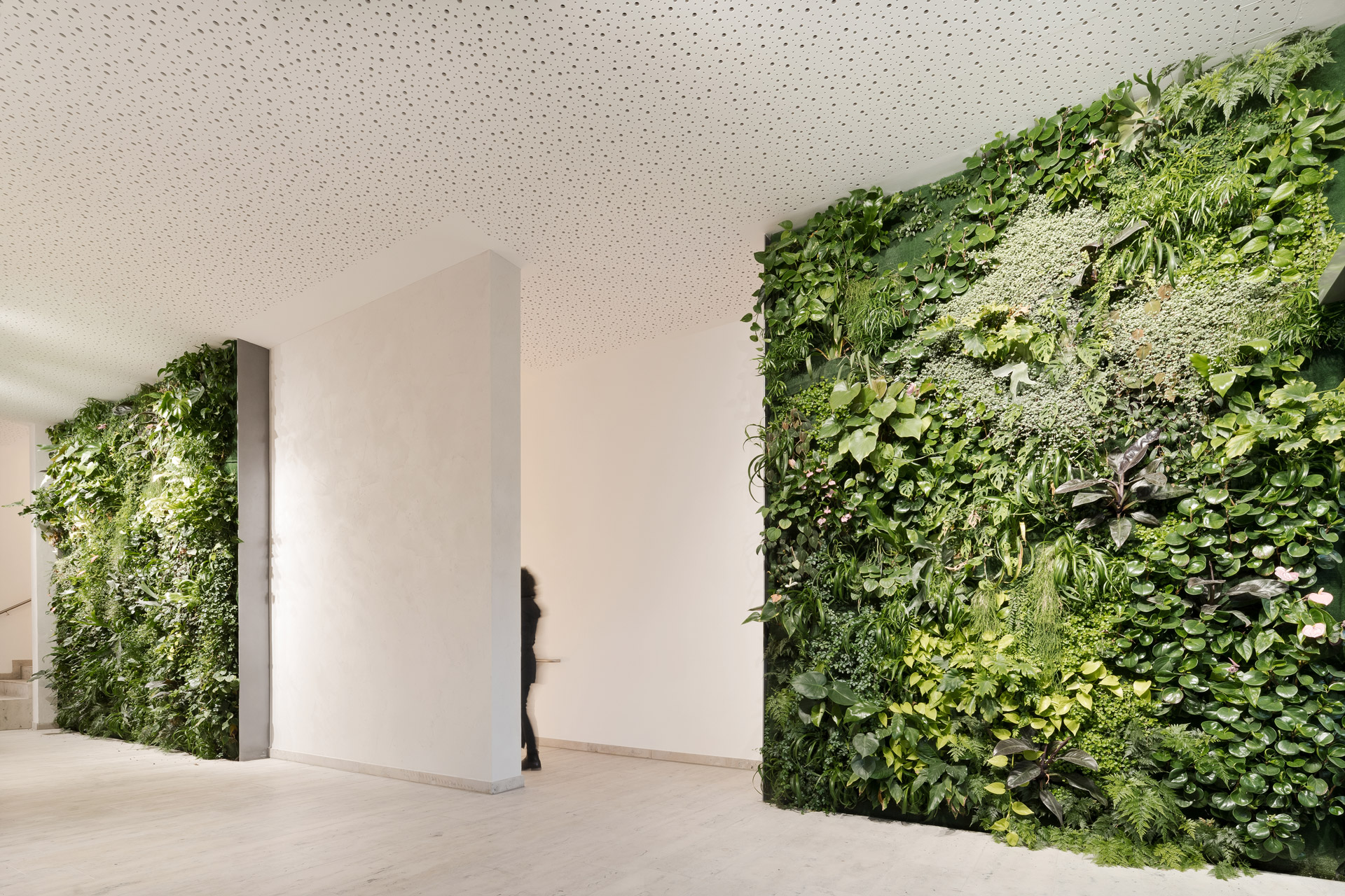 Auch die Innenarchitektur mit 4.500 Quadratmetern Gewerbefläche ist Ausdruck der klimagerechten Bauweise. Vertikale Gärten empfangen die Besucher auf jeder Ebene mit vielerlei Regenwaldpflanzen, die unmittelbares Wohlbefinden hervorrufen und eine angenehme Gewächshausatmosphäre verbreiten. Zwar sieht man dem Gebäude von außen nicht an, dass es sich um einen Holzbau handelt, im Inneren wird die Holz-Verbund-Bauweise jedoch erlebbar. An der Unterseite der Decken und den Stützen entlang der Fassade wurde das Holz sichtbar belassen. Raumhohe Verglasungen lassen viel Tageslicht in die Räume und schaffen ein Gefühl von Weite. Ein großer Saal im Erdgeschoss bietet vielfältige Optionen für jede Art von Veranstaltungen, während auf der 7. Etage ein großer Gemeinschaftsraum samt Terrasse zur Verfügung steht. Mieter im neuen Gewerbeturm sind unter anderem das renommierte Welt-Ethos-Institut, Consulting-Unternehmen, Arztpraxen und ein Anbieter von Co-Working Spaces.