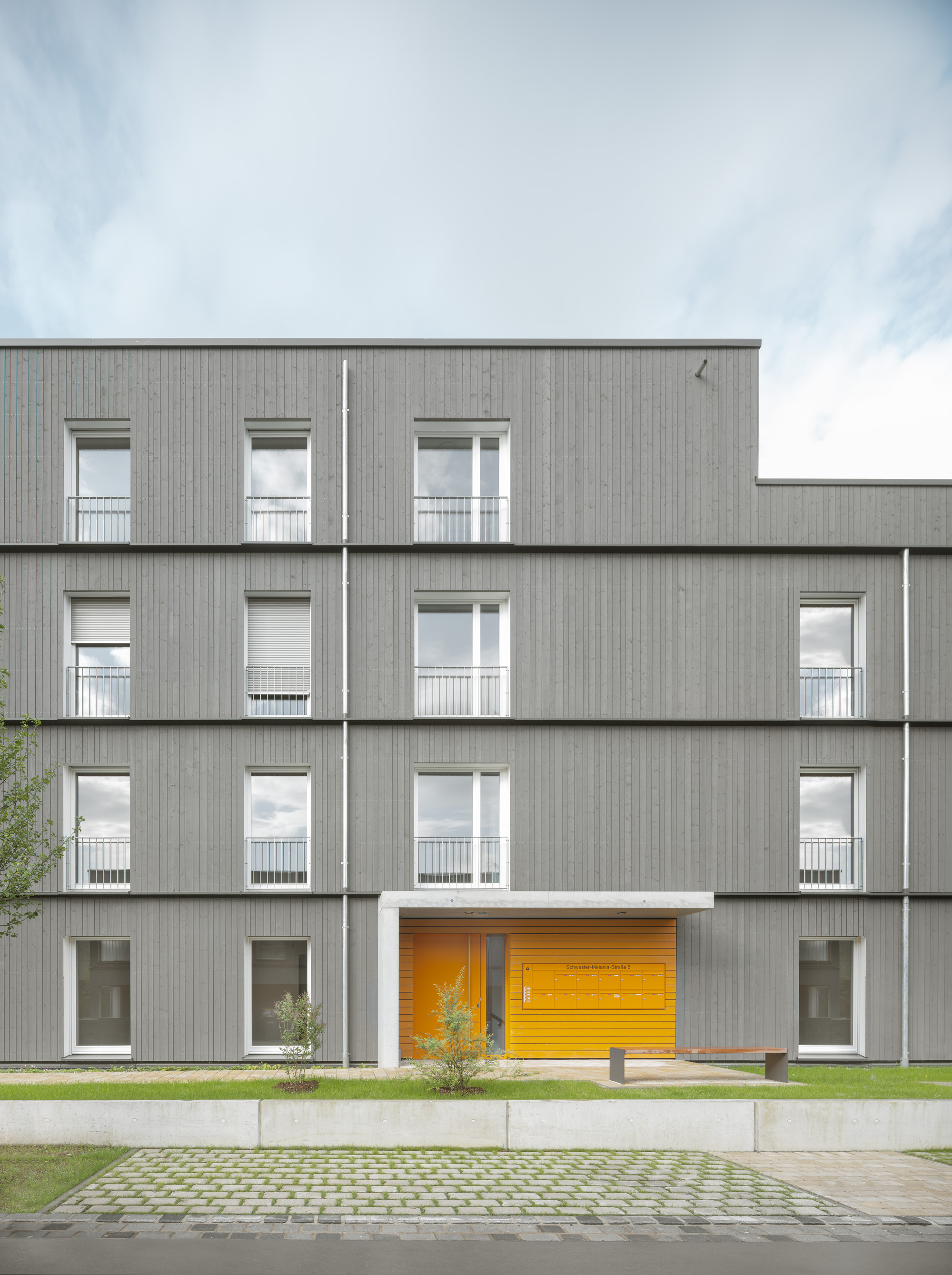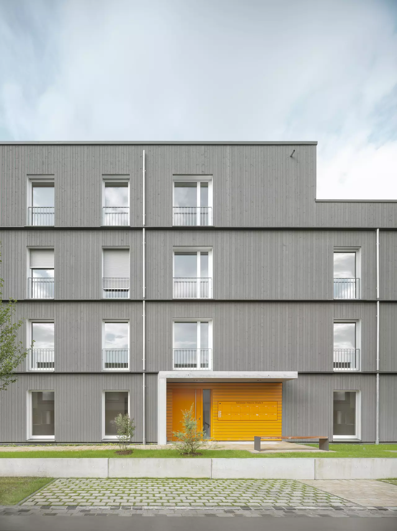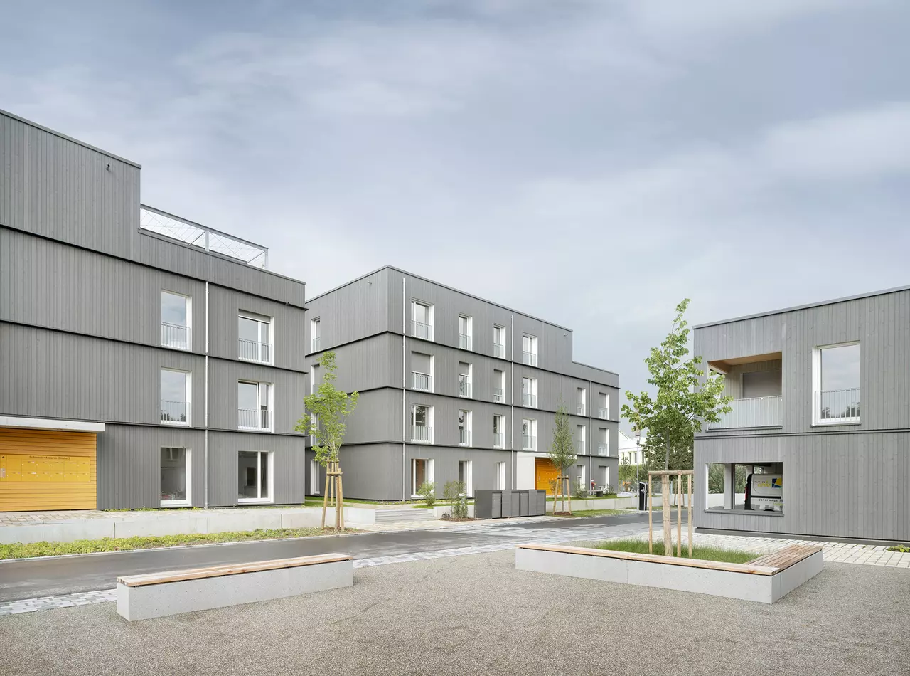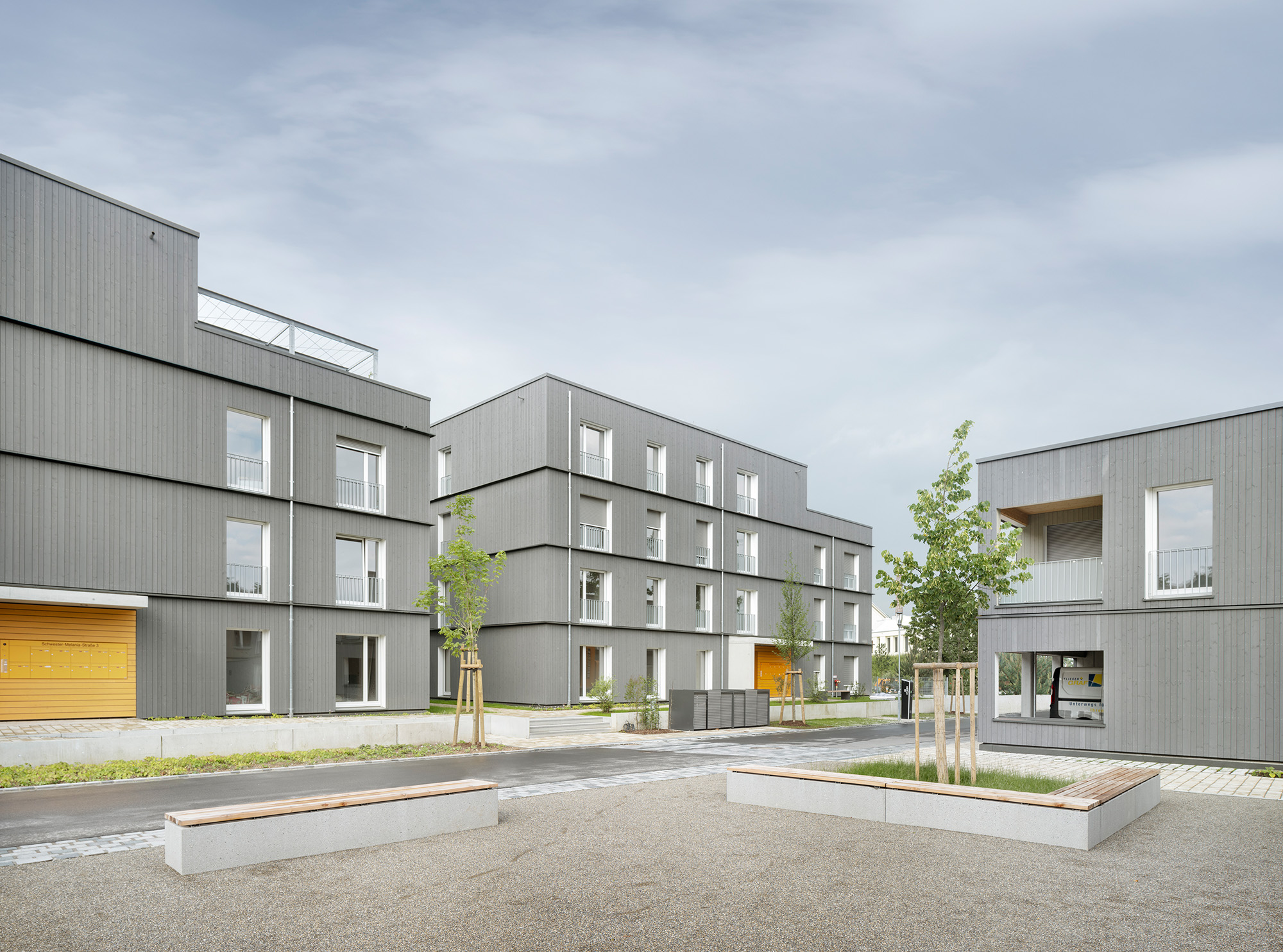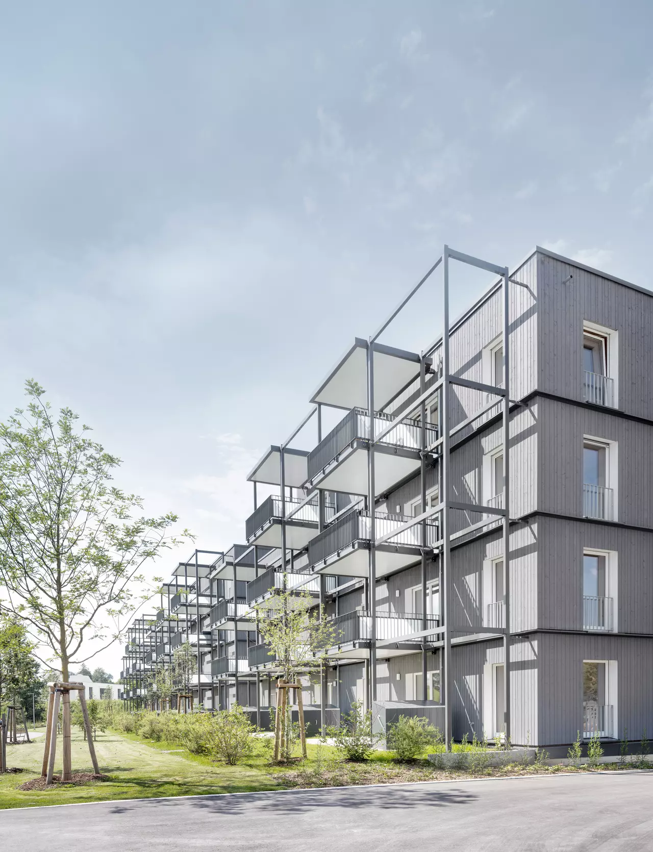 Eine klare Raumkante zur Landesgartenschau hin bilden die drei Mehrfamilienhäuser mit ihren insgesamt 33 Wohnungen auf drei Stockwerken plus Dachgeschoss. Durch die vorgelagerte freistehende Aluminiumkonstruktion für Kletterpflanzen wird das horizontale Grün des Auswiesenparks in die Vertikale weitergeführt. So entsteht eine natürliche Verbindung zwischen den Gebäuden und der umgebenden Landschaft, die gleichzeitig das Mikroklima verbessert und die Wohnqualität steigert. In die Regalstruktur sind zudem die Balkone bzw. die Terrassen integriert, die jeder Wohnung zugeordnet sind. Als zusätzliche Freiflächen und um die hausinterne Gemeinschaft zu stärken, stehen den Bewohnerinnen und Bewohnern zudem die gemeinschaftlich nutzbaren Dachterrassen zur Verfügung. Von den 2-, 3- und 4-Zimmer-Wohnungen wurden 16 als geförderter Wohnraum umgesetzt, 13 Wohnungen sind barrierefrei. Dies fördert eine soziale und altersmäßige Durchmischung im Quartier.