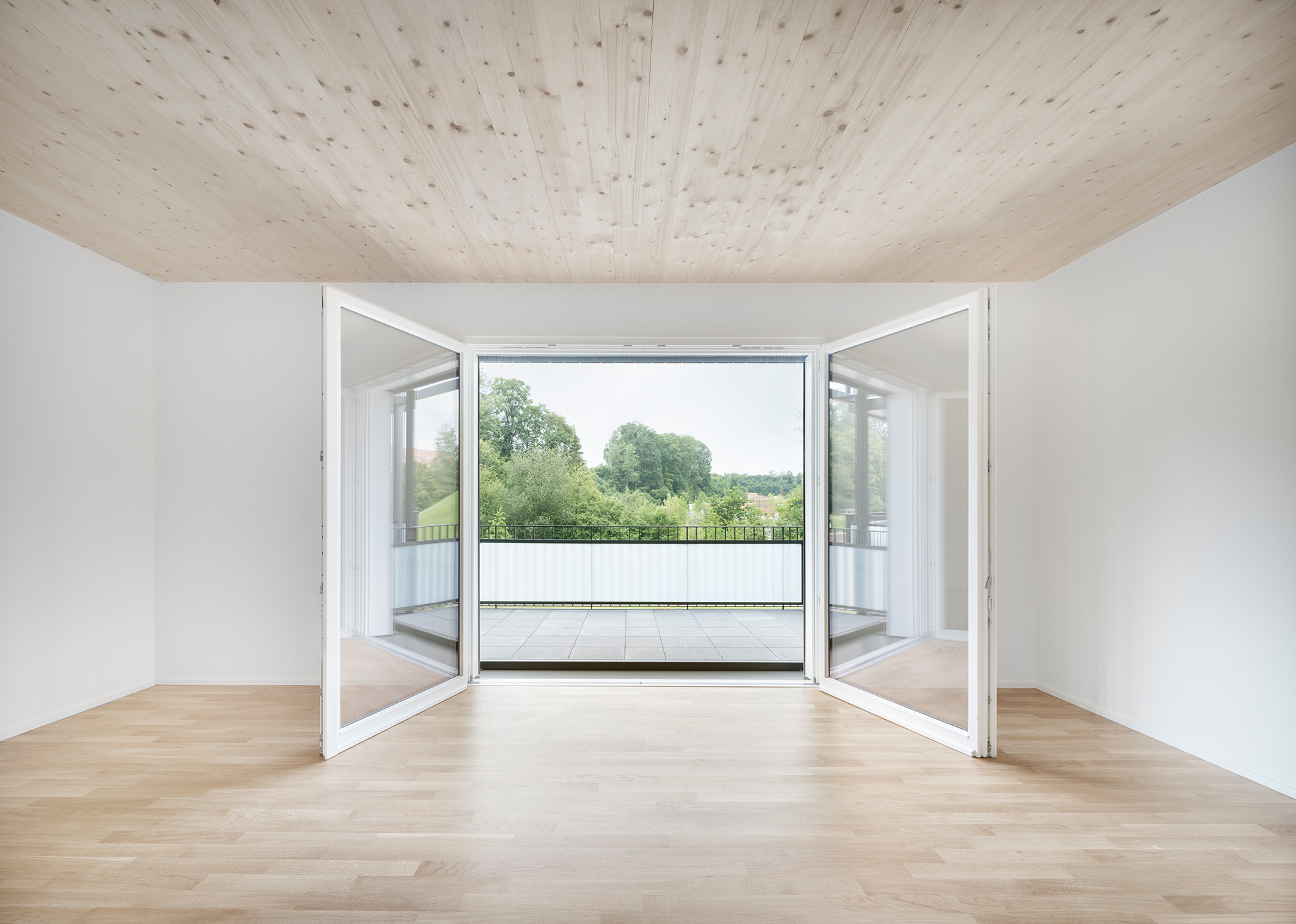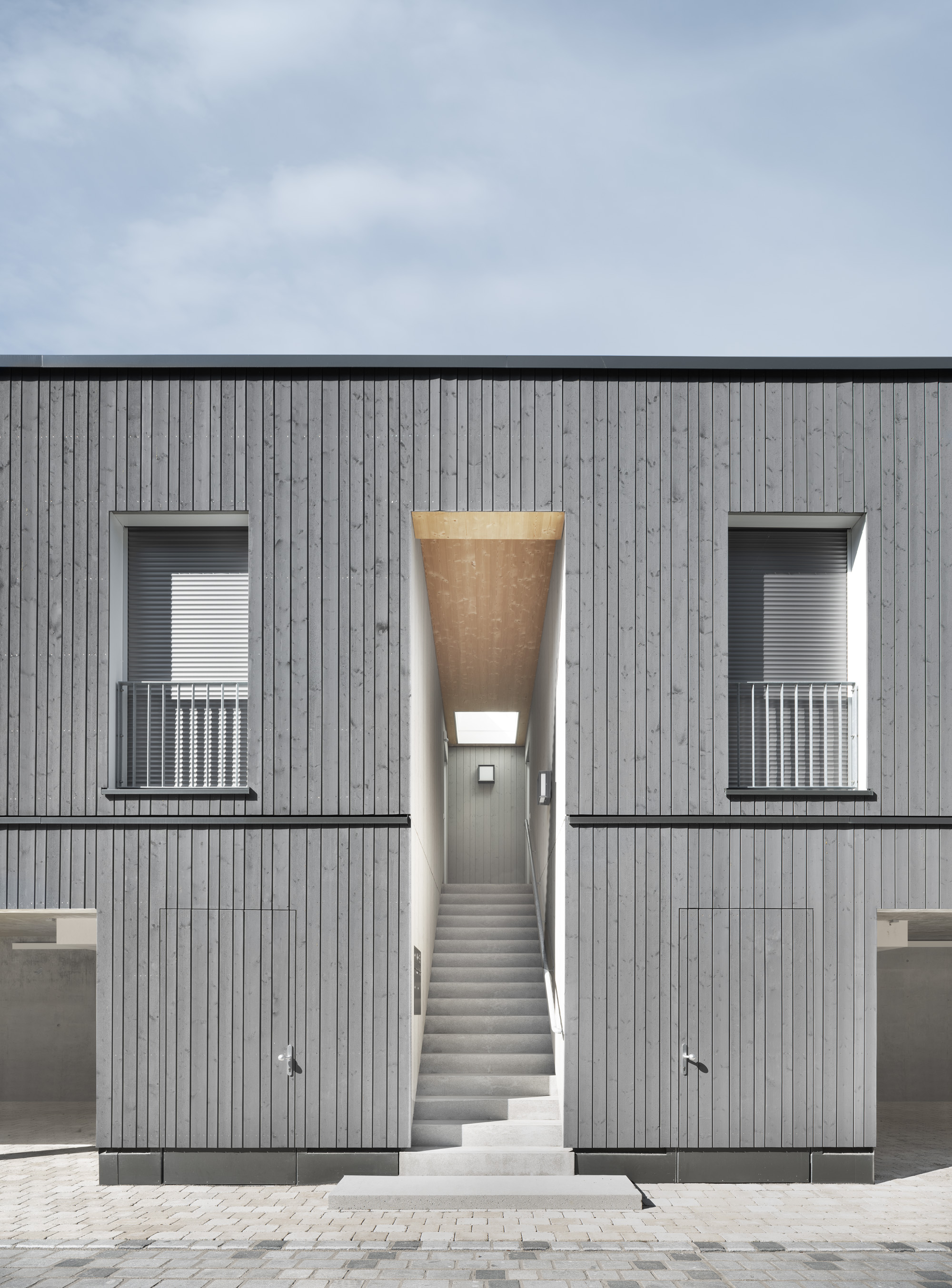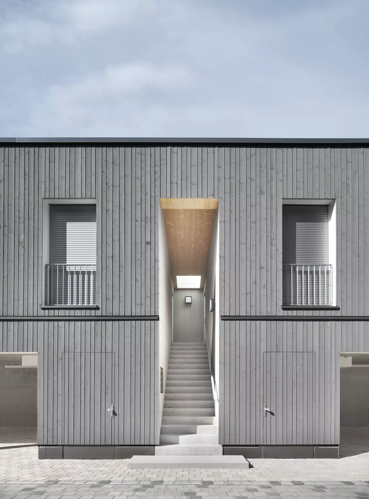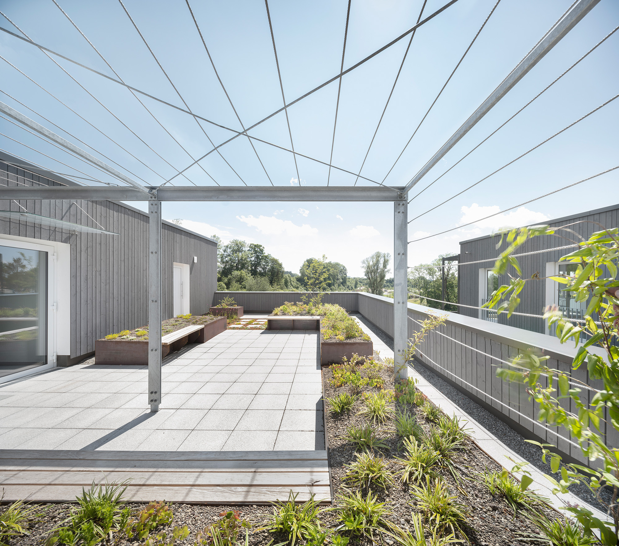 Eine klare Raumkante zur Landesgartenschau hin bilden die drei Mehrfamilienhäuser mit ihren insgesamt 33 Wohnungen auf drei Stockwerken plus Dachgeschoss. Durch die vorgelagerte freistehende Aluminiumkonstruktion für Kletterpflanzen wird das horizontale Grün des Auswiesenparks in die Vertikale weitergeführt. So entsteht eine natürliche Verbindung zwischen den Gebäuden und der umgebenden Landschaft, die gleichzeitig das Mikroklima verbessert und die Wohnqualität steigert. In die Regalstruktur sind zudem die Balkone bzw. die Terrassen integriert, die jeder Wohnung zugeordnet sind. Als zusätzliche Freiflächen und um die hausinterne Gemeinschaft zu stärken, stehen den Bewohnerinnen und Bewohnern zudem die gemeinschaftlich nutzbaren Dachterrassen zur Verfügung. Von den 2-, 3- und 4-Zimmer-Wohnungen wurden 16 als geförderter Wohnraum umgesetzt, 13 Wohnungen sind barrierefrei. Dies fördert eine soziale und altersmäßige Durchmischung im Quartier.