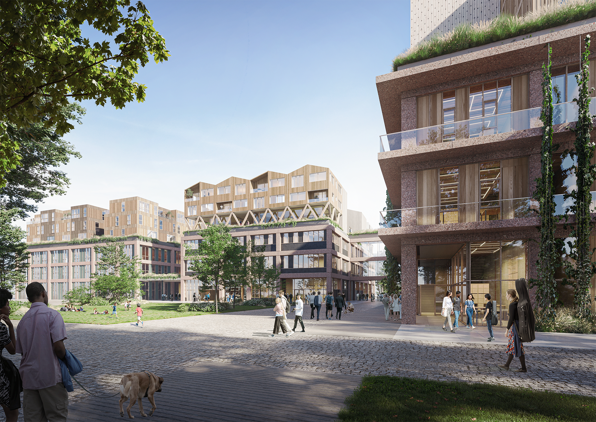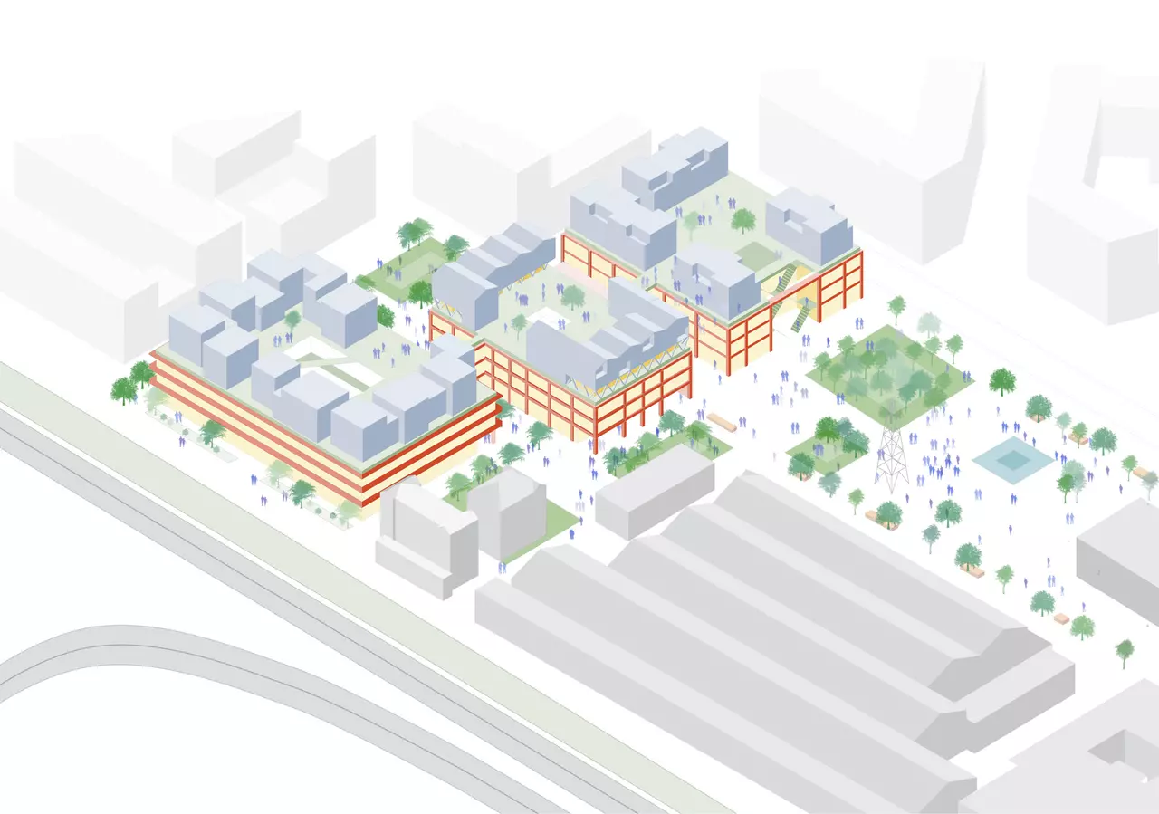 Die städtebauliche Leitidee ist, im Sinne der Ökologie und Wirtschaftlichkeit an die Folgenutzung schon in der ersten Bauphase zu denken, um einen Abriss in der Zukunft zu vermeiden. Unser Ziel ist deshalb, langfristig ein Maximum der Interimsoper als Permanent-Struktur stehen zu lassen. Möglichst viel Re-Use und möglichst wenig Recycling als Prinzip. Die gebauten Strukturen ermöglichen eine hohe Flexibilität für verschiedenste gewerbliche Nachnutzungen in der späteren Makers City. Nur die Oper mit ihren zentralen Funktionen wie Zuschauerraum und Bühne sind demontierbar in Holz konstruiert. Die restlichen Strukturen der Oper, die auch in Zukunft stehen bleiben, werden als robustes CO2 reduziertes Betonskelett geplant. In den Fassaden ist das ablesbar: Holzfassaden im Bereich des Zuschauerraums, die Permanentstruktur der restlichen Oper mit Betonstützen und vorgefertigten nichttragenden Holztafelelementen und oben drauf das Dorf wieder in Holz.
