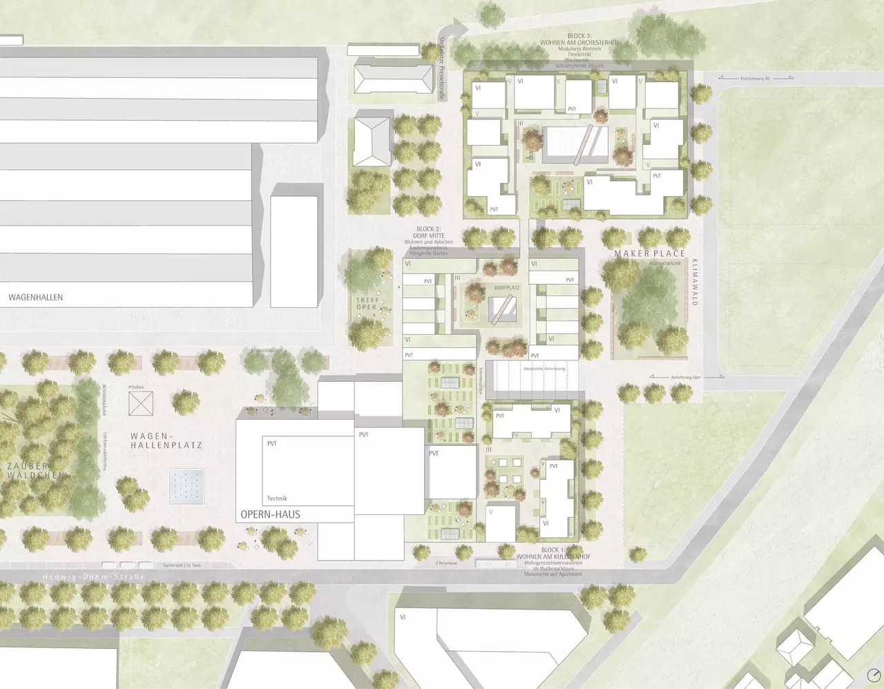Der neue Komplex umfasst die Produktionsbereiche (Back of House): Proberäume, Werkstätten für Bühnenbilder, Büros, Lagerräume und vieles mehr verteilt auf drei Stadtblöcke. Das Dach der Oper ist die Basis für eine neuartige Wohnbebauung: Ein Dorf auf dem Dach der Oper. Produktion und Wohnen werden kombiniert, um einen Ort der Gemeinschaft zu schaffen. Sobald die Oper und das Ballett an ihren ursprünglichen Standort zurückgekehrt sind, wird die Produktionsstätte als „Makers City“ umgenutzt. Das Projekt ist auch Teil der internationalen Bauausstellung IBA’27.