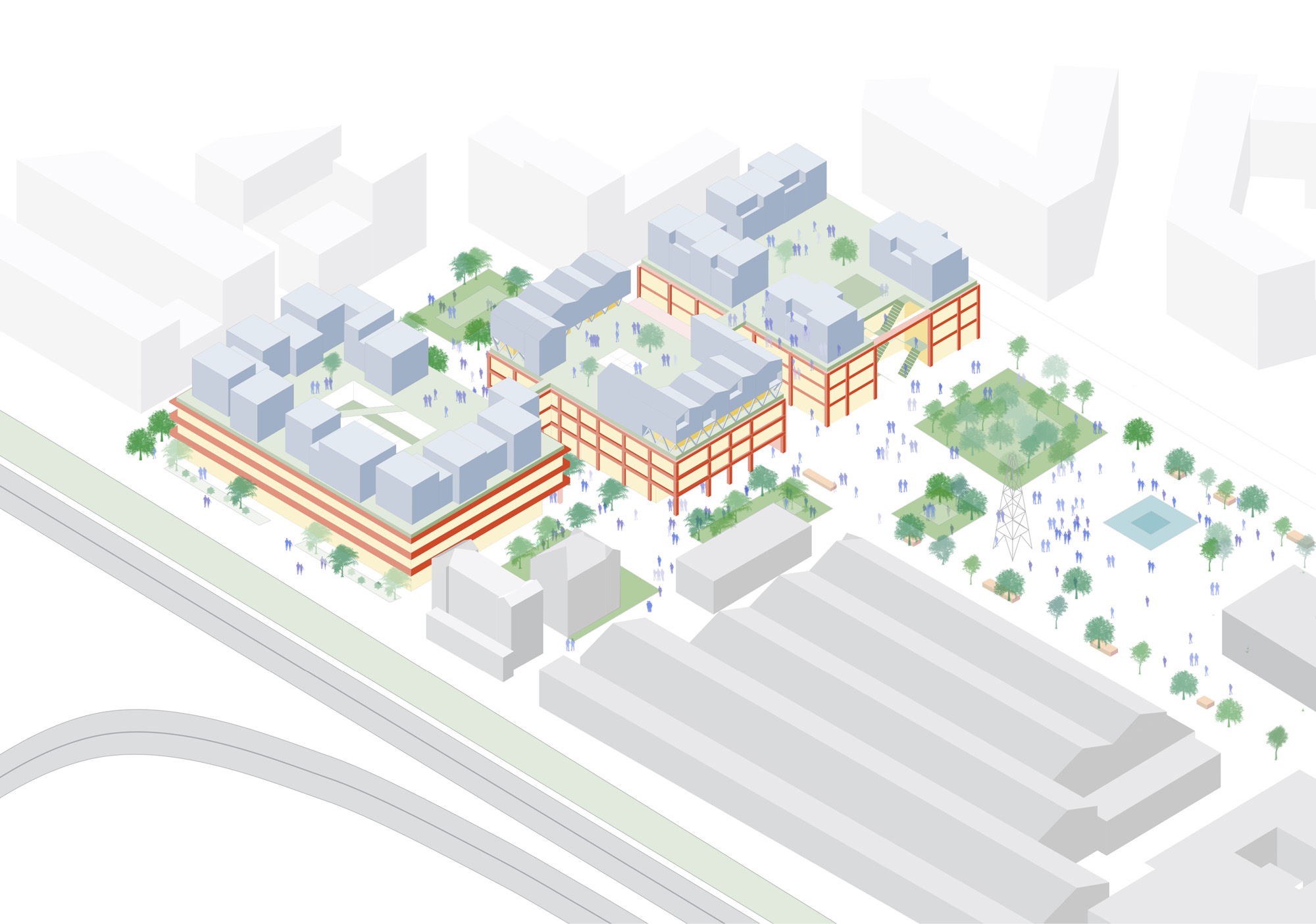 Für die Zukunft haben wir die Vision, einen vertikalen Park an der Fassade des Blocks 3 in Richtung Wagenhallenplatz zu kultivieren (nach Demontage der Holzkonstruktionen). Ein begrüntes und öffentlich begehbares Gerüst führt den Platz in die Vertikale. Über diesen vertikalen Park wird das Dorf neu an die Öffentlichkeit angebunden.