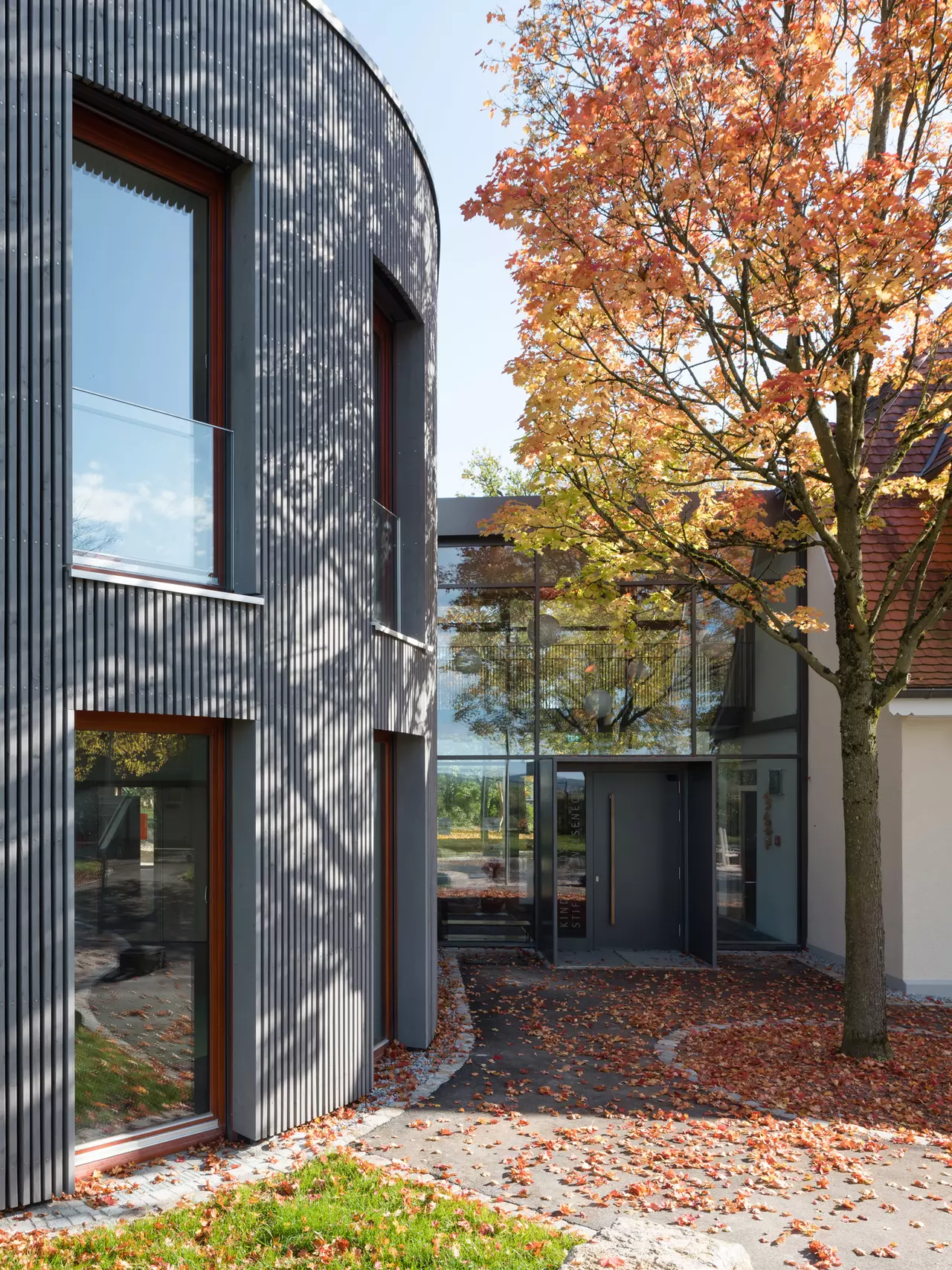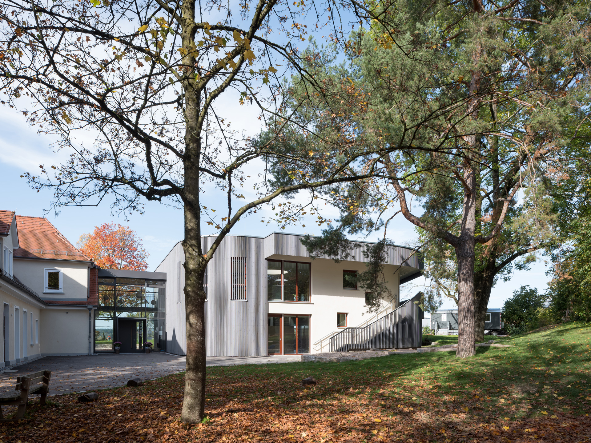 Geplant wurde auch unter dem Aspekt der Nachhaltigkeit: die kompakte Hülle des Erweiterungsbaus minimiert aufgrund ihrer geringen Oberfläche den Wärmeverlust und ermöglichte es, den alten Baumbestand zu erhalten.