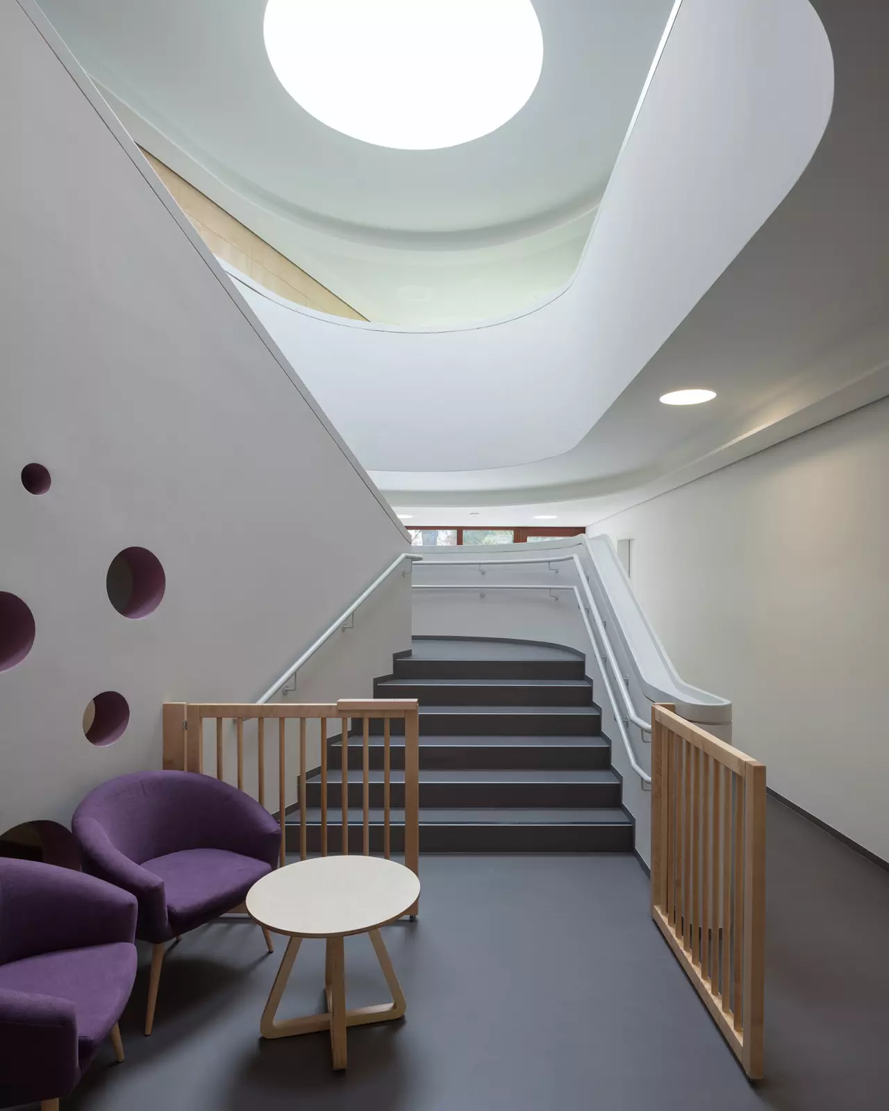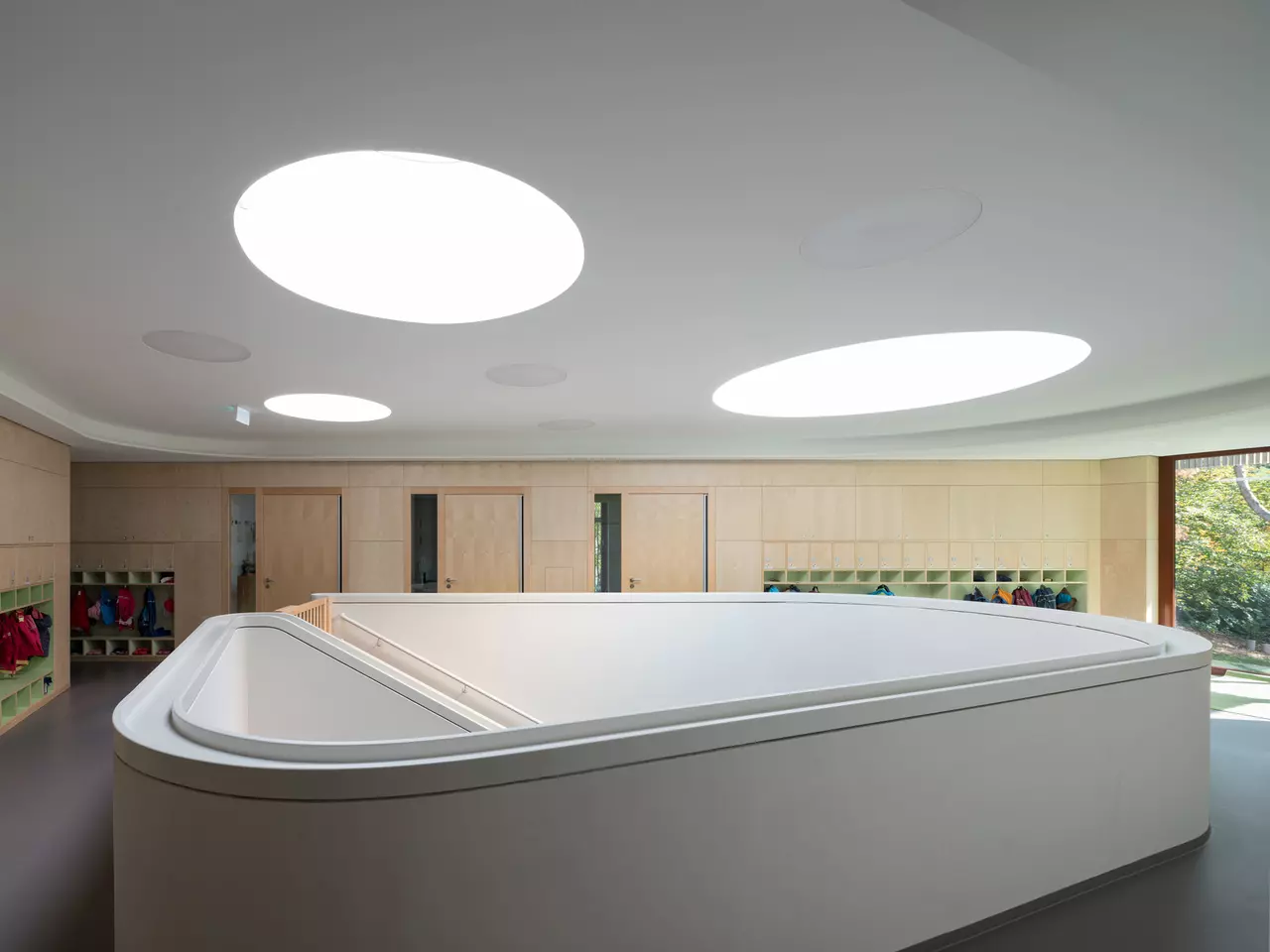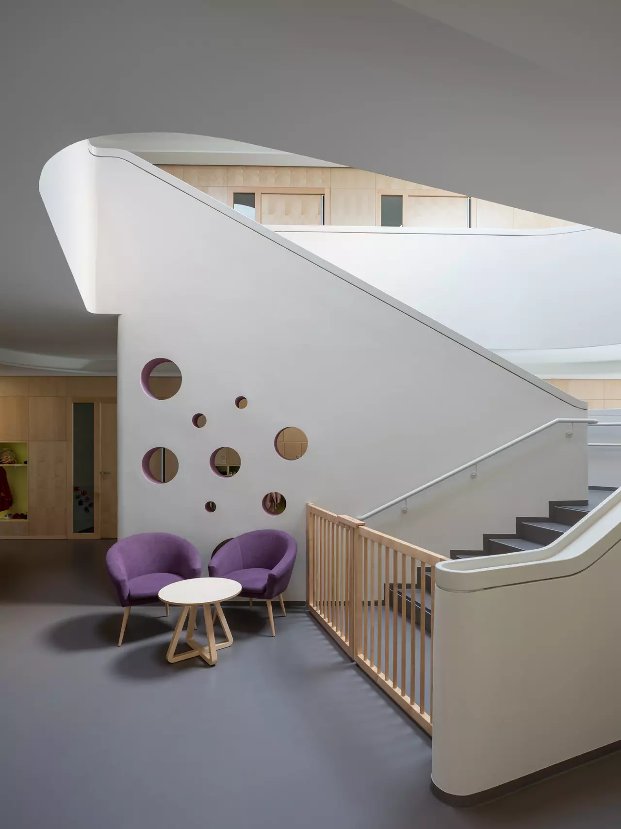 Das Kinderhaus bietet ein familienähnliches Konzept mit Ganztagesbetreuung an, so dass sich einige Kinder bis zu 10 Stunden in den Räumlichkeiten aufhalten. In der Planung wurde auf die unterschiedlichen Bedürfnisse der Kinder Rücksicht genommen. Das Herz des Kinderhauses bildet die Spieltreppe, die sich in sanftem Schwung durch die Mitte des Neubaus windet und übersichtlich die einzelnen Bereiche erschließt: vielfältige Spielzonen vor den Gruppenräumen, Sitzecken und ruhigere Bereiche zum Ausruhen und Entspannen.
