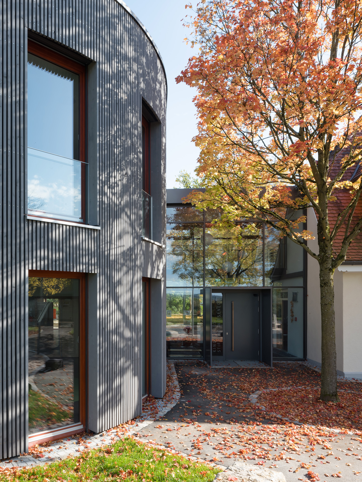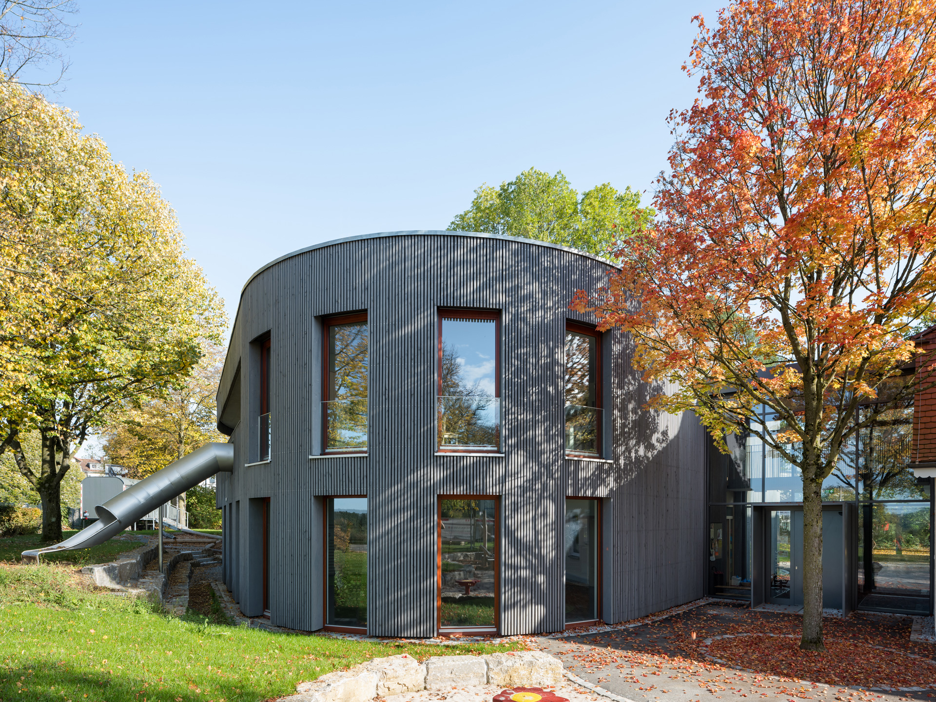 Eine besondere Herausforderung bedeutete es zunächst, mit der maroden Bausubstanz des bestehenden Kindergartengebäudes umzugehen und dieses stimmig an den Erweiterungsbau anzuschließen. Das historische Bestandsgebäude lag als Solitär in einer parkartigen Grünfläche am Ortsrand. In der Planung wurde darauf geachtet auch der Erweiterung eine eigene Identität zu vermitteln. Zugleich sollte sie harmonisch in den Garten eingefügt werden. Entstanden ist ein Gebäude, das durch seine vertikale, gerundete Holzfassade einen feinen Kontrast zum Bestandsbau mit Putzfassade und Satteldach herstellt. Aufgrund dieser natürlichen Materialität erzielt die Fassade eine sehr ansprechende und einladende Wirkung. Mit einem gläsernen Zwischenbau sind beide Gebäude zu einem Ensemble verbunden.