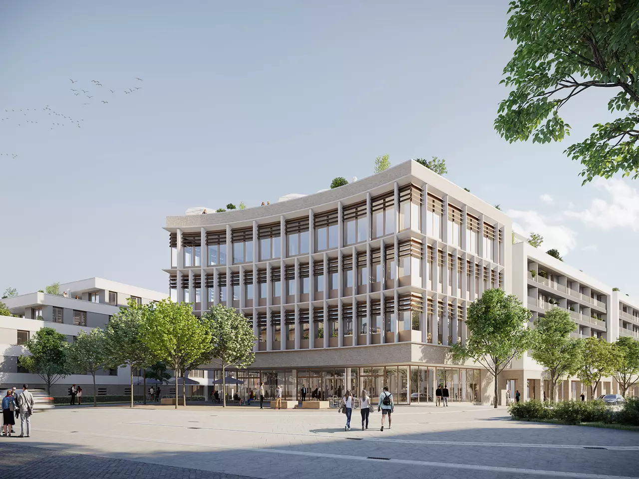 Eine Hochschule nutzt die Erdgeschosszone. Die intensive Nutzungsmischung sorgt für ein lebendiges Quartier. Planungsrechtlich ist der Stadtteil ein Urbanes Gebiet nach BauNVO.