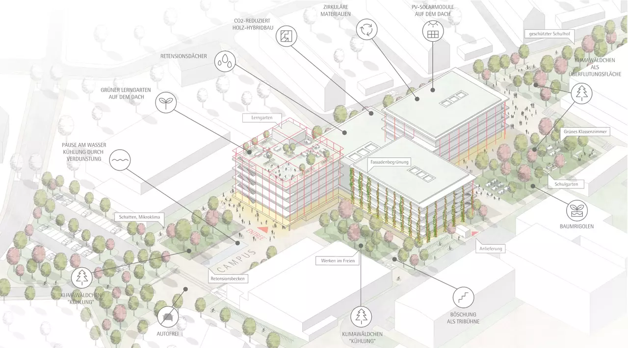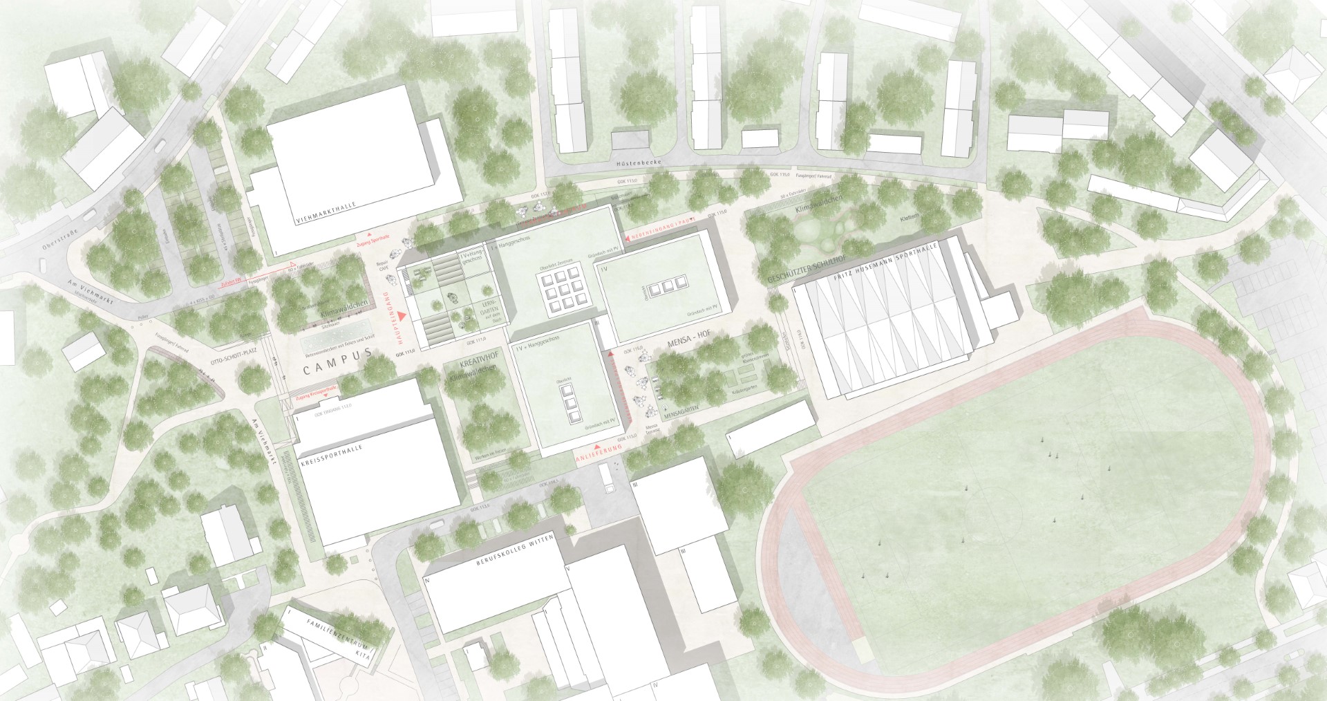 Im Kreativhof, im Mensagarten und geschützten Schulhof bildet jeweils ein gemischter Baumhain (Klimawäldchen) mit begehbaren Grünflächen einen geschützten Ort für die unterschiedlichen Nutzungen. Die wesentlichen Höhenübergänge werden mit begrünten Sitzstufen gestaltet. Die verschiedenen Gebäudehöhe der Bauteile Lernhäuser und Zentrum passen sich der Umgebung an: Das Zentrum ist nach Norden niedrig zur kleinteiligen Wohnbebauung (II), die Lernhäuser der Sekundarstufe I passen sich der höheren Bebauung des Berufskollegs Witten an und das Lernhaus Sekundarstufe II markiert am Campus durch eine Überhöhe die Präsenz zum öffentlichen Raum und zum Entree am Campus.