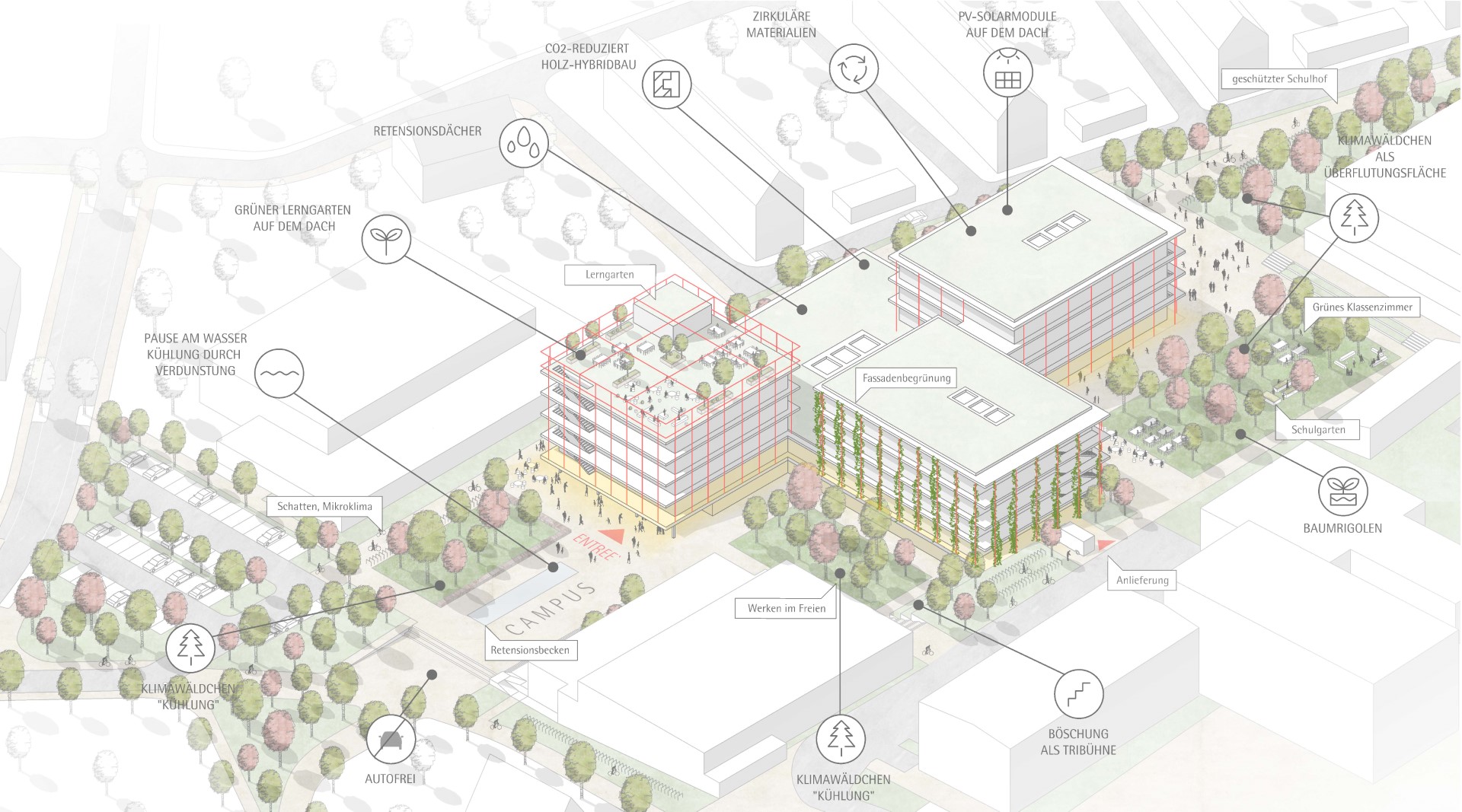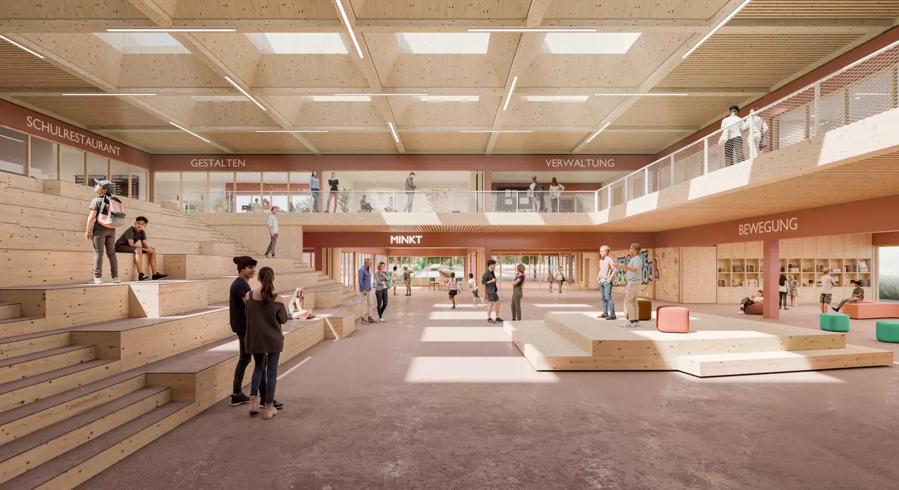 Die neue Schule auf dem Campus hat eine starke Präsenz zum öffentlichen Raum, trotz den beidseitig angeordneten Sporthallen. Das Kopfgebäude mit Haupteingang am Campus ist markant durch eine Überhöhung. Die Funktionen rund um den Haupteingang beleben den öffentlichen Raum auch außerhalb der Schulzeiten. Ein großzügig überdachter Eingangsbereich führt direkt zum Zentrum der Schule, ein Ort für Gemeinschaft, Veranstaltungen, Ausstellung und Versammlungen der Schulgemeinschaft.