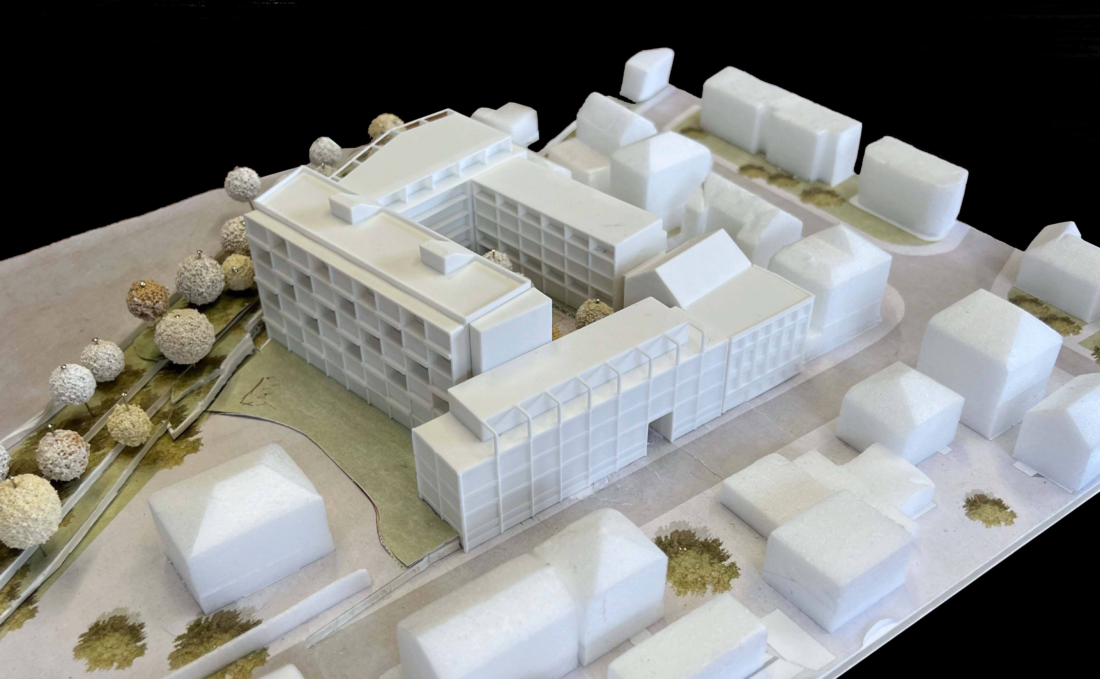 Dem Konzept für die Neuordnung des Quartiers U21 in Ludwigsburg gelingt es, durch eine attraktive Kombination von Erhalt, Sanierung und Neubauten den Charakter des Ortes zu wahren und gleichzeitig weiterzuentwickeln und mit Leben zu füllen. Die Leitidee ist eine Stadtcollage. Abgeleitet aus der heterogenen Umgebung, fügen sich unterschiedliche Gebäudetypologien um die zentral gelegene grüne Oase zu einer stabilen Komposition. Fünf Typologien erzählen die Historie: Der „Oldtimer“ aus der Zeit der Vogelkäfigfabrik, der bestehende „Youngtimer“ aus den 60er, das „Lofthaus“ aus den 90er und die zukünftigen Neubauten „Laubenganghaus“ sowie „Huckepackhaus“ machen aus dem Entwurf ein unverkennbares, Identität stiftendes Quartier. Ein Ort voller Leben mit unterschiedlichsten Nutzungen. Einerseits Gewerbe, Büros, Gastronomie und andererseits Wohnungen für Singles, Senioren, junge Paare oder Wohngemeinschaften. Das Huckepackhaus selbst stapelt Einfamilienhäuser übereinander und bietet Raum für Familien in zentraler Innenstadtlage. Das neue Laubenganghaus schließt den Block zur Bahn und ermöglicht eine ruhige grüne Oase als zentralen Freibereich.