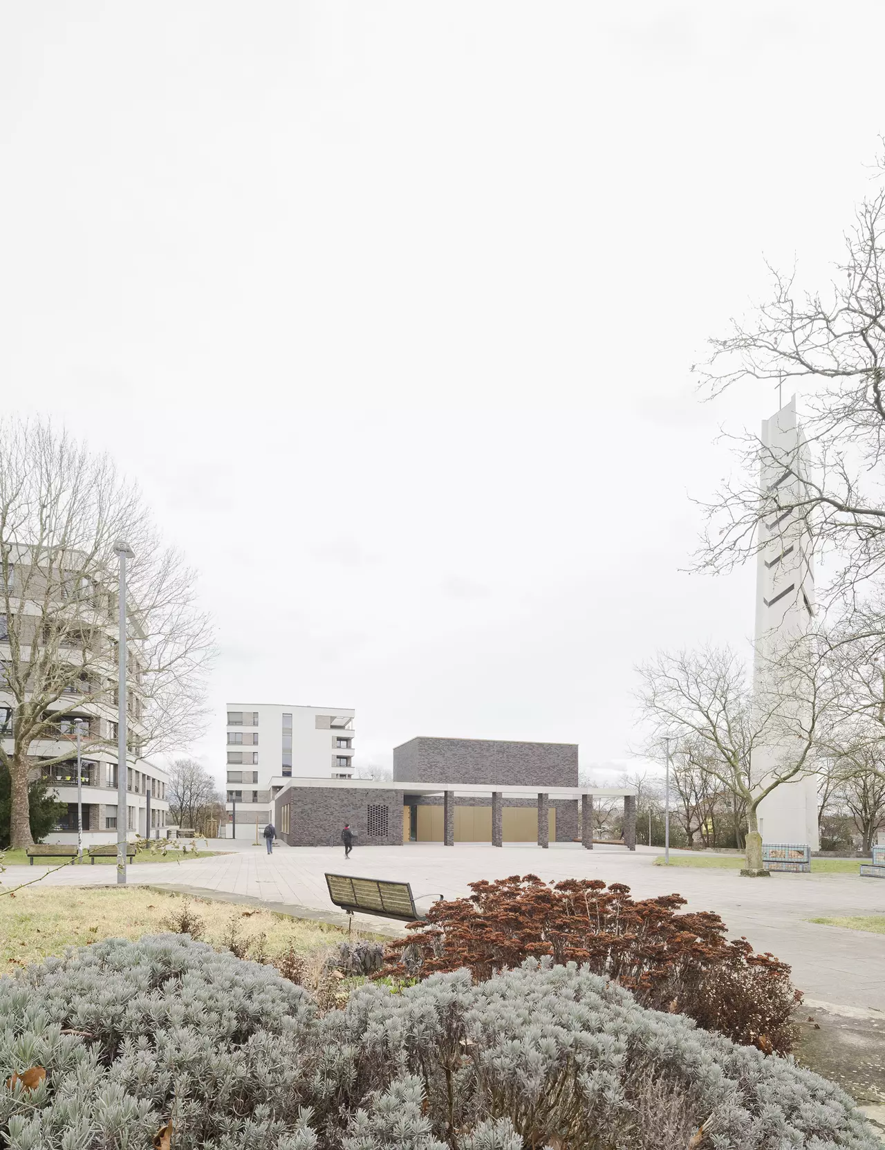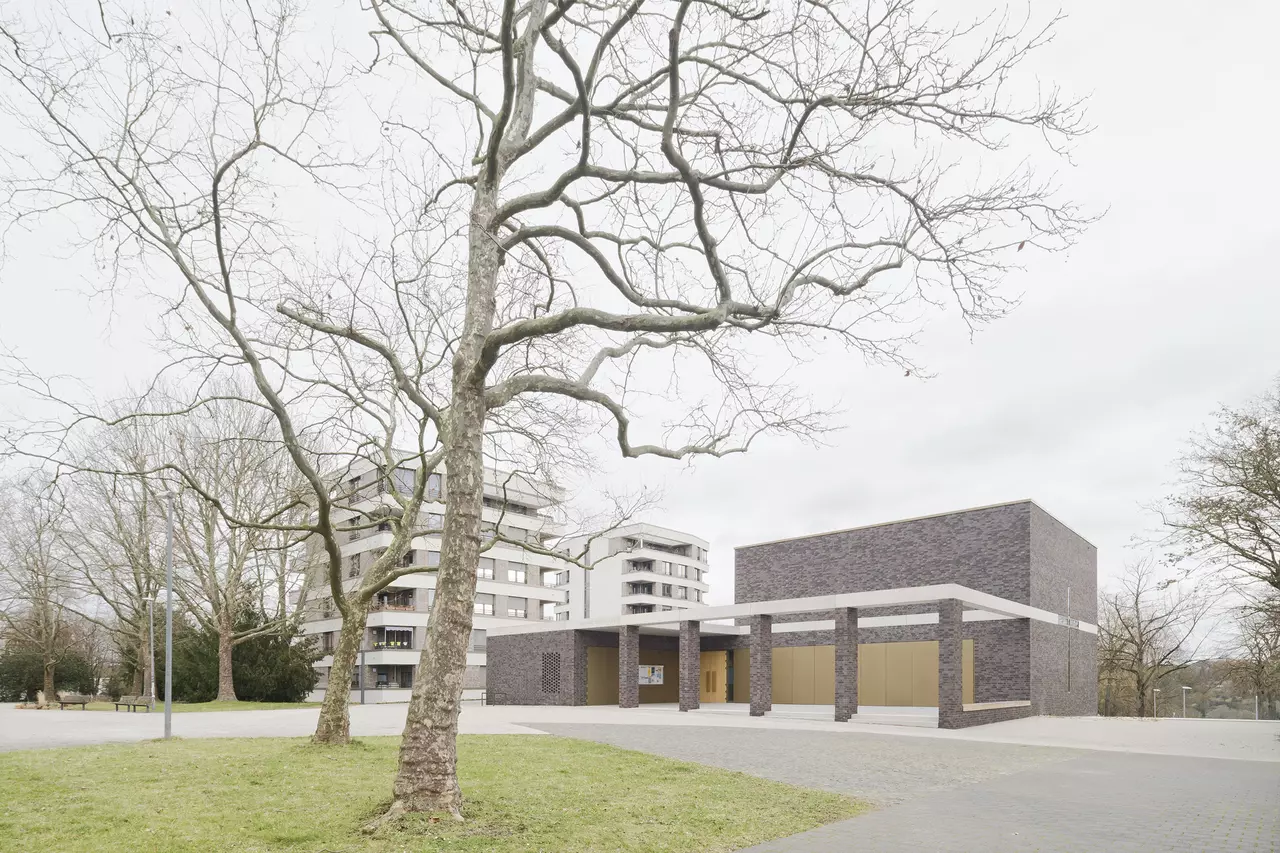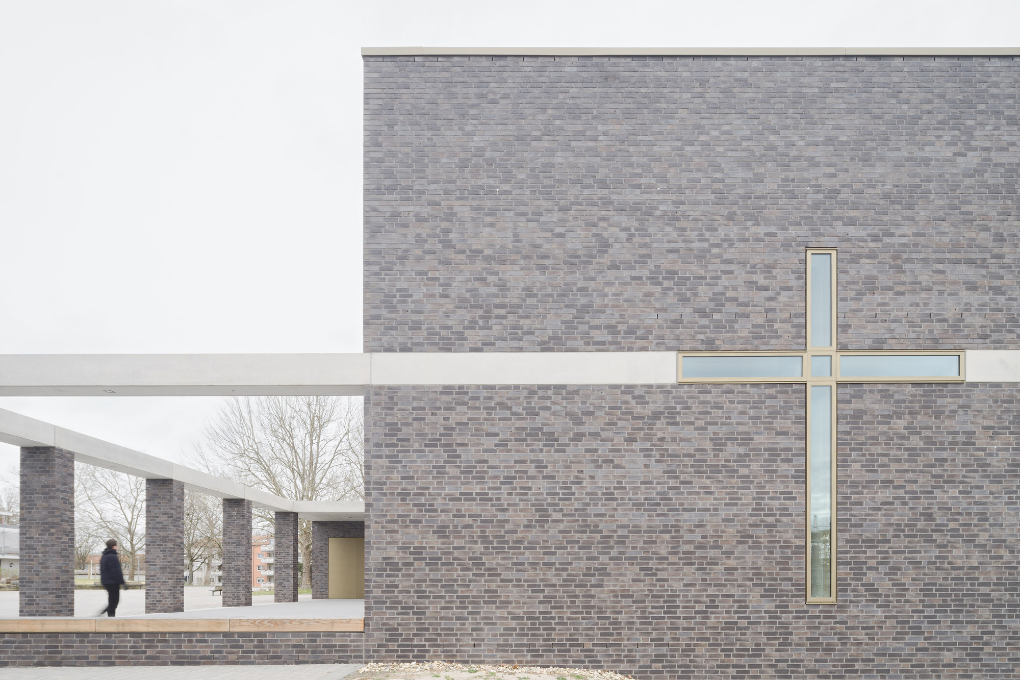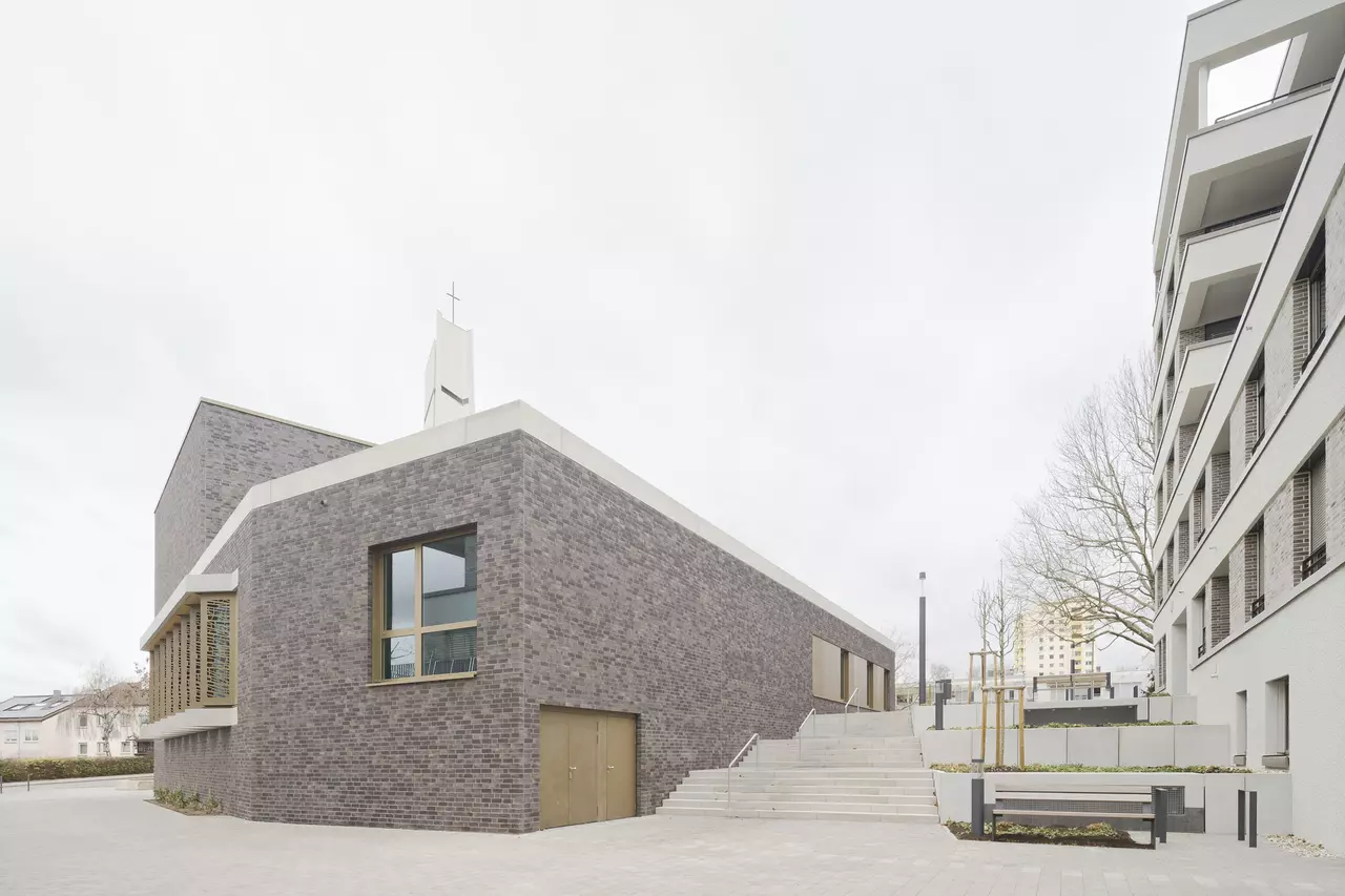 Für die Architektur des Kirchenneubaus, der Wohnbebauung als auch der Quartiersgestaltung konnten wir uns 2017 in einem Wettbewerb mit dem 1. Platz behaupten. Im Jahr 2020 startete schließlich nach den Abrissarbeiten die Neubebauung nach unseren Plänen. Herz des neuen durchgrünten und autofreien Areals ist ein neugestalteter Quartiersplatz, um den sich die Kirche und die anderen Neubauten gruppieren. Den kubischen, zweigeschossigen Kirchenneubau mit seinem eingeschossigen Anbau mit pastoralem Büro, Gemeinderäumen und -saal haben wir mit einer dunklen Klinkerfassade verkleidet. Er unterstreicht mit seiner Farbgebung seine besondere Stellung im Quartiersgefüge. Eine vorgelagerte Pergola aus Sichtbeton und Klinkerstützen fasst den Kirchenvorplatz. Das Sichtbetonband setzt sich gestalterisch als Attika am Anbau fort und teilt den Kirchenkubus genau in der Mitte.