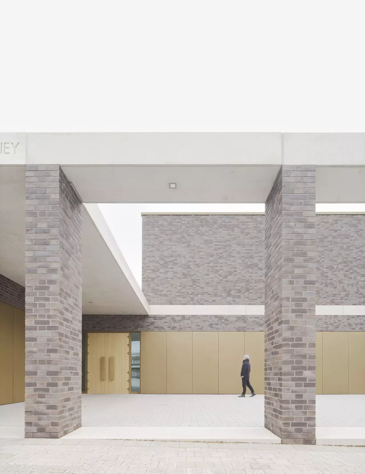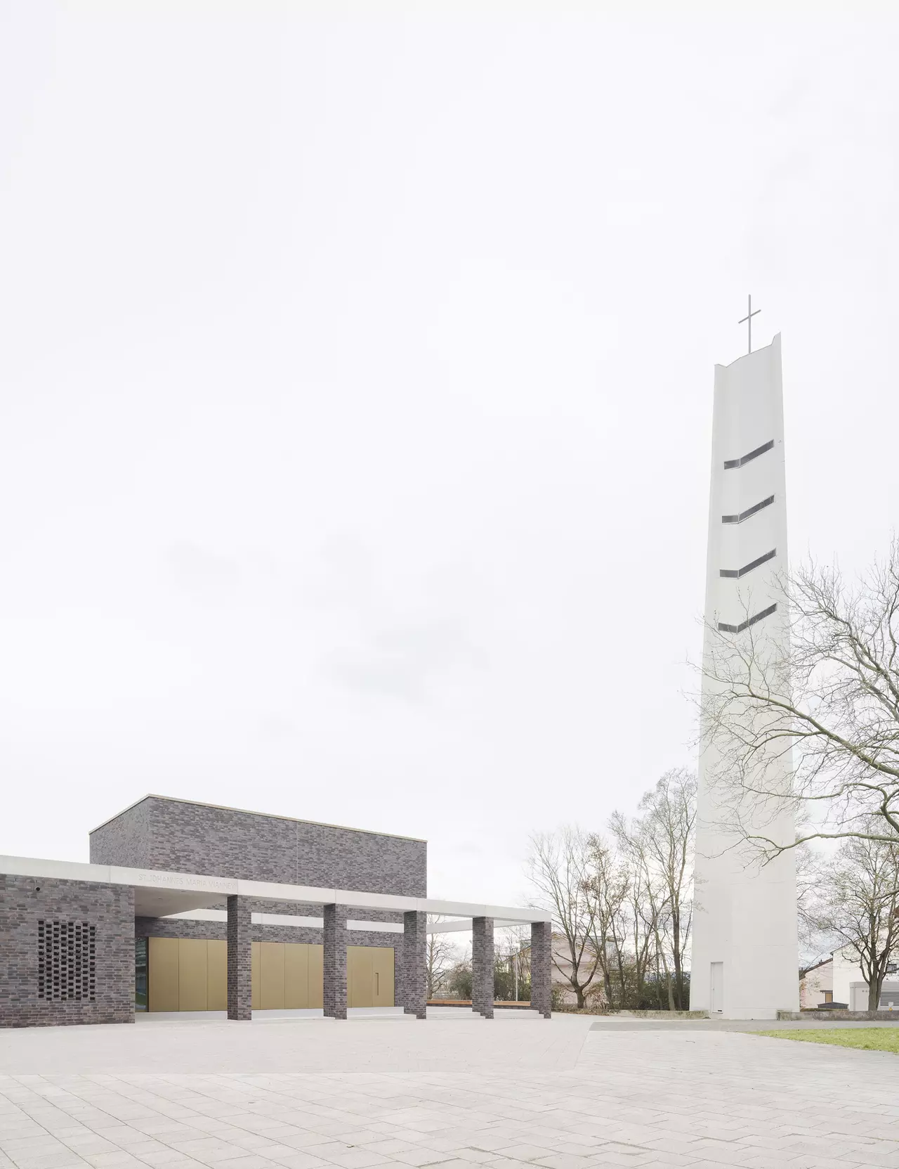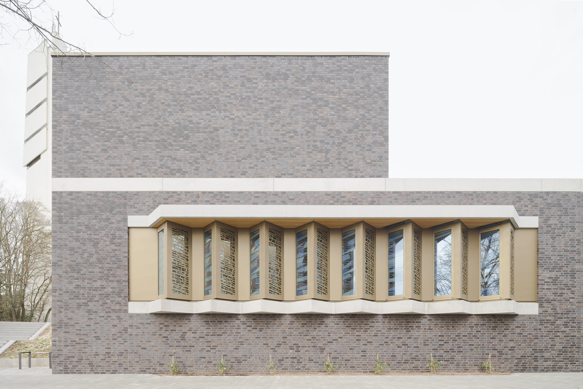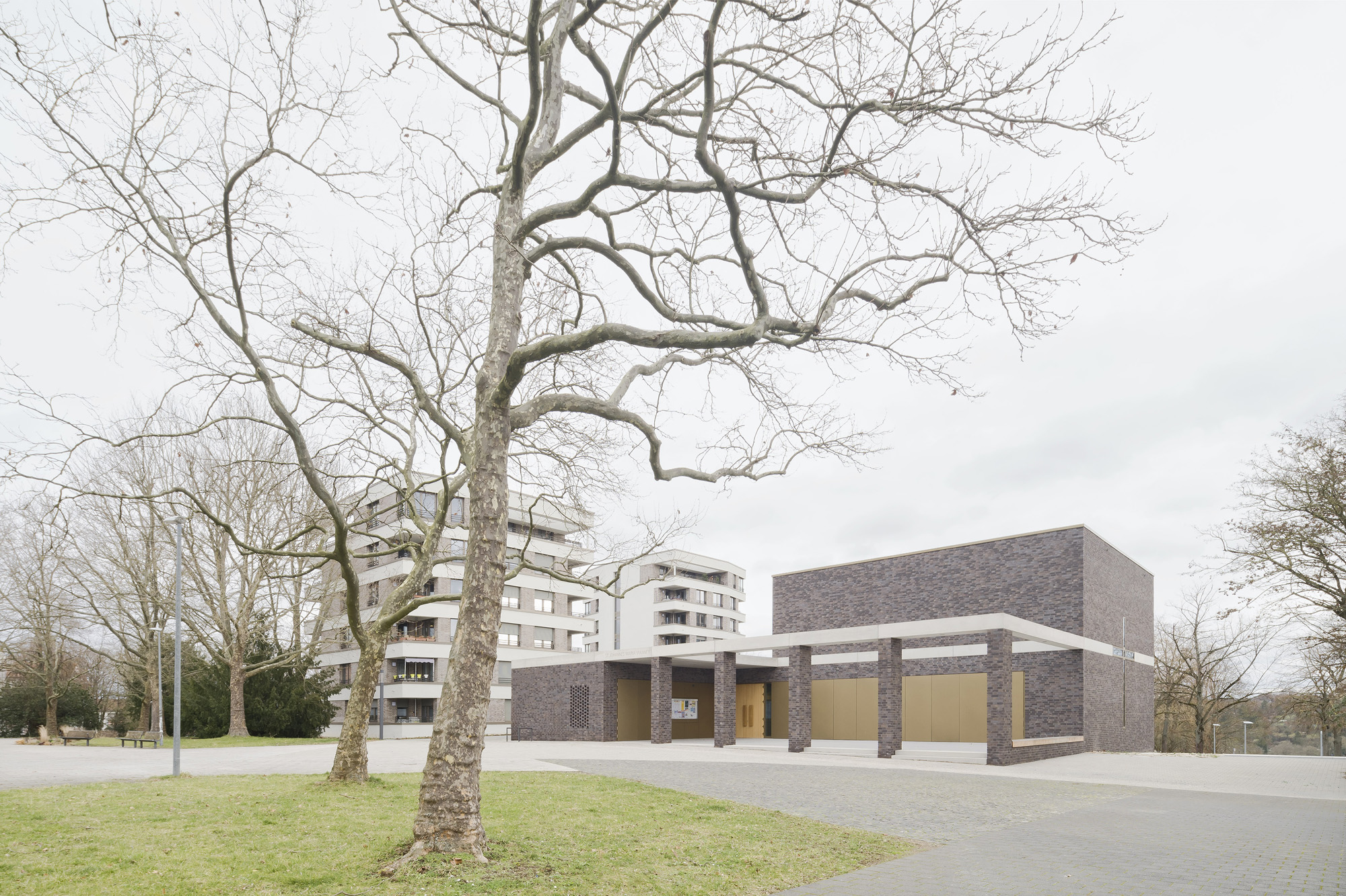 Für die Architektur des Kirchenneubaus, der Wohnbebauung als auch der Quartiersgestaltung konnten wir uns 2017 in einem Wettbewerb mit dem 1. Platz behaupten. Im Jahr 2020 startete schließlich nach den Abrissarbeiten die Neubebauung nach unseren Plänen. Herz des neuen durchgrünten und autofreien Areals ist ein neugestalteter Quartiersplatz, um den sich die Kirche und die anderen Neubauten gruppieren. Den kubischen, zweigeschossigen Kirchenneubau mit seinem eingeschossigen Anbau mit pastoralem Büro, Gemeinderäumen und -saal haben wir mit einer dunklen Klinkerfassade verkleidet. Er unterstreicht mit seiner Farbgebung seine besondere Stellung im Quartiersgefüge. Eine vorgelagerte Pergola aus Sichtbeton und Klinkerstützen fasst den Kirchenvorplatz. Das Sichtbetonband setzt sich gestalterisch als Attika am Anbau fort und teilt den Kirchenkubus genau in der Mitte.