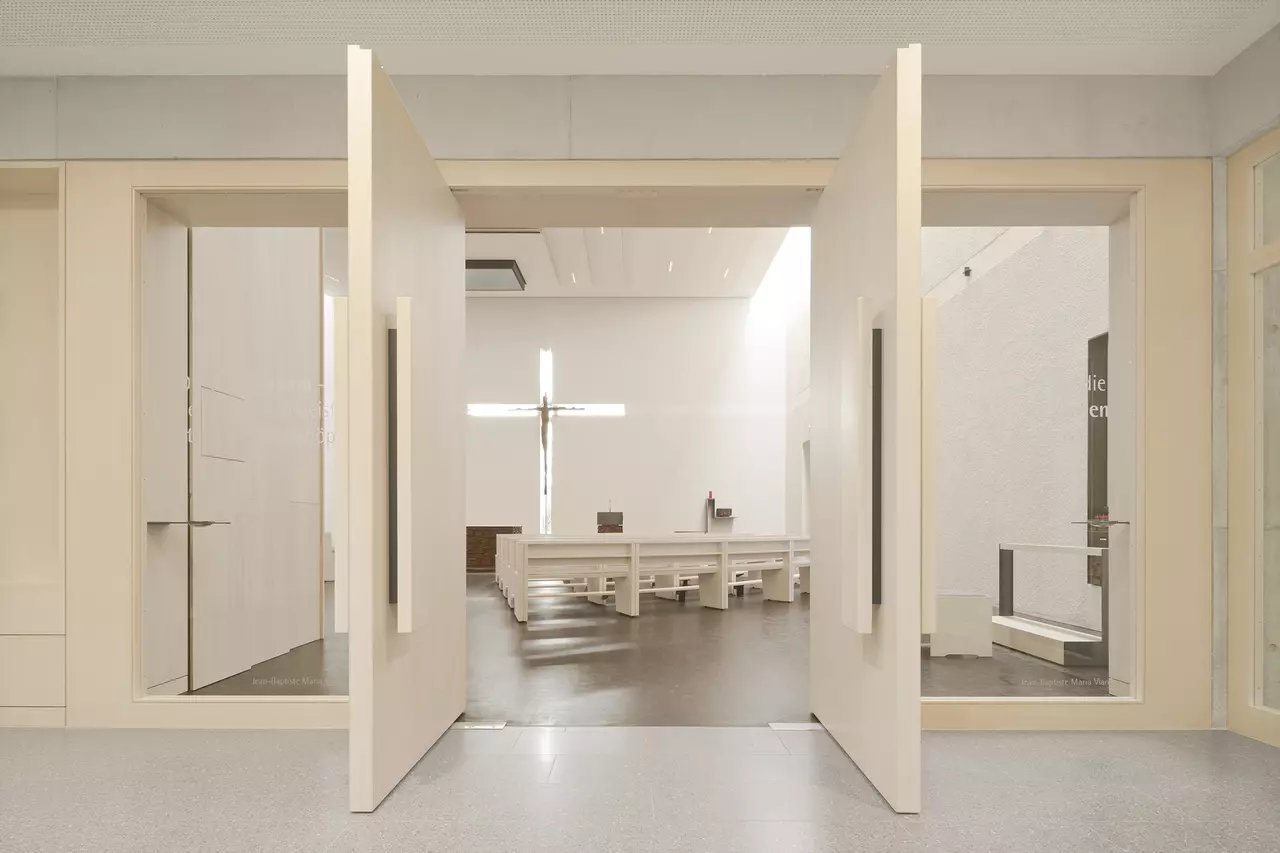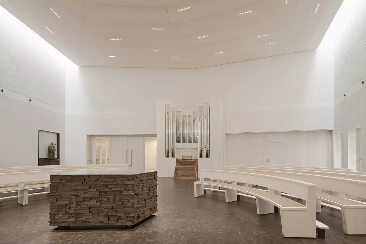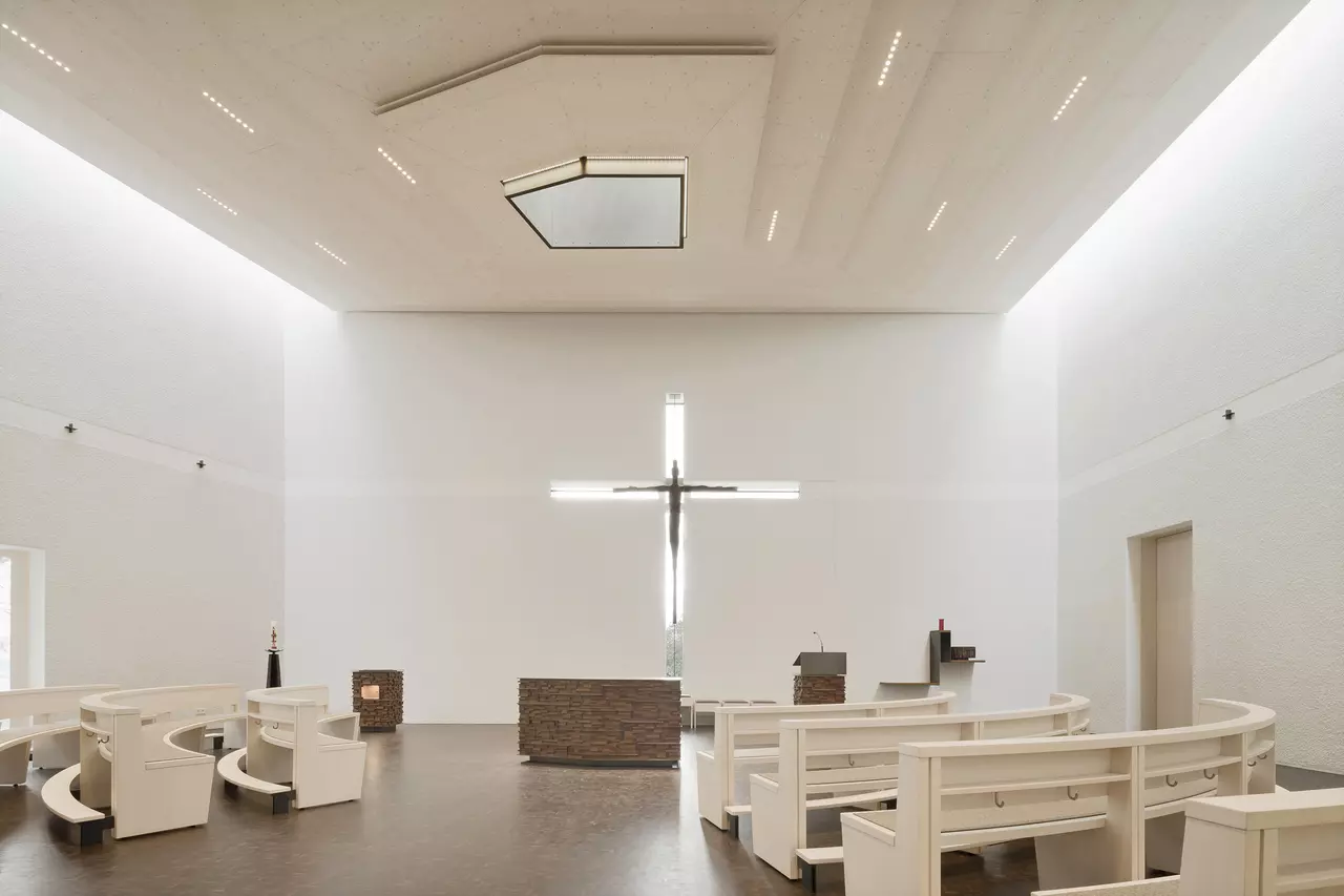 In die Süd-Westfassade ist ein Kreuz aus Glas eingeschnitten, dessen horizontale Linie das Sichtbetonband an dieser Stelle ersetzt. Dieses „Fensterkreuz“ zeichnet im Innenraum zugleich das leuchtende Altarkreuz. Den Innenraum gestalteten wir hell, mit weißem Rauputz an den Wänden und einer weiß lasierten, zum Altar hin abgetreppten Holzdecke. Lediglich der Fußboden aus dunklem Hirnholzparkett setzt einen deutlichen Kontrast. Eine sehr bewusst gestaltete Tageslichtführung, mit seitlichen Dachoberlichtern, einem Oberlicht direkt über dem Altar und dem Fensterkreuz, unterstützen den sakralen Charakter der neuen Kirche.