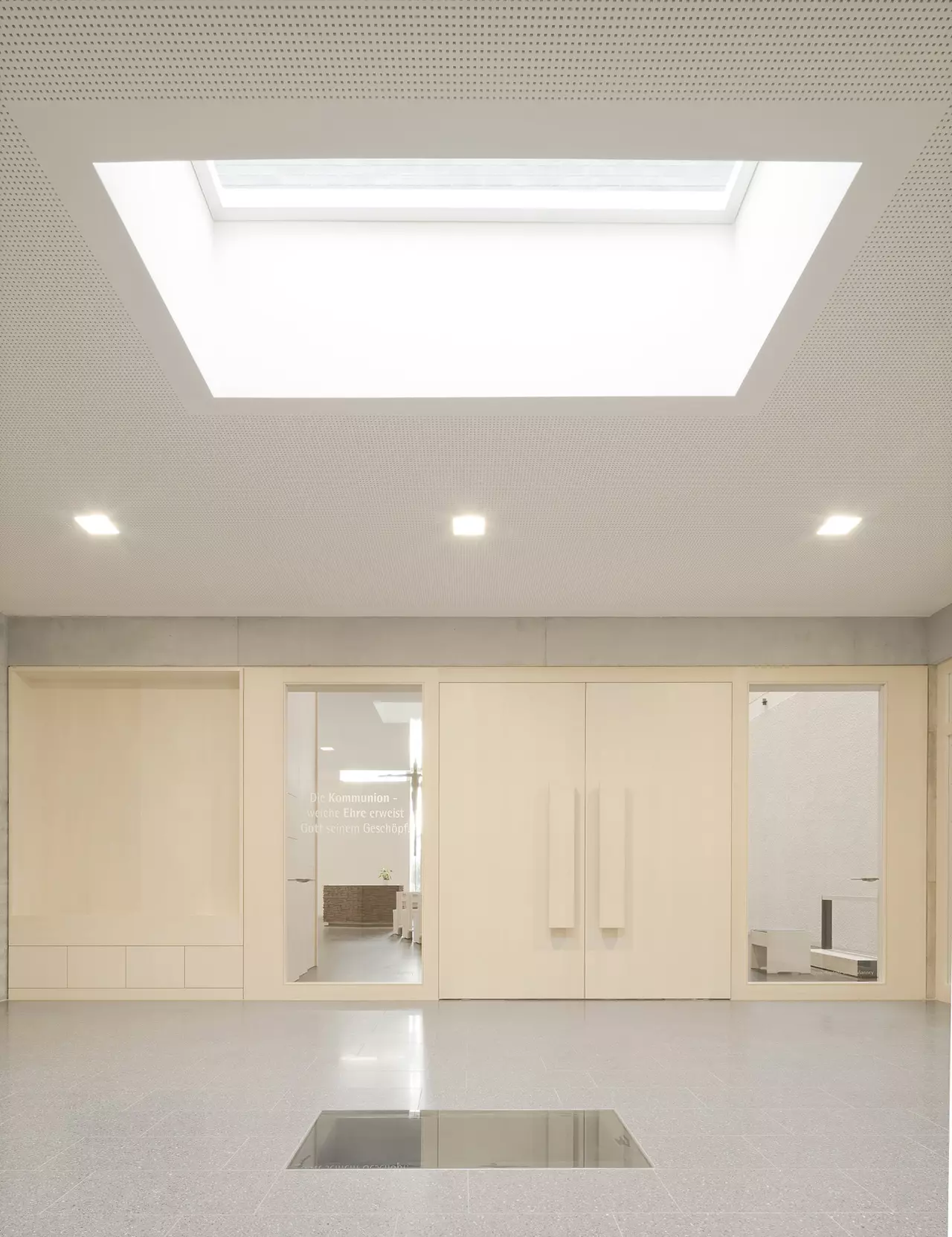 In der Kirche konnten wir zudem ein ganz besonderes Detail umsetzen: Der Grundstein befindet sich unter einem gläsernen Boden im Foyer. Die beleuchtete Bodenvitrine beinhaltet Teile des Grundsteins der alten Kirche, eine Kirche aus Legosteinen, ein Stuttgarter Rößle, Münzen, sowie eine Tageszeitung vom Tag der Grundsteinlegung.