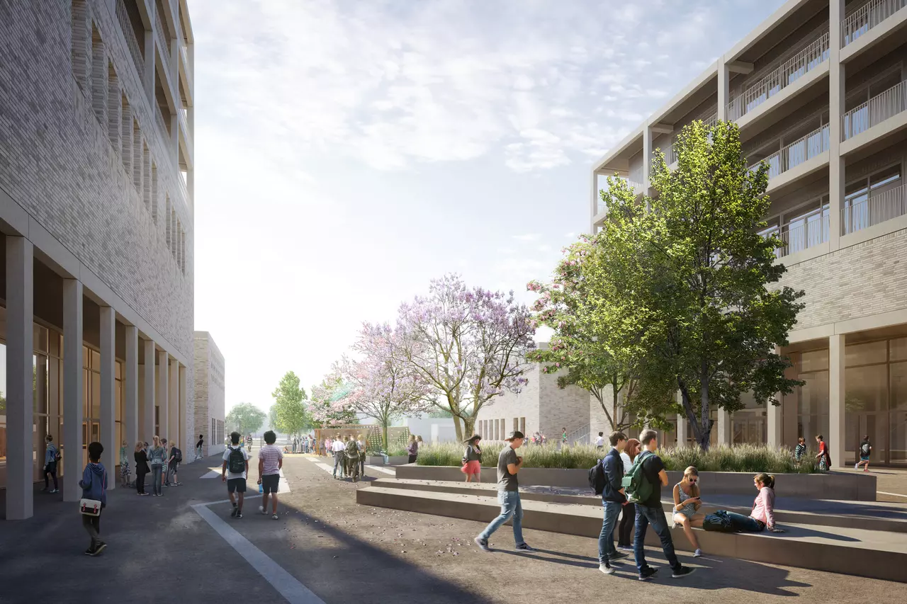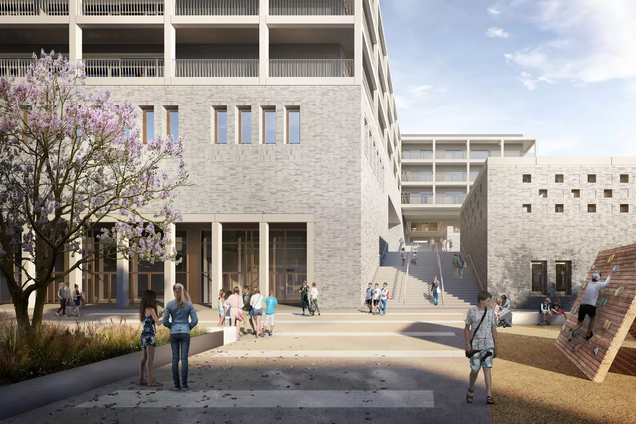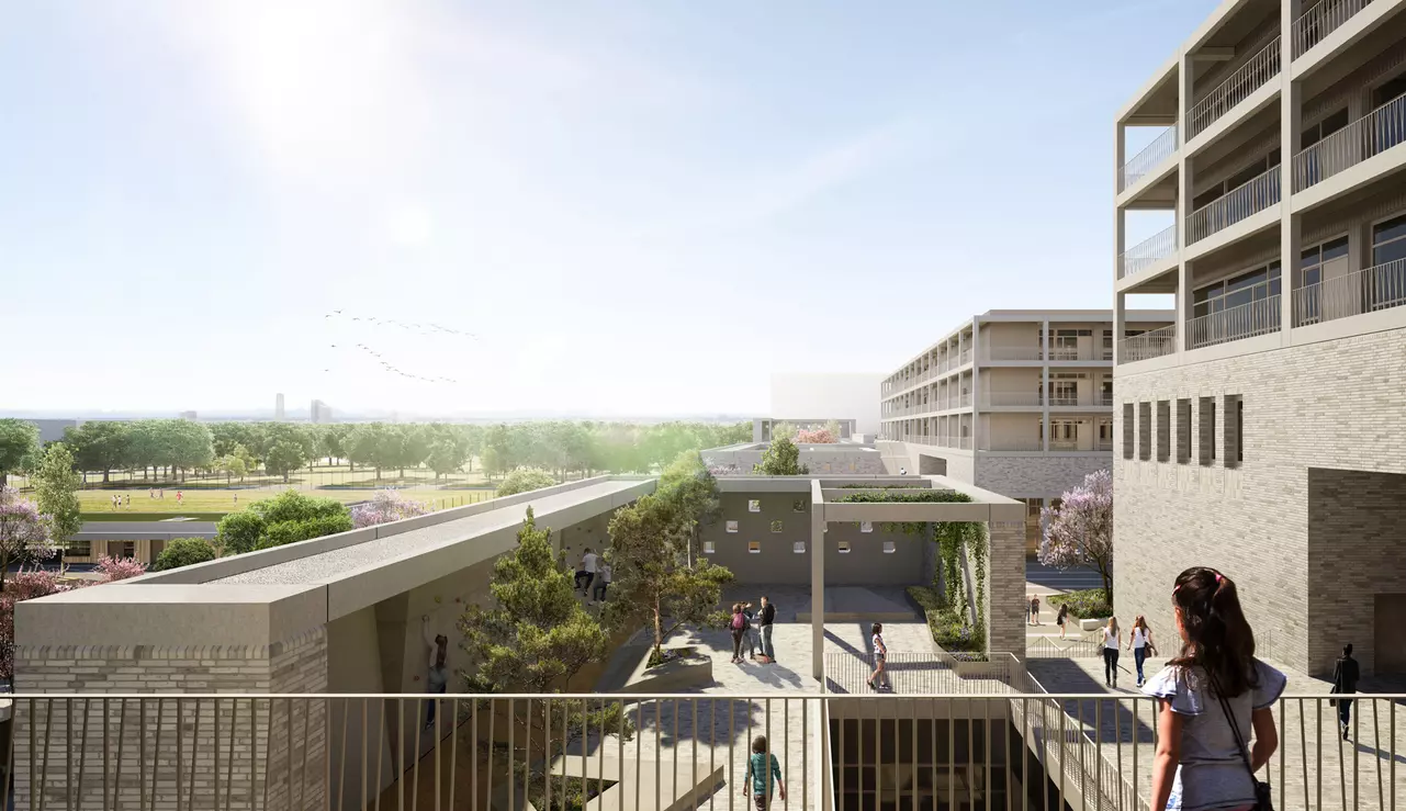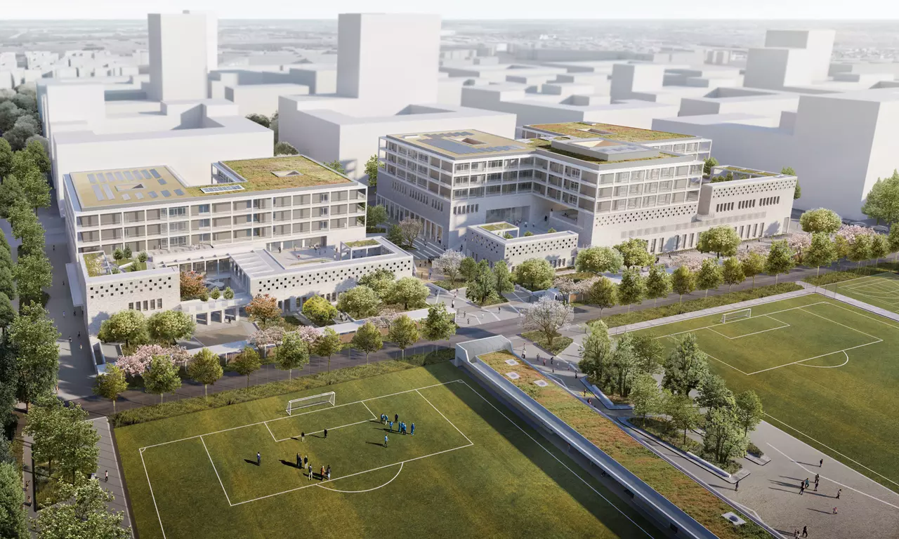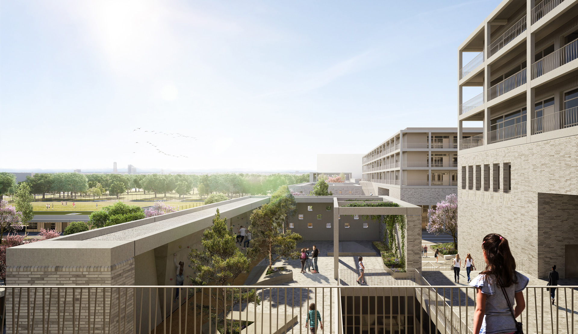 Nach dem städtebaulichen Masterplan von Max Dudler und Hilmer & Sattler und Albrecht entspricht die Größe der beiden Schulgrundstücke exakt der Größe der Blockrandstruktur des neuen Quartiers. Die erforderlichen Bauvolumina der beiden Schulen füllen die jeweiligen Grundstücke vollständig aus. Dadurch ergibt sich die Chance Freiflächen auf den Dächern zu entwickeln. Die begrünten und mit unterschiedlichen Themen bespielten Pausenhöfe verteilen sich dementsprechend terrassenförmig auf mehrere Geschosse und werden über großzügige Treppenanlagen miteinander verbunden.